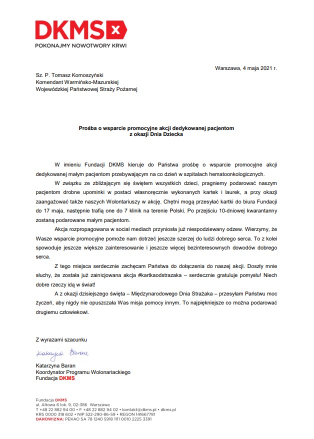 Z okazji zbliżającego się Dnia Dziecka , Fundacja DKMS zorganizowała akcję na rzecz małych pacjentów przebywających na co dzień w szpitalach hematoonkologicznych. Akcja polega na własnoręcznym wykonaniu kartek i laurek, które zostaną podarowane chorym dzieciom. Zachęcamy do przesyłania kartek na adres: Fundacja DKMS ul. Altowa 6 lok. 9, 02-386 Warszawa.