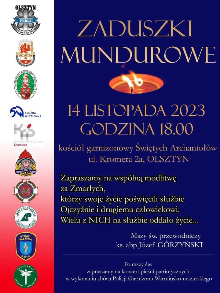 W tym samym dniu to jest 14 listopada 2023 roku o godzinie 18:00, odbędą się Zaduszki Mundurowe – Msza Święta w Kościele NMP Królowej Polski przy ul. Kromera 2a w Olsztynie pod przewodnictwem abp. Józefa Górzyńskiego, Metropolity Warmińskiego.