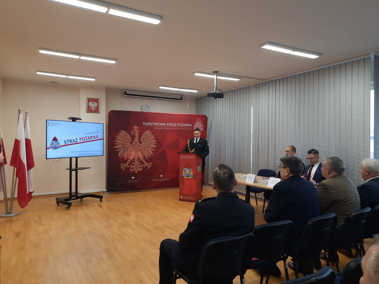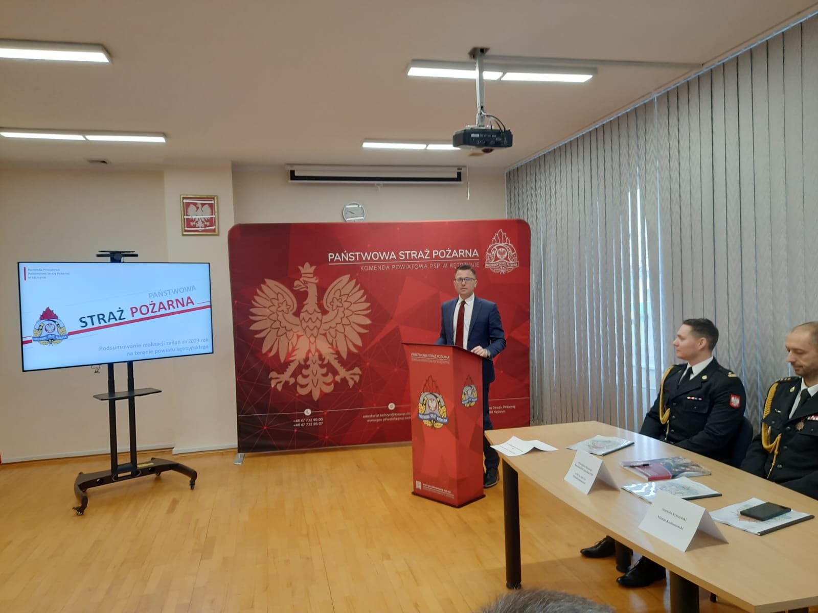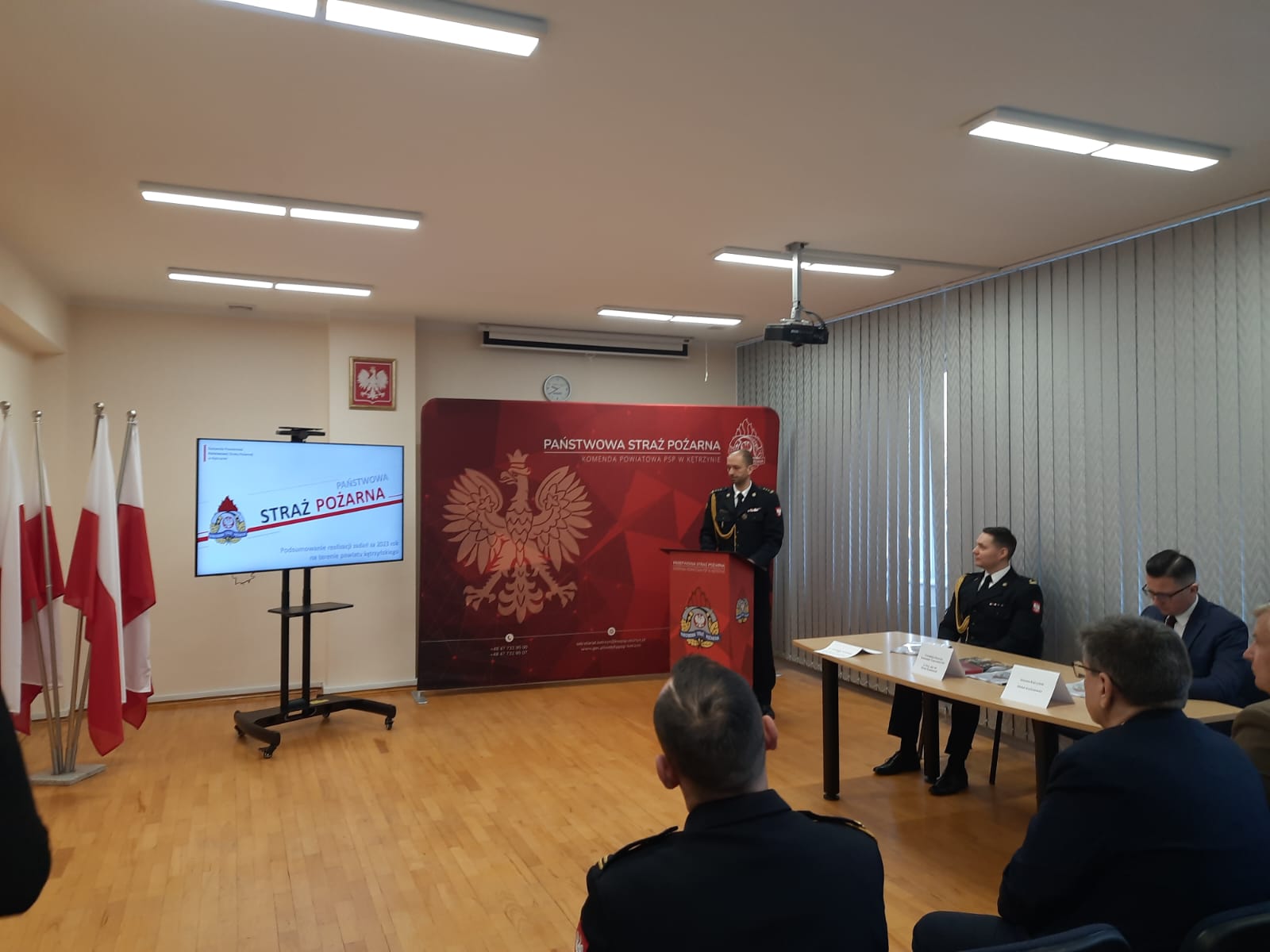 Narada rozpoczęła się od złożenia meldunku Komendantowi Wojewódzkiemu PSP, a następnie głos zabrał mł. bryg. Kamili Golon p. o. Komendanta Powiatowego PSP w Kętrzynie, który przywitał zaproszonych gości i przedstawił prezentację całorocznej działalności kętrzyńskiej Komendy Powiatowej PSP wraz z planami na rok 2024.