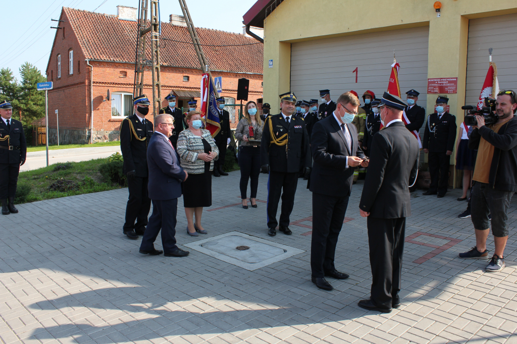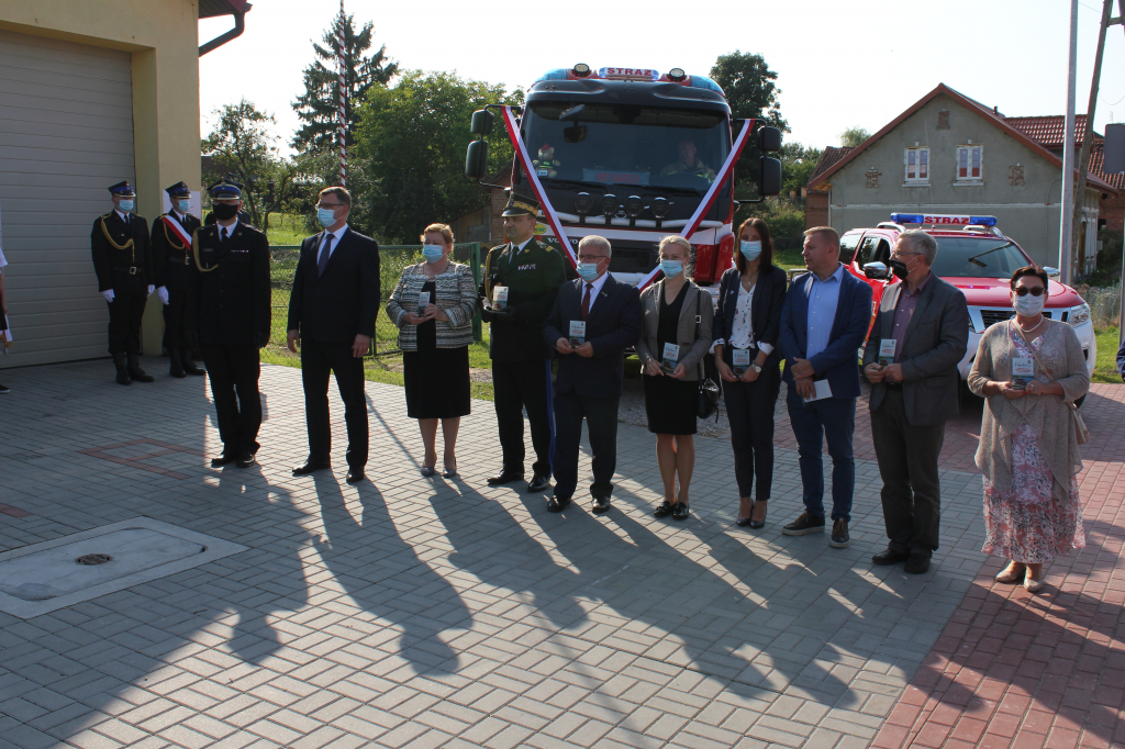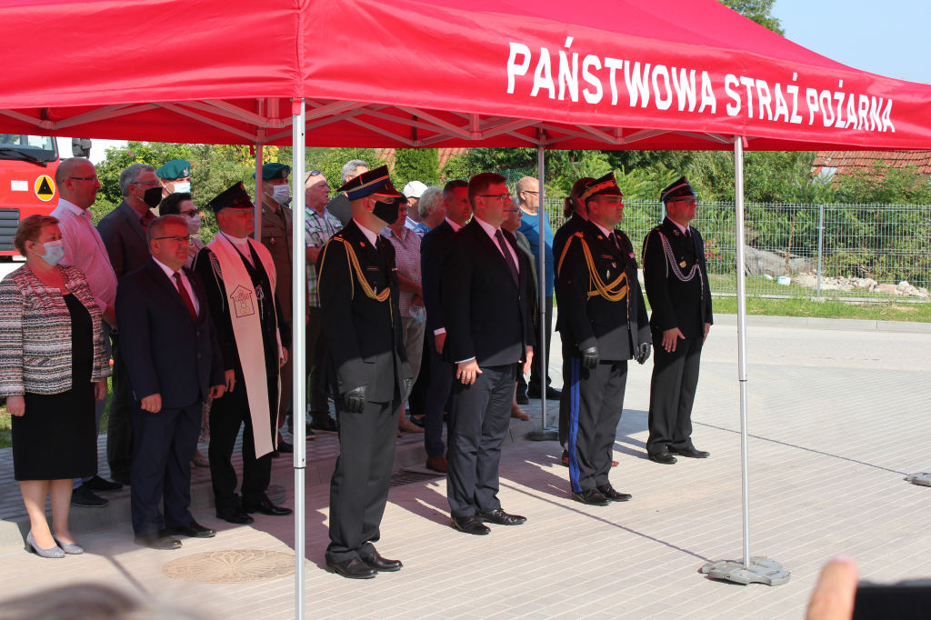 oraz przedstawiciele władz samorządów powiatu węgorzewskiego oraz pozostali goście. Nowy wóz strażacki został poświęcony przez ks. kan. mgr. Klemensa Litwina, kapelana strażaków powiatu węgorzewskiego.