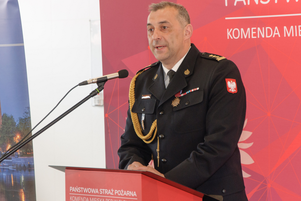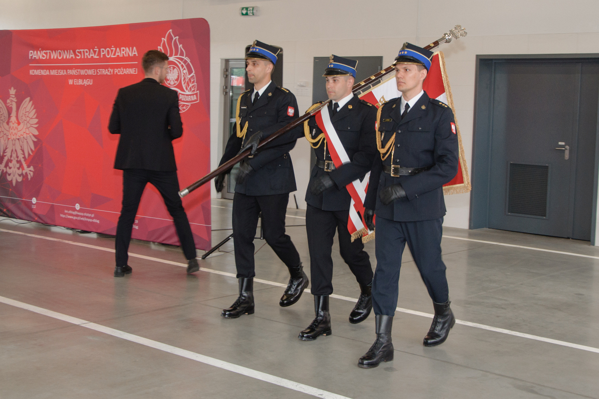 Uroczystość rozpoczęła się od złożenia meldunku st. bryg. Andrzejowi Harhajowi, Zastępcy Warmińsko – Mazurskiego Komendanta Wojewódzkiego Państwowej Straży Pożarnej. Meldunek złożył Dowódca Uroczystości, kpt. Marcin Misztal. Następnie przybyłych gości przywitał Komendant Miejski PSP w Elblągu mł. bryg Bogdan Grzymowicz.
