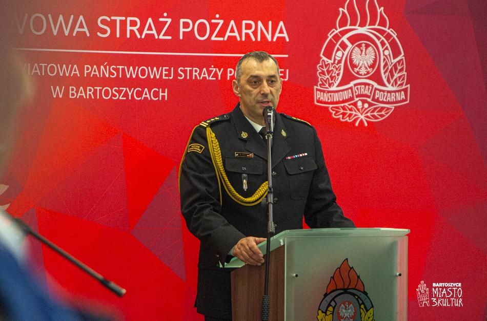 Tegoroczne obchody Dnia Strażaka były również okazją do złożenia podziękowań st. bryg. Andrzejowi Harhajowi, który do dnia 13 marca 2024 r. pełnił obowiązki Komendanta Powiatowego Państowej Straży Pożarnej w Bartoszycach.