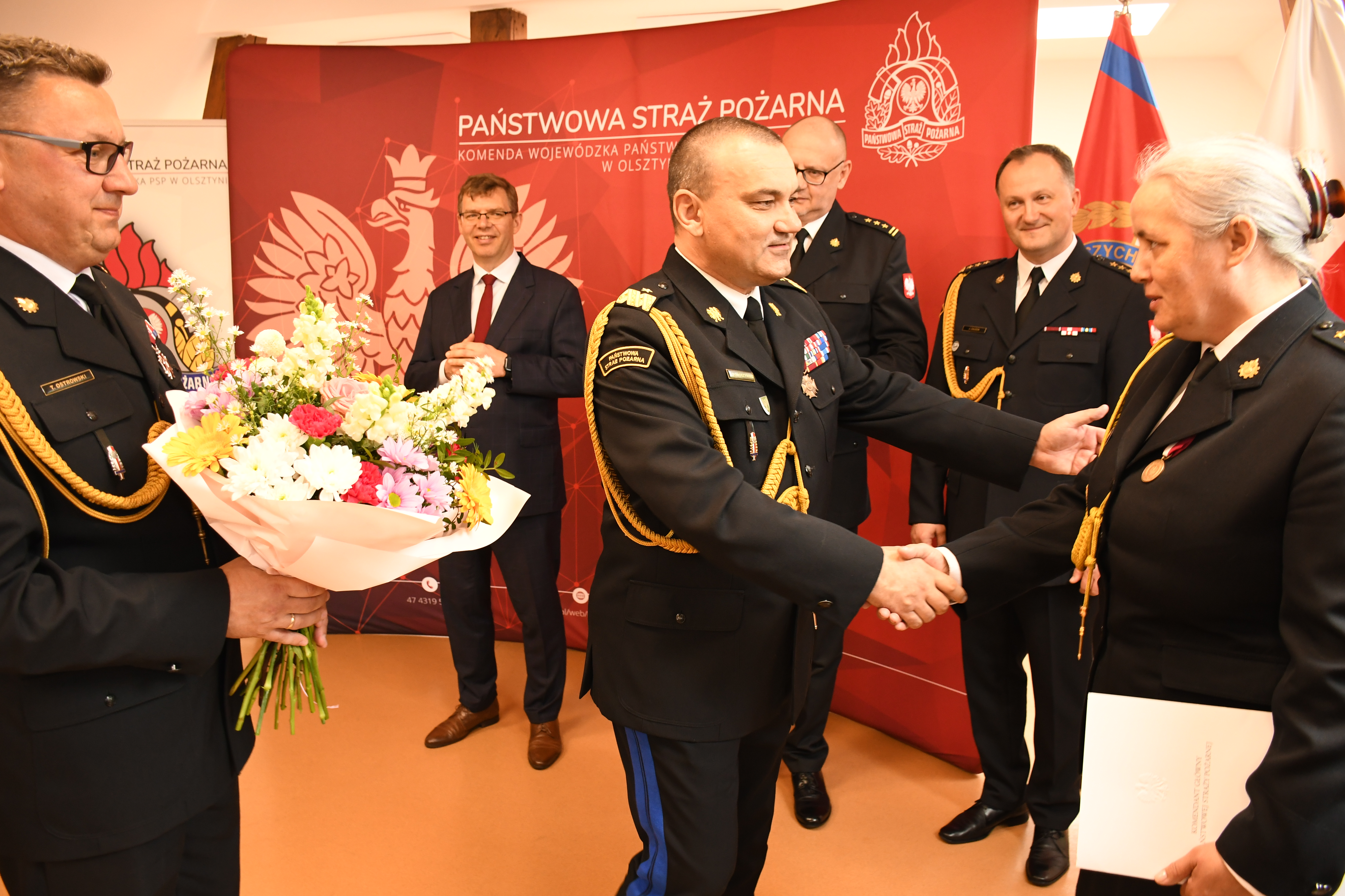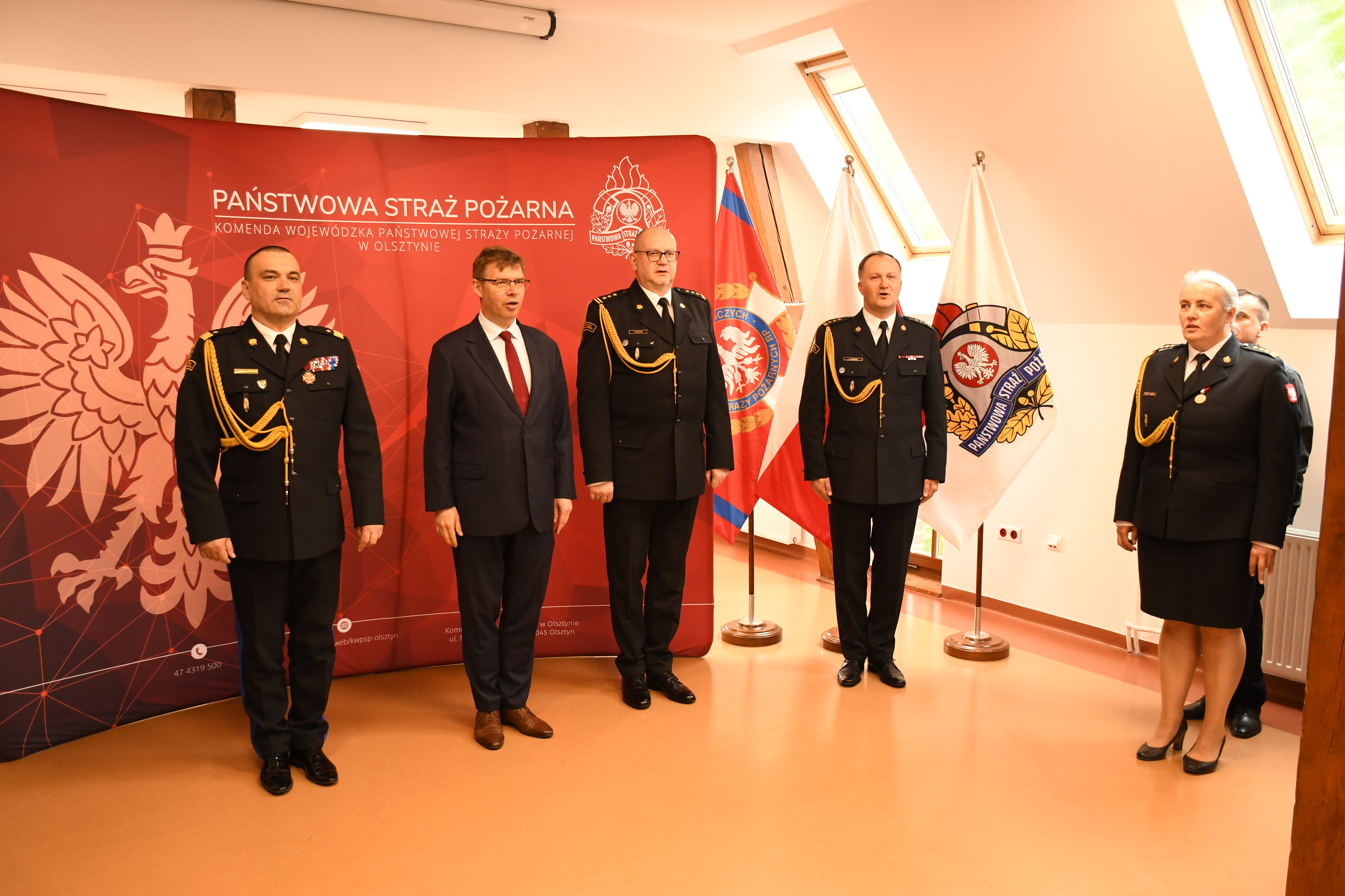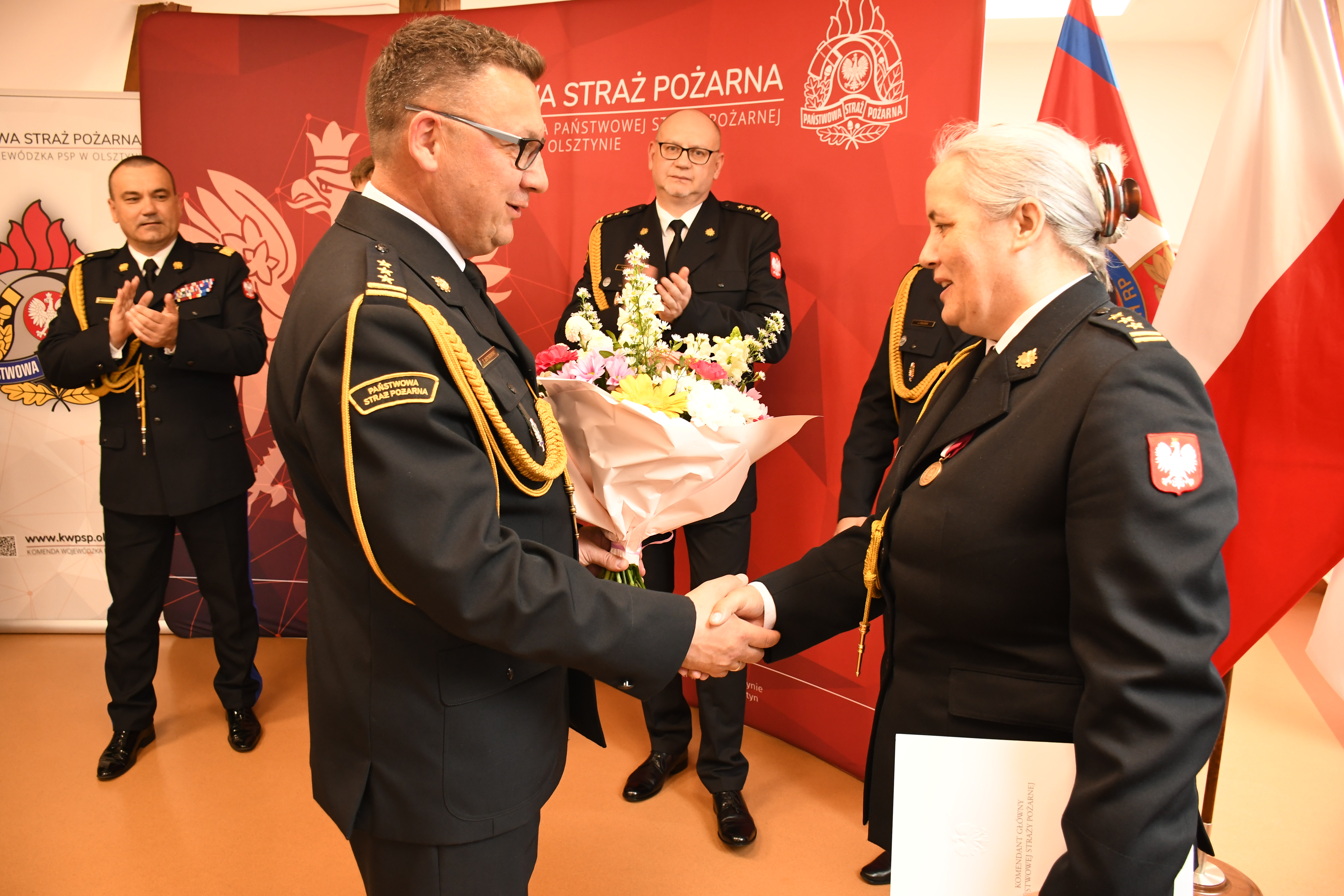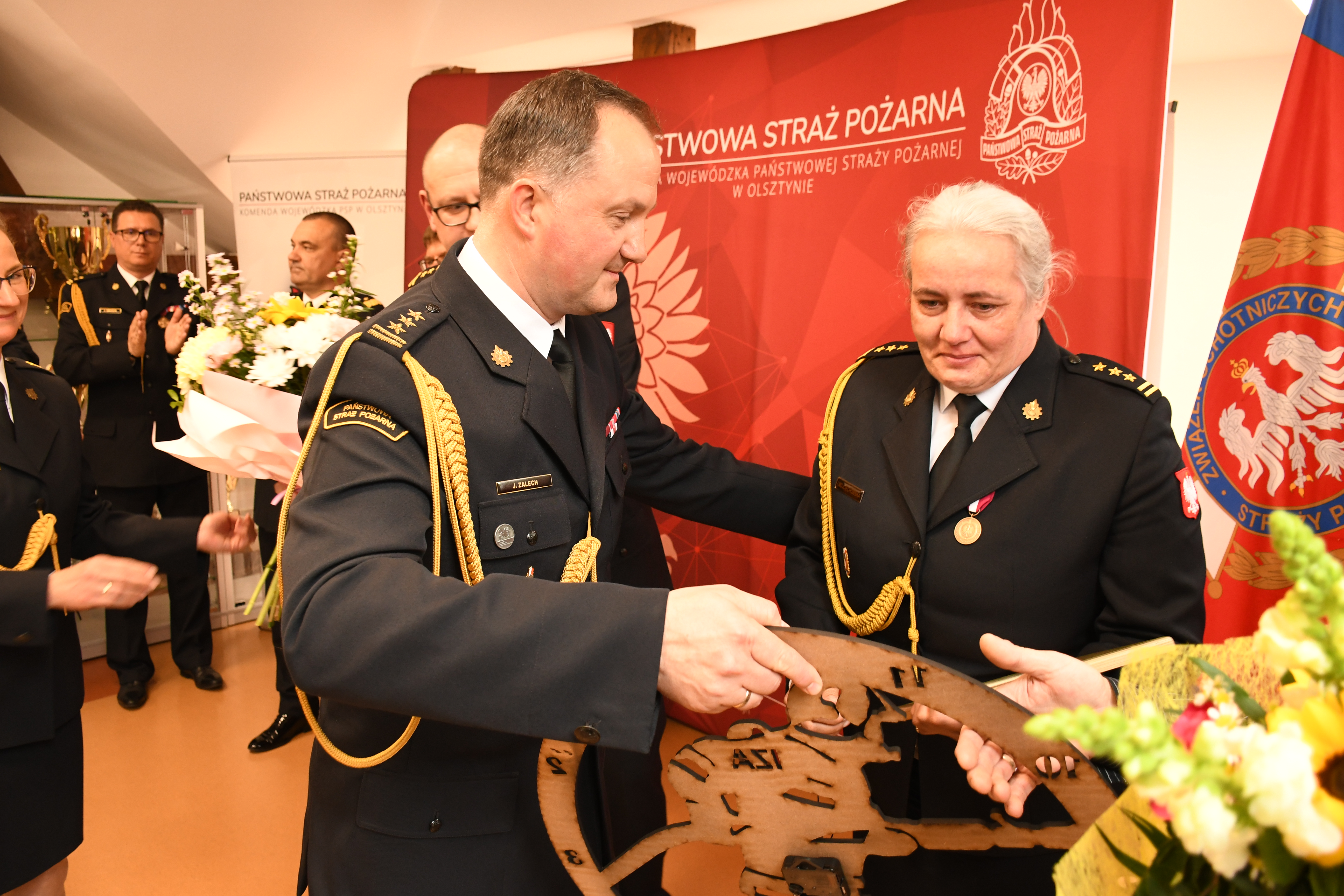 Tego dnia uroczystość miała jeszcze jeden wyjątkowy charakter. 19 maja był ostatnim dniem służby w szeregach Państwowej Straży Pożarnej st. bryg. Izabeli Wojciechowskiej – Naczelnik ośrodka szkolenia Komendy Wojewódzkiej PSP w Olsztynie, która po blisko 26-ciu latach służby przeszła na zaopatrzenie emerytalne. Warmińsko-Mazurski Komendant Wojewódzki nadbryg. Tomasz Komoszyński w imieniu własnym i załogi komendy wojewódzkiej PSP podziękował st. bryg. Izabeli Wojciechowskiej za służbę, a zwłaszcza za wkład i zaangażowanie w proces kształcenia funkcjonariuszy oraz przekazał życzenia na nową, emerytalną już drogę życia.