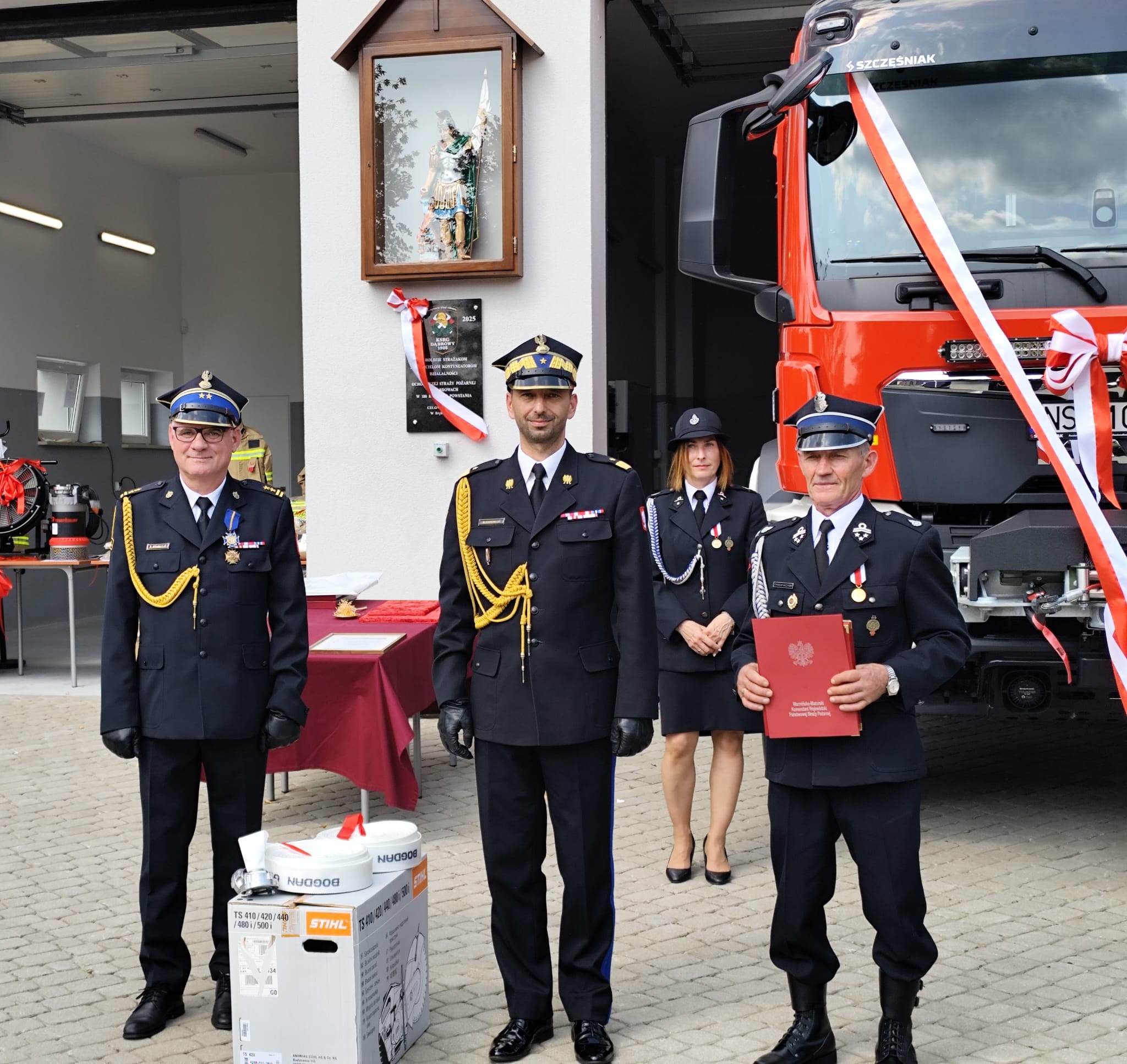 Podczas uroczystości miało również miejsce symboliczne przekazanie w użytkowanie nowo wyremontowanej remizy oraz nowego średniego samochodu ratowniczo-gaśniczego. Uroczystość wzbogaciło odsłonięcie tablicy pamiątkowej upamiętniającej 100-lecie OSP Dąbrowy, po czym remiza, pojazd oraz tablica zostały poświęcone.