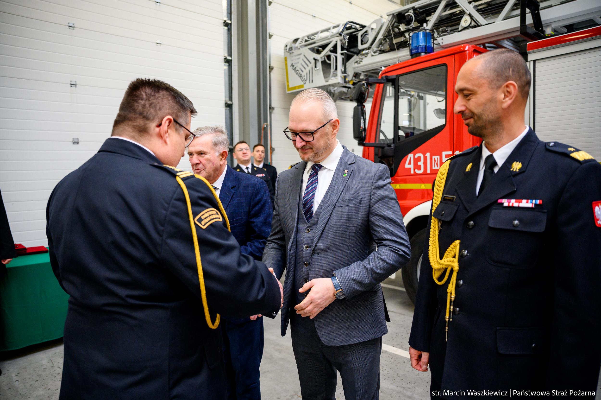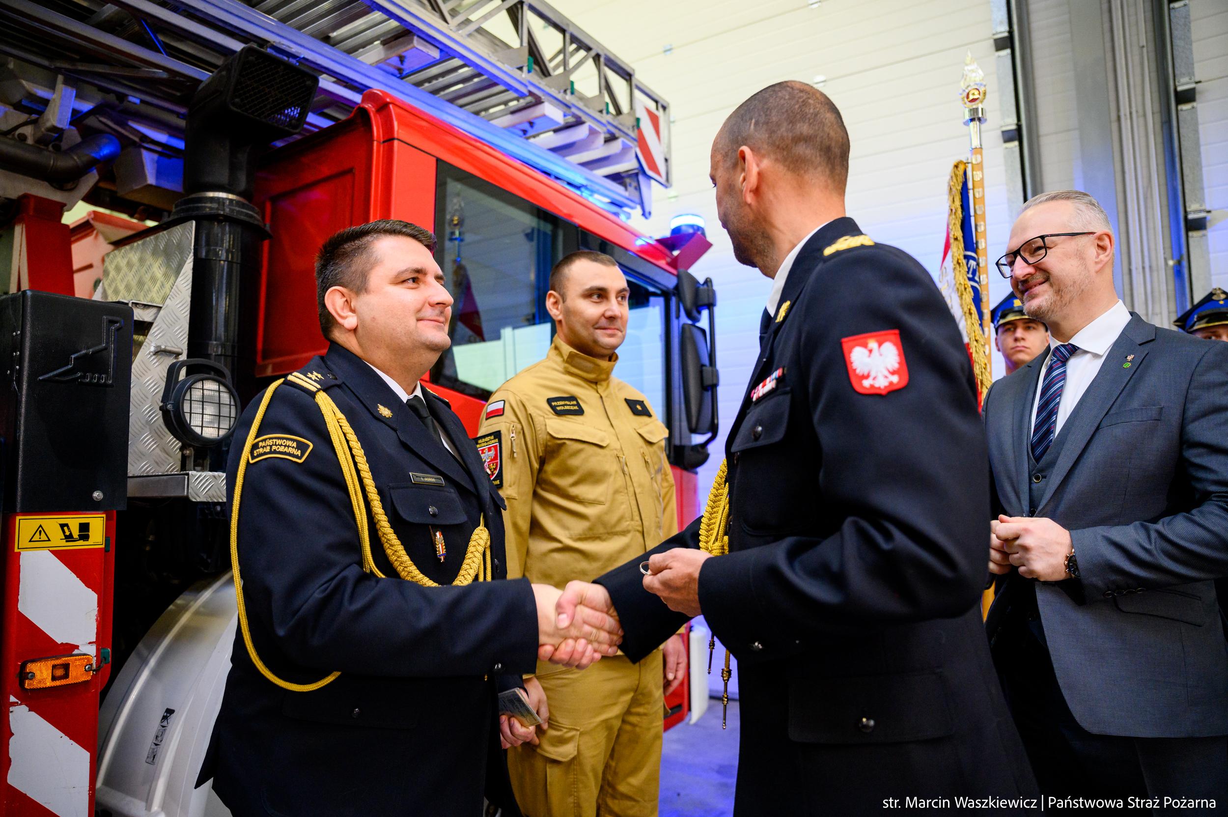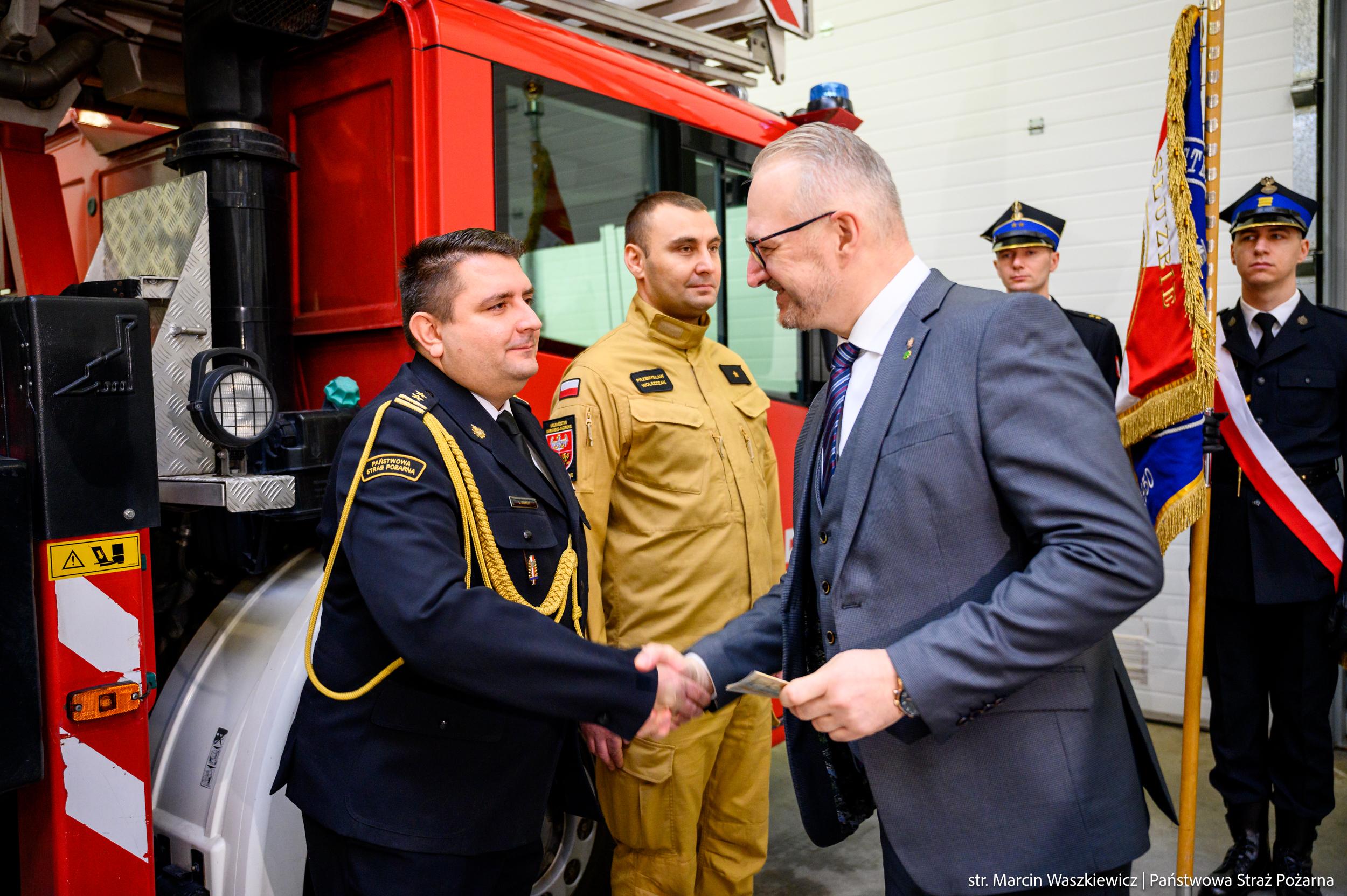 Kolejnym punktem uroczystości było oficjalne przekazanie samochodów pożarniczych. Odczytano akty przekazania, a Komendant Wojewódzki wraz z Wojewodą Warmińsko-Mazurskim i samorządowcami wręczyli pamiątkowe akty przekazania, kluczyki i dokumenty. Odebrali je st. bryg. Marek Markowski z Komendy Powiatowej PSP w Ełku, do której trafił nowy samochód specjalny drabina mechaniczna o wysięgu 42 metrów oraz bryg. Łukasz Jasiński olsztyński Komendant Miejski PSP, który odebrał samochód specjalny podnośnik hydrauliczny o wysięgu 37 metrów, przekazany z zasobów Komendy Miejskiej Miasta Stołecznego Warszawy Państwowej Straży Pożarnej.