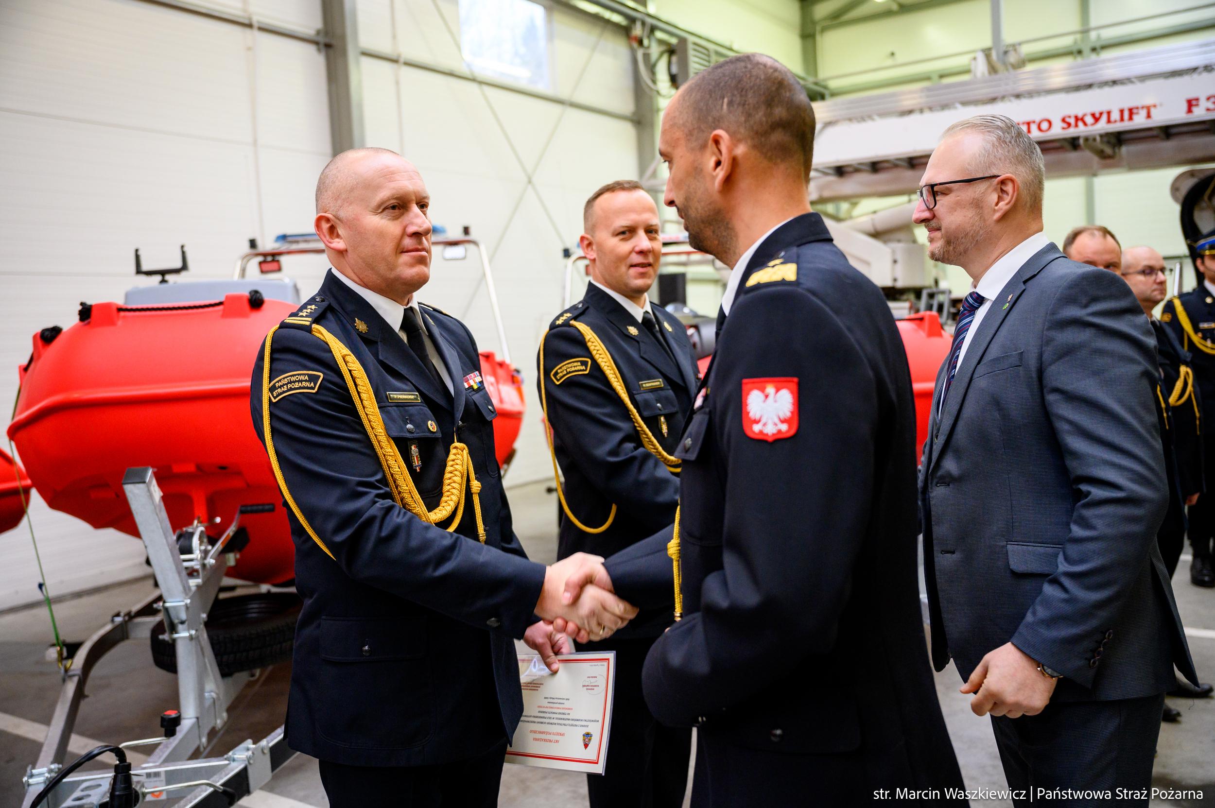 Następnie odbyło się przekazanie sześciu łodzi ratowniczych. Cztery nowe łodzie ratownicze, które trafiły do Komend Powiatowych PSP w Nidzicy, Węgorzewie, Piszu i Komendy Miejskiej PSP w Elblągu, odebrali Komendanci PSP z tych komend.