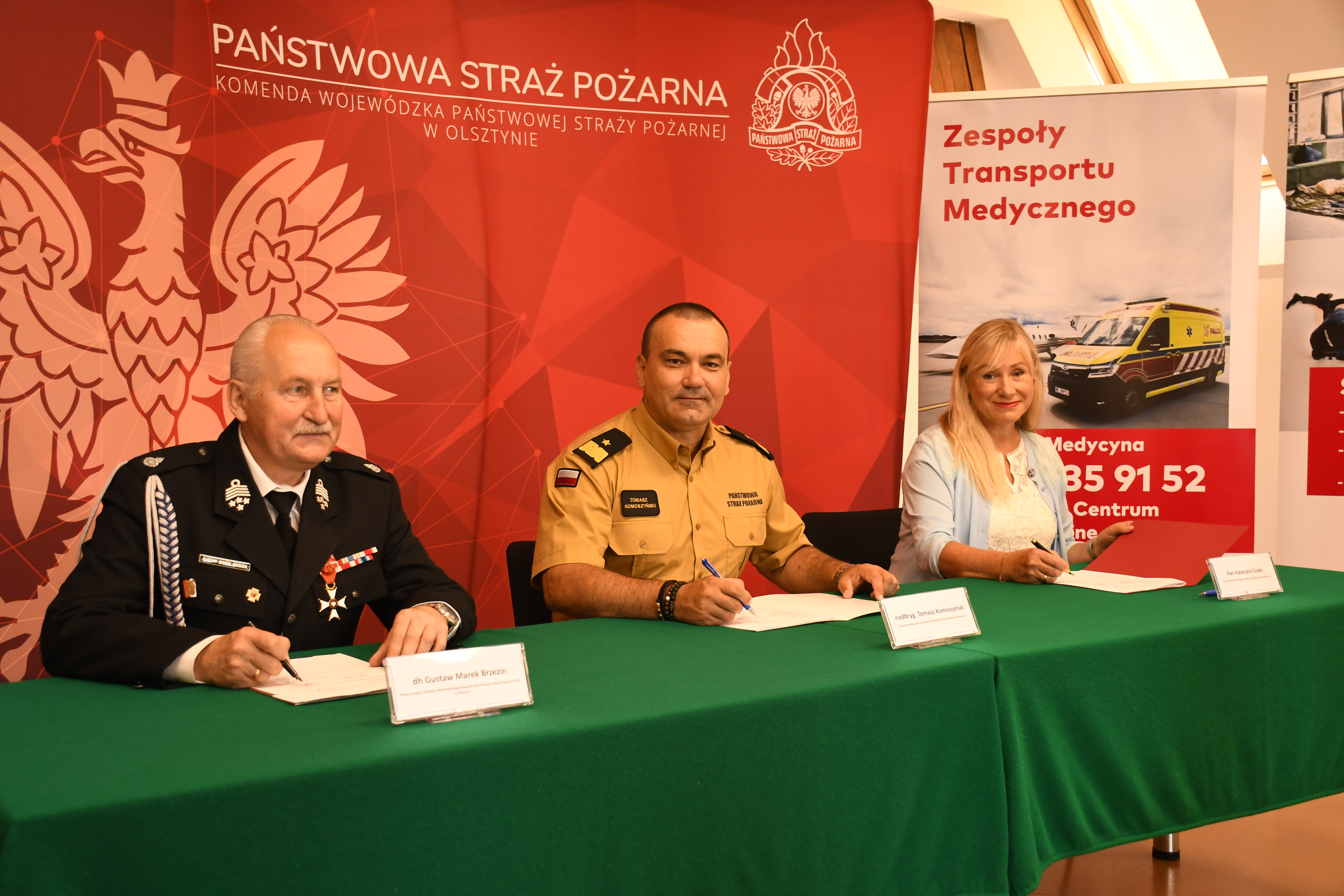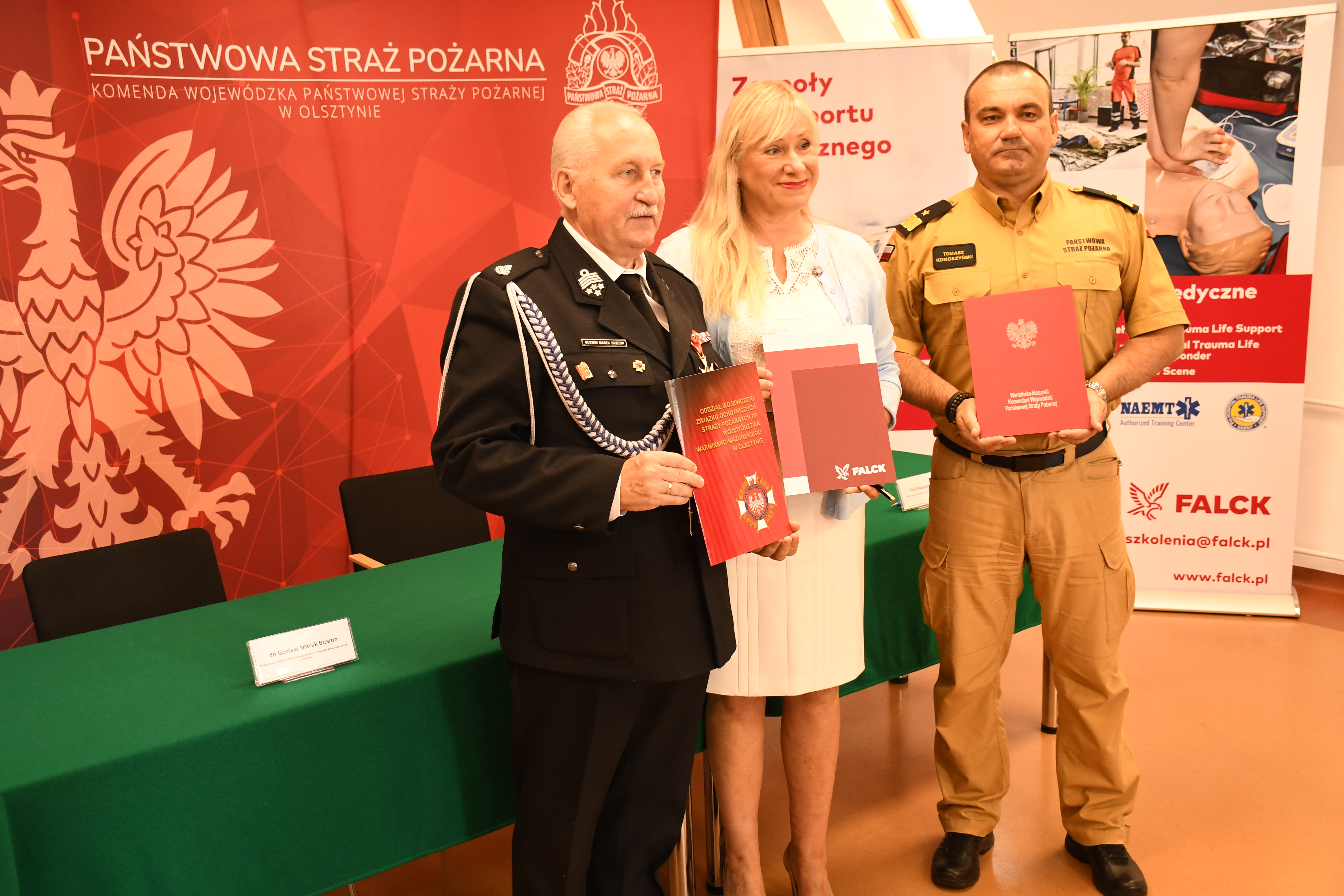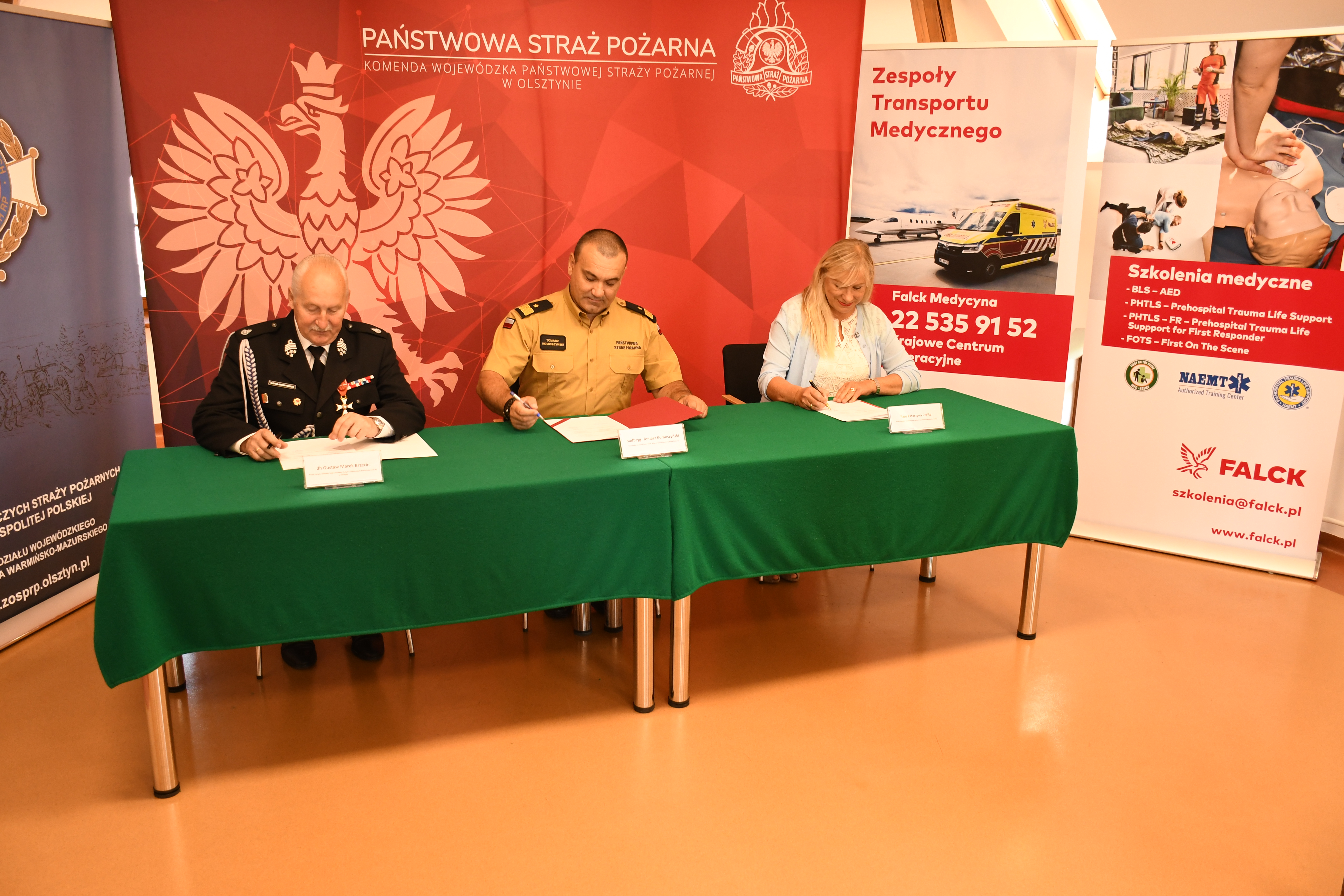 W poniedziałek 19 czerwca podpisano trójstronne porozumienie pomiędzy Komendą Wojewódzką Państwowej Straży Pożarnej w Olsztynie, Oddziałem Wojewódzkim Związku Ochotniczych Straży Pożarnych Rzeczypospolitej Polskiej i Falck Medycyna. Dokumenty w siedzibie olsztyńskiej Komendy Wojewódzkiej PSP parafowali: nadbryg. Tomasz Komoszyński Warmińsko-Mazurski Komendant Wojewódzki PSP, dh Gustaw Marek Brzezin Prezes Zarządu Oddziału Wojewódzkiego ZOSP RP i Pani Katarzyna Czajka Prezes Zarządu Falck Medycyna.