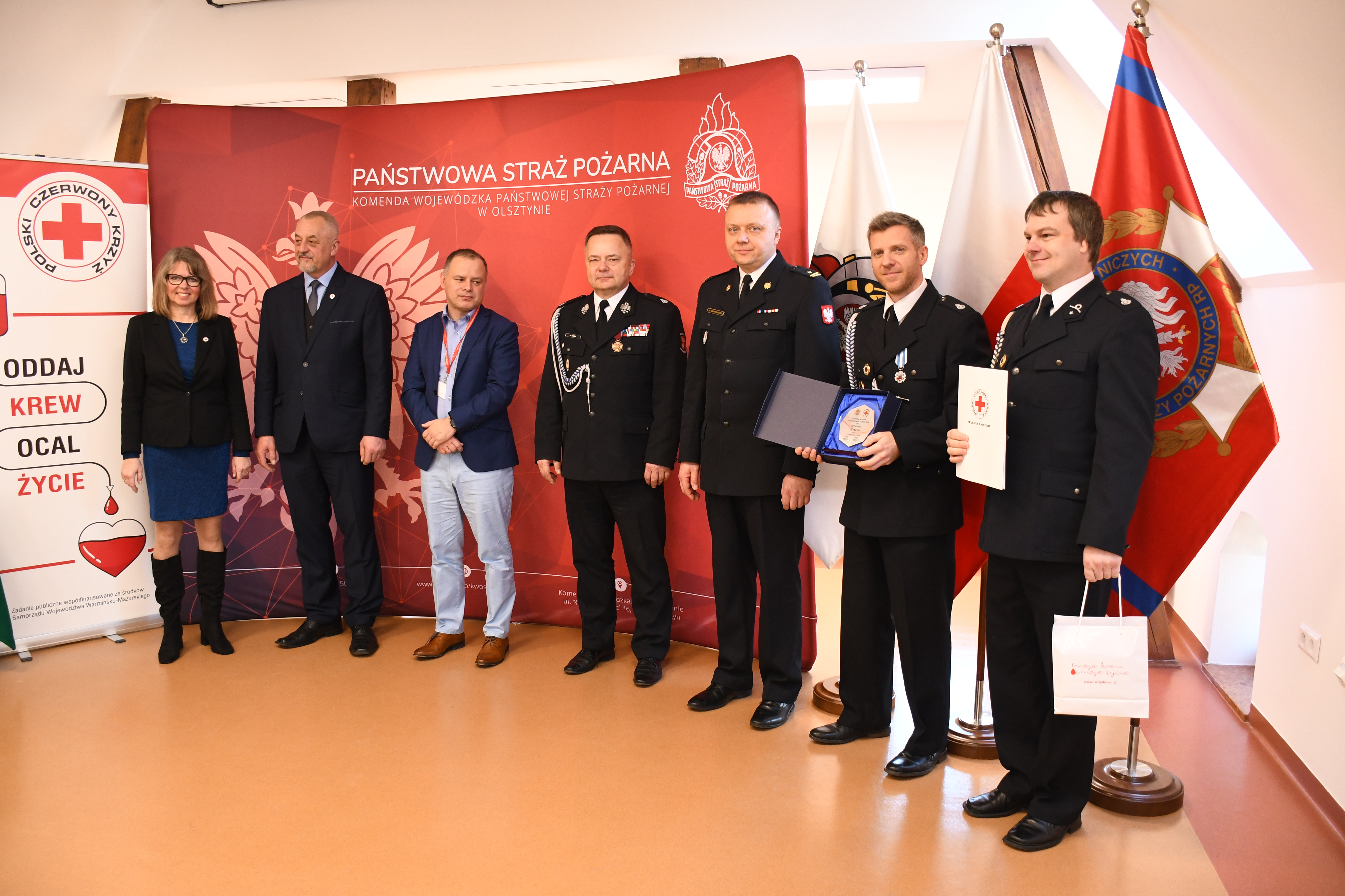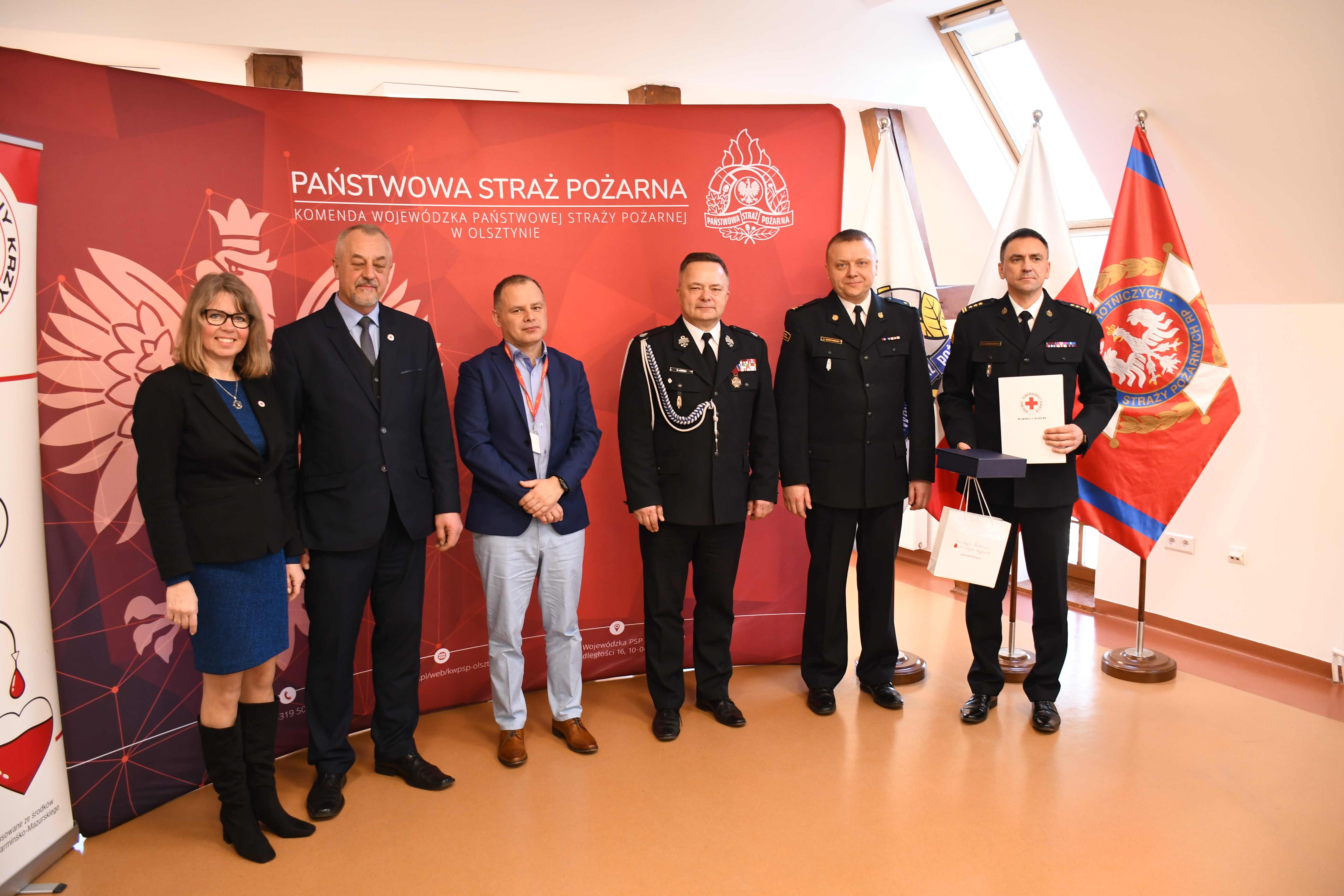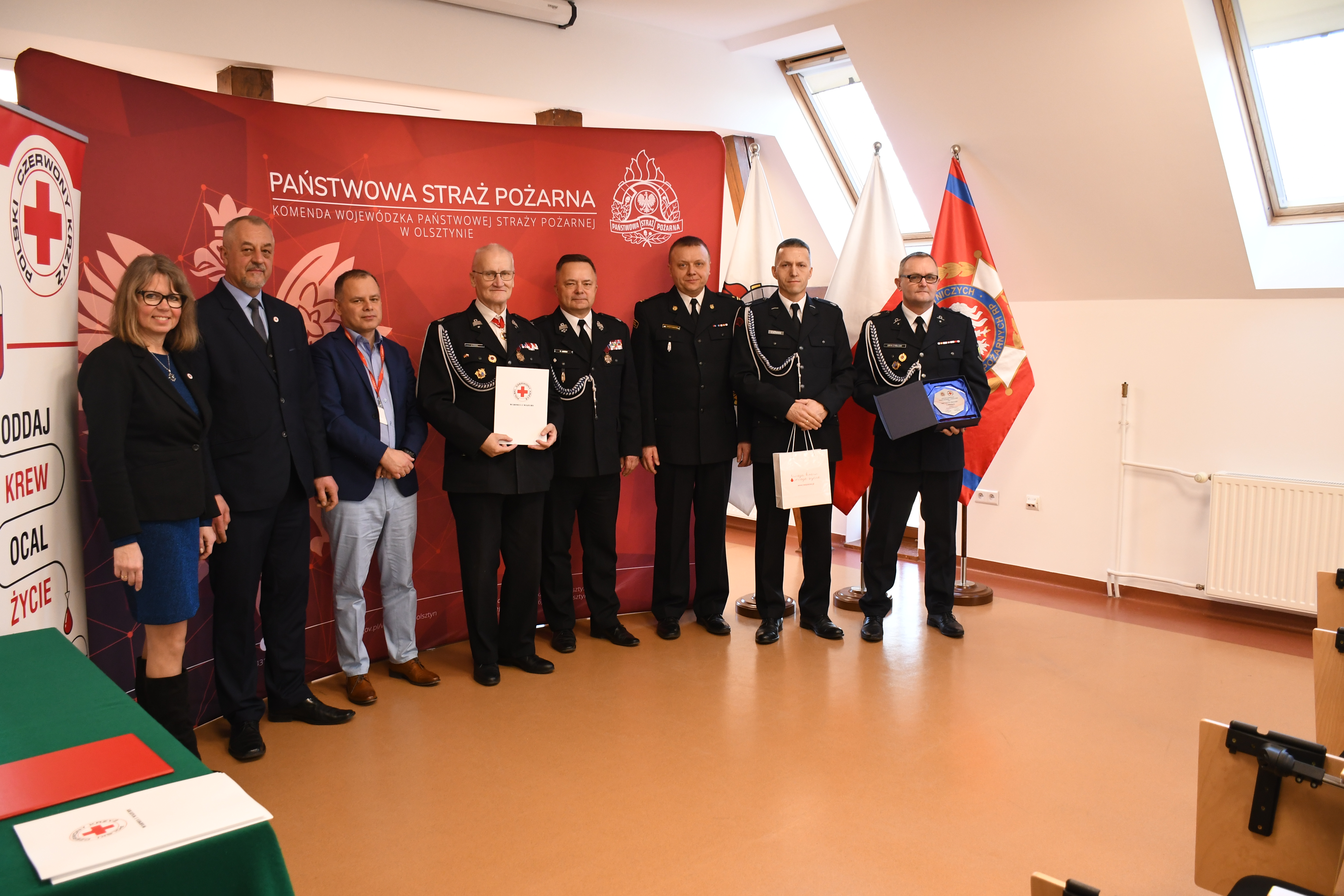Prezes Warmińsko-Mazurskiego Oddziału Okręgowego PCK Zbigniew Kłodowski wraz z Dorotą d’Aystetten Dyrektor Okręgową PCK oraz Dyrektorem ZOW ZOSP RP dh. Maciejem Jasińskim wręczyli okolicznościowe statuetki i dyplomy jednostkom Państwowej Straży Pożarnej i Ochotniczych Straży Pożarnych woj. warmińsko-mazurskiego. Dh Piotr Mysikonis z OSP Kieźliny za oddanie łącznie 18 litrów krwi otrzymał odznakę „Zasłużonego Honorowego Dawcy Krwi”. W imieniu Warmińsko-Mazurskiego Komendanta Wojewódzkiego PSP wyrazy uznania Zarządowi Warmińsko-Mazurskiego Oddziału PCK za organizację akcji, a strażakom PSP i OSP za wkład i zaangażowanie przekazał mł. bryg. Andrzej Greifenberg, p.o. naczelnika wydziału organizacji i nadzoru.