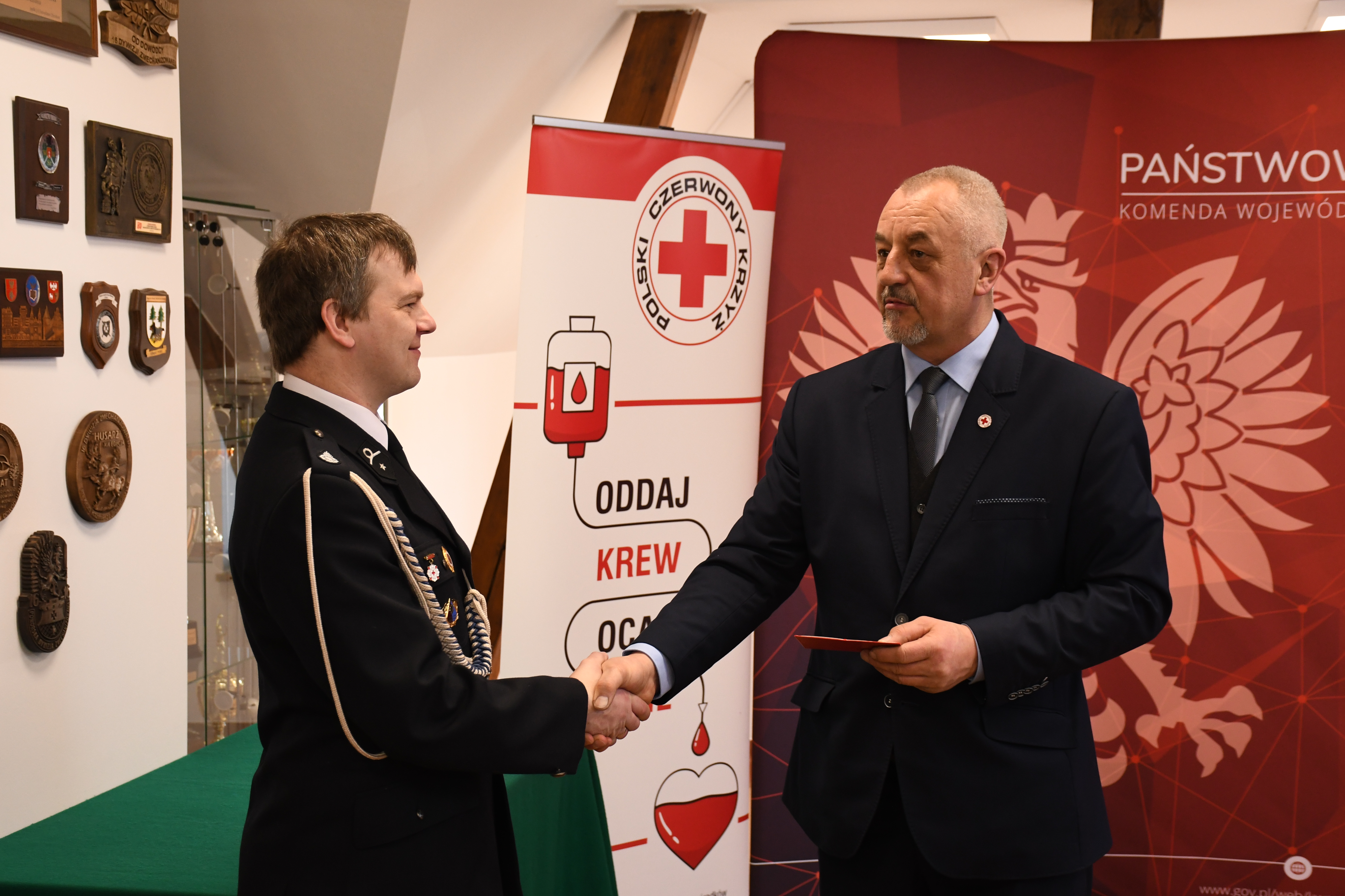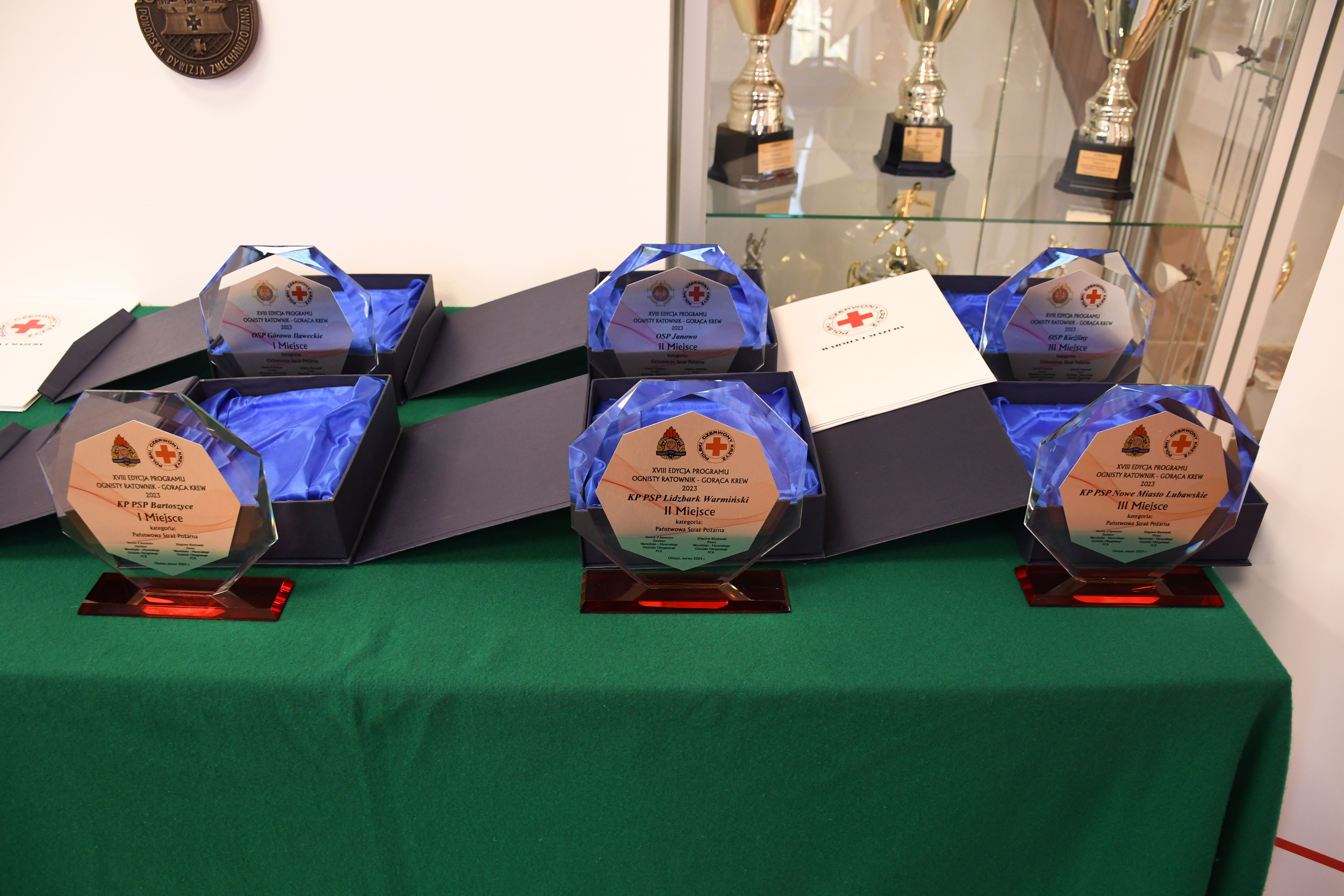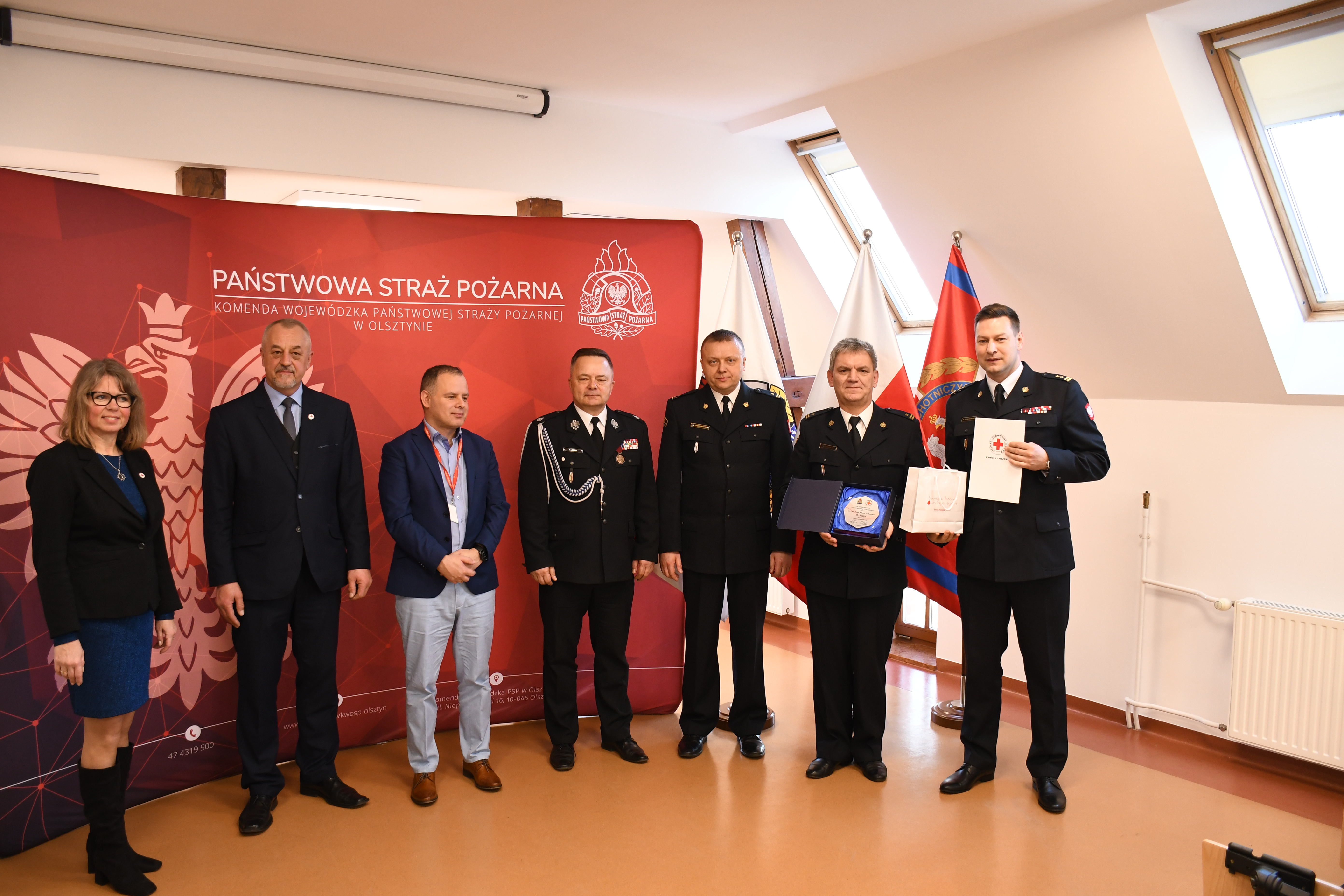 Prezes Warmińsko-Mazurskiego Oddziału Okręgowego PCK Zbigniew Kłodowski wraz z Dorotą d’Aystetten Dyrektor Okręgową PCK oraz Dyrektorem ZOW ZOSP RP dh. Maciejem Jasińskim wręczyli okolicznościowe statuetki i dyplomy jednostkom Państwowej Straży Pożarnej i Ochotniczych Straży Pożarnych woj. warmińsko-mazurskiego. Dh Piotr Mysikonis z OSP Kieźliny za oddanie łącznie 18 litrów krwi otrzymał odznakę „Zasłużonego Honorowego Dawcy Krwi”. W imieniu Warmińsko-Mazurskiego Komendanta Wojewódzkiego PSP wyrazy uznania Zarządowi Warmińsko-Mazurskiego Oddziału PCK za organizację akcji, a strażakom PSP i OSP za wkład i zaangażowanie przekazał mł. bryg. Andrzej Greifenberg, p.o. naczelnika wydziału organizacji i nadzoru.