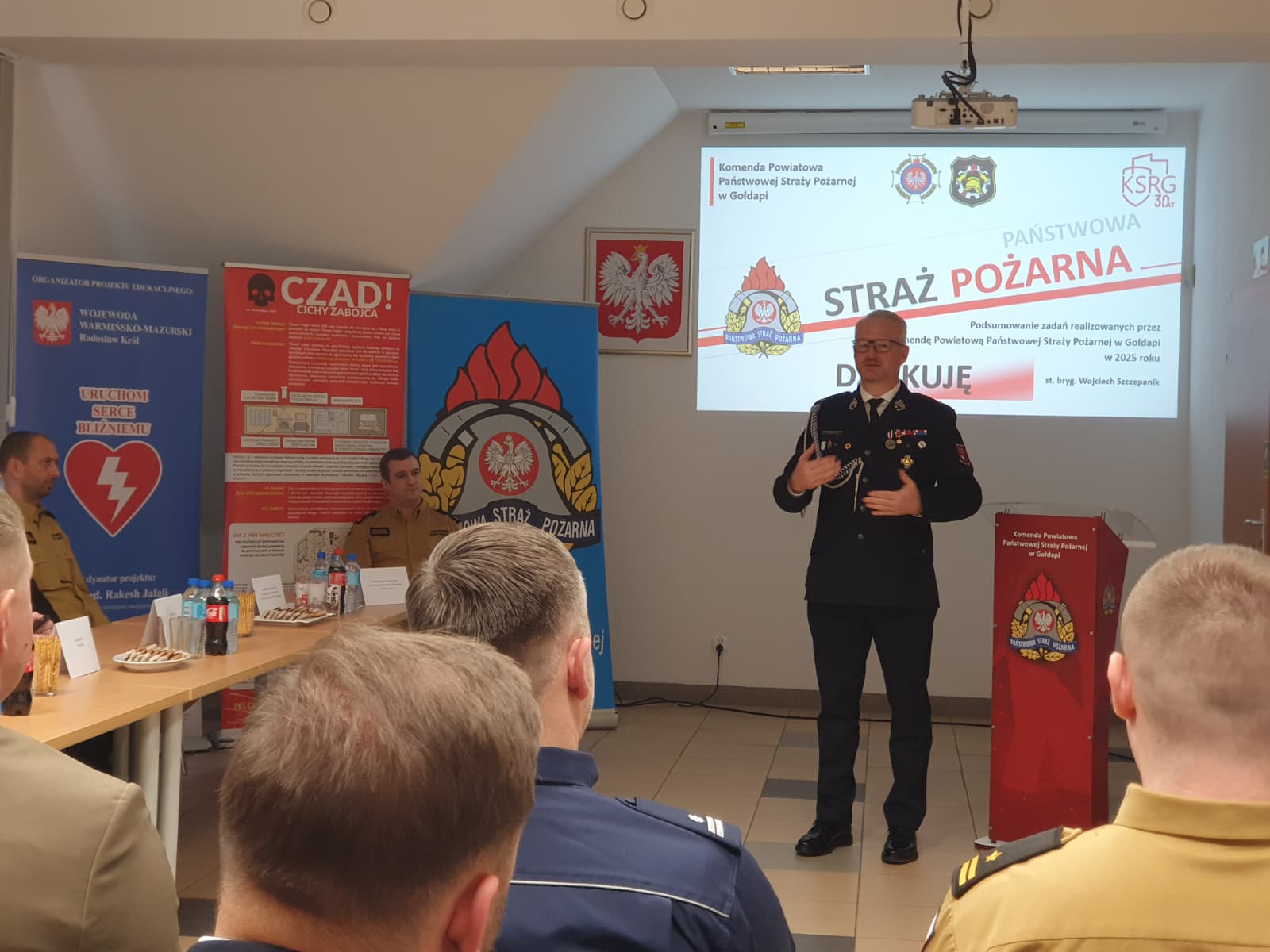 11 lutego 2026 roku w siedzibie Komendy Powiatowej Państwowej Straży Pożarnej w Gołdapi odbyła się narada podsumowująca działalność z zakresu ochrony przeciwpożarowej w powiecie gołdapskim w roku 2025. W spotkaniu udział wzięli funkcjonariusze i pracownicy cywilni komendy oraz zaproszeni goście, a wśród nich m.in.: