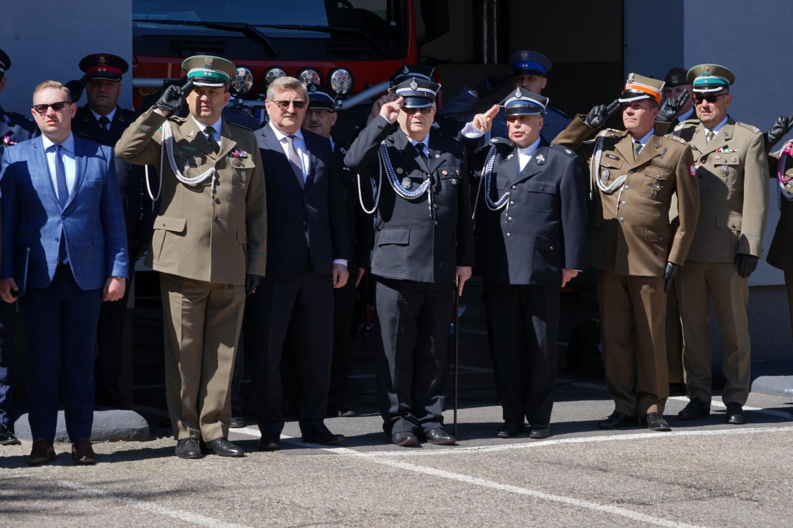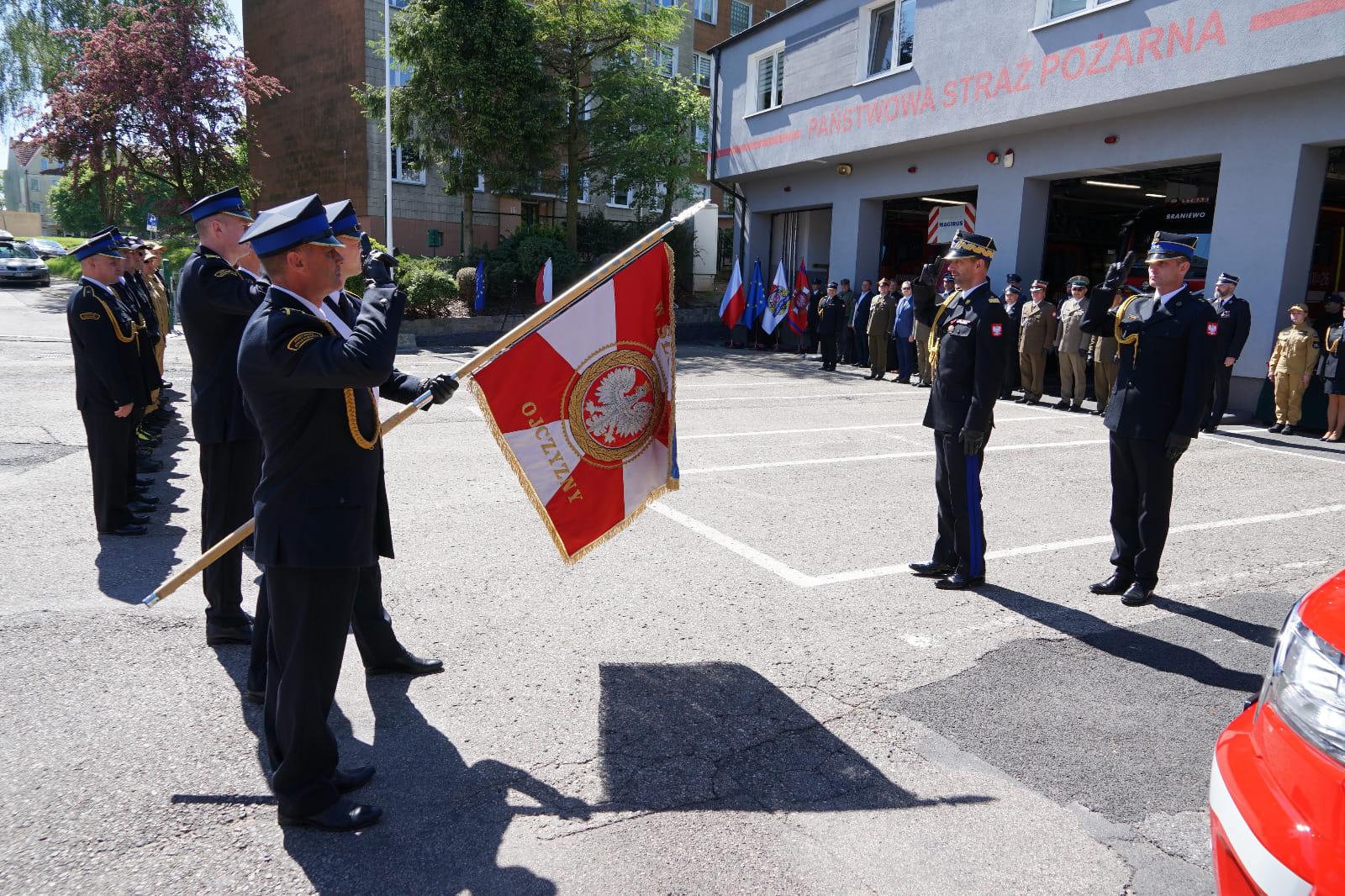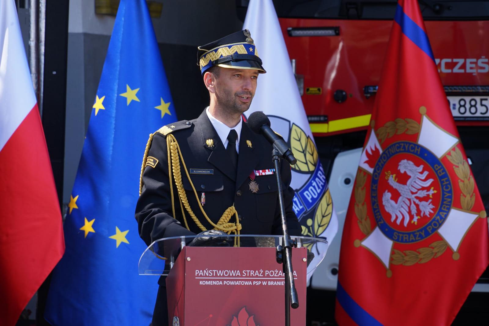Następnie na maszt została wciągnięta flaga państwowa i odegrany został „Mazurek Dąbrowskiego”. Jako pierwszy głos zabrał Komendant Powiatowy PSP w Braniewie st. bryg. Ireneusz Ścibiorek, który powitał przybyłych gości i zreferował działalność braniewskich strażaków.