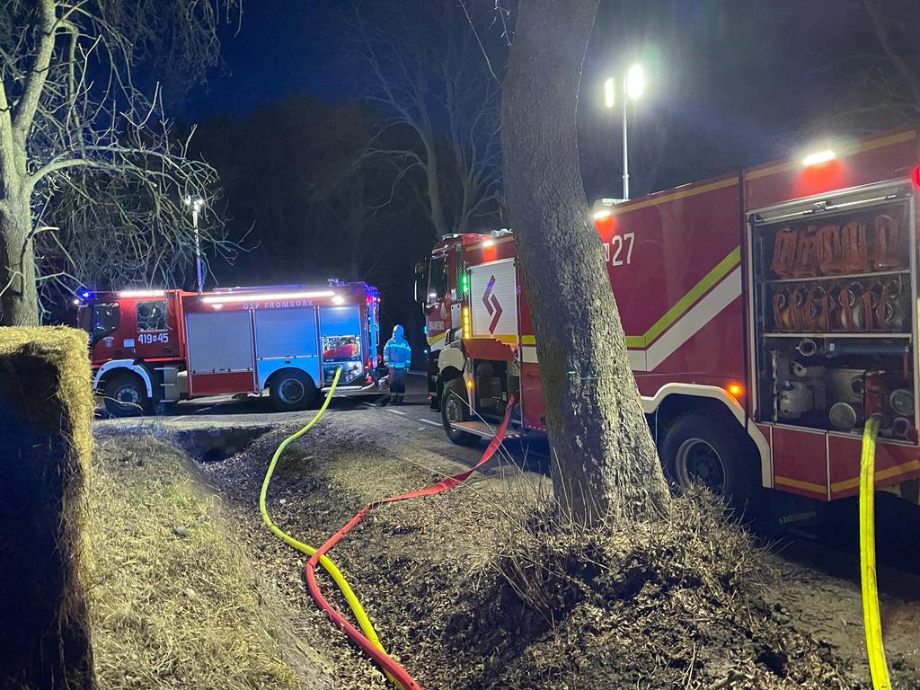 W poniedziałek 6 marca około godziny dziewiętnastej braniewscy strażacy otrzymali zgłoszenie o pożarze składowiska kostek słomy zgromadzonych w pobliżu kotłowni we Fromborku. W działaniach gaśniczych przez całą noc udział brało 10 zastępów pożarniczych między innymi z Komendy Powiatowej Państwowej Straży Pożarnej w Braniewie, Wojskowej Straży Pożarnej i okolicznych jednostek OSP. Akcją dowodził braniewski Komendant Powiatowy PSP. Pryzma sprasowanych kostek słomy liczyła około 800 sztuk – 500 ton. Akcja gaśnicza trwa nadal już dziewiętnastą godzinę. Obecnie strażacy, pomimo utrudniającego działania gaśnicze silnego wiatru, od kilku godzin mają pożar pod kontrolą. Trwa żmudny proces rozwożenia przy pomocy ładowarek kołowych balotów z pryzmy i przelewaniu ich wodą. Strażacy pracują w systemie rotacyjnym, a ciągłość podawania wody na pożar jest utrzymywana. Strażacy przewidują, że działania gaśnicze potrwają do godzin wieczornych.