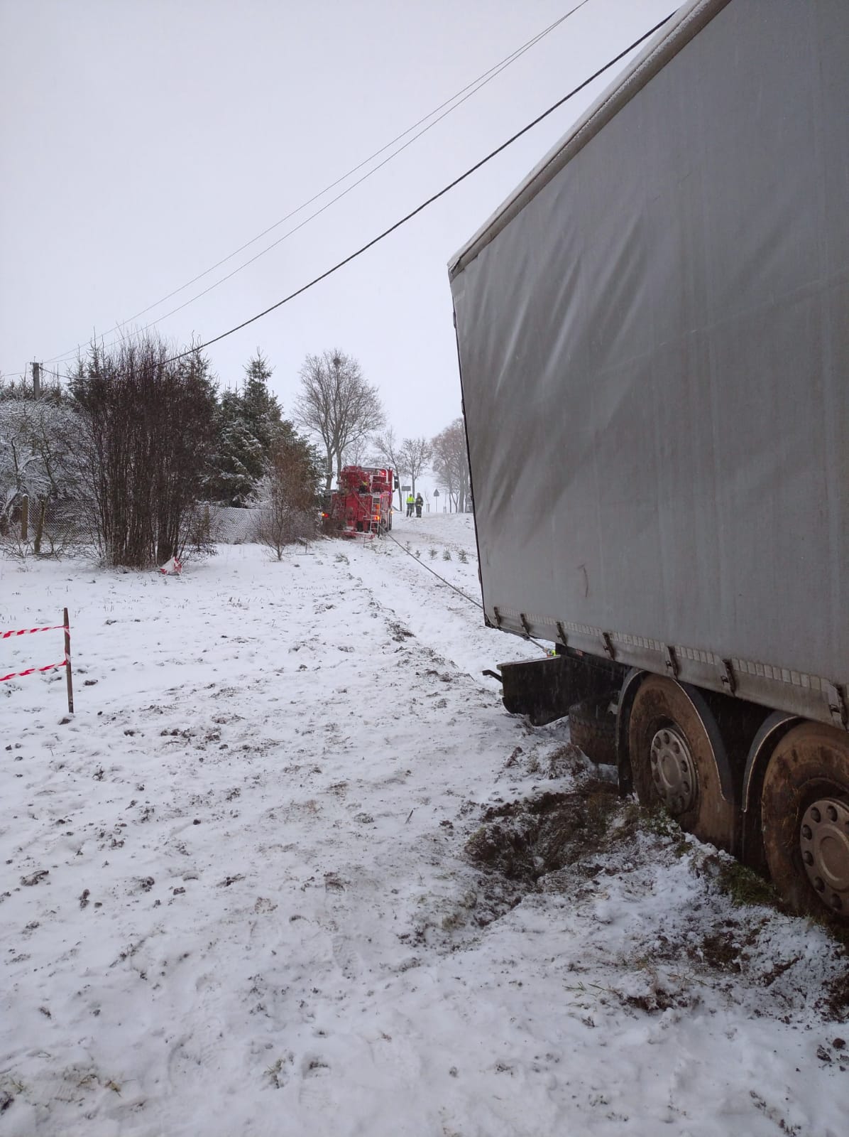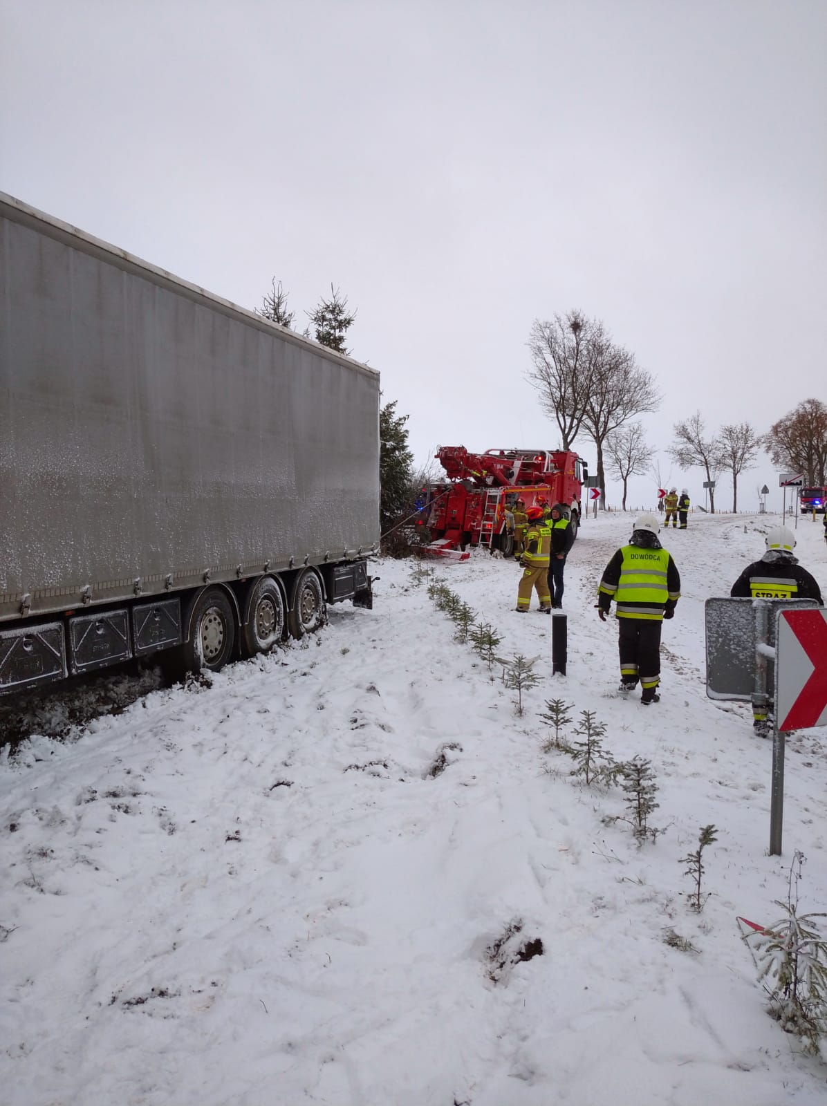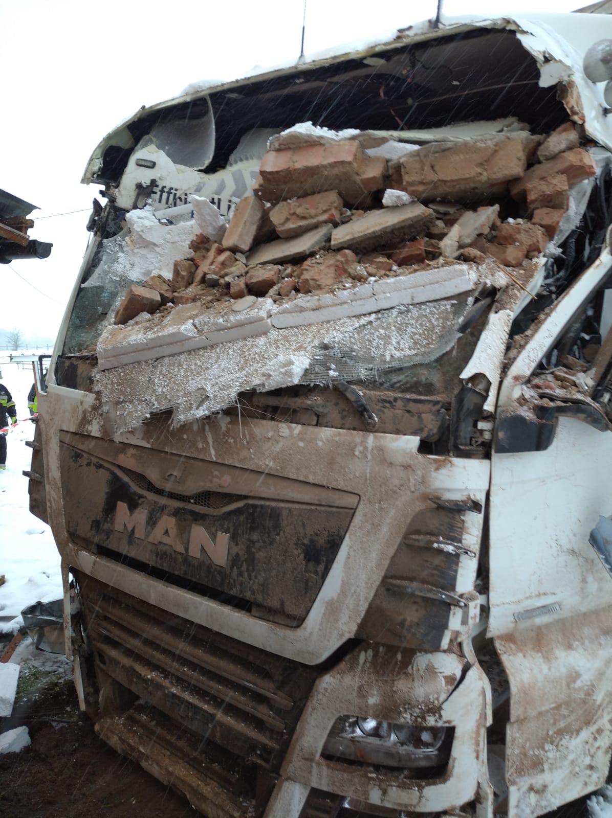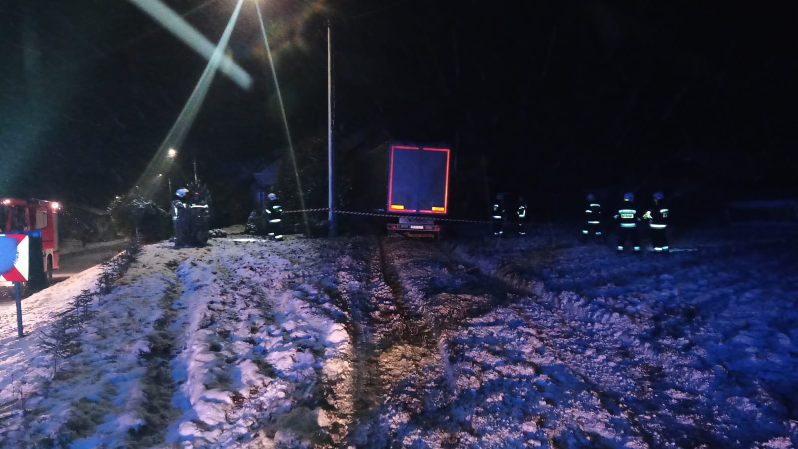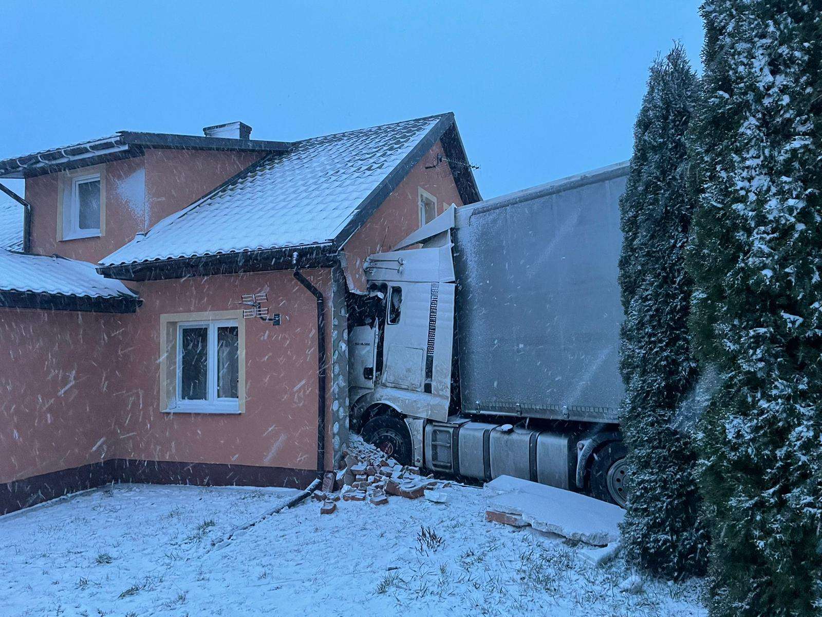 Kilka minut przed godziną szóstą 21 stycznia zestaw ciężarowy – ciągnik siodłowy z naczepą zjechał z drogi krajowej nr 59, przejechał kilkanaście metrów przez trawnik i uderzył w budynek mieszkalny. Do zdarzenia drogowego doszło w miejscowości Mojtyny w powiecie mrągowskim. Na miejsce wypadku z mrągowskiej Komendy Powiatowej Państwowej Straży Pożarnej zadysponowano 2 samochody ratowniczo-gaśnicze oraz samochód rozpoznawczo ratowniczy. Dyspozycję wyjazdu do akcji ratowniczej otrzymały również ochotnicze straże pożarne z Nawiad i Starych Kiełbonek. Ponadto dyżurny operacyjny województwa ze stanowiska kierowania komendanta wojewódzkiego PSP w Olsztynie zadysponował z ostródzkiej Komendy Powiatowej PSP Specjalistyczną Grupę Ratownictwa Technicznego „Ostróda”, która wyposażona jest w odpowiedni sprzęt do tego typu akcji ratowniczych, między innymi ciężki samochód ratownictwa technicznego typu rotator. Gdy mrągowscy strażacy przybyli na miejsce wypadku okazało się, że w wyniku zdarzenia kierowca nie może wydostać się z kabiny ciężarówki. Strażacy wykonali dostęp do poszkodowanego mężczyzny i ewakuowali go z uszkodzonego pojazdu. Równolegle strażacy sprawdzili uszkodzony budynek mieszkalny. Okazało się, że w momencie uderzenia ciężarówki w dom, przebywały w nim dwie osoby. Na szczęście mieszkańcy znajdowali się w innej części budynku i nie odnieśli obrażeń. Kierowca ciężarówki został przebadany przez zespół Państwowego Ratownictwa Medycznego. Nie odniósł poważnych obrażeń, nie wymagał hospitalizacji. Na miejsce akcji przybył także st. kpt. Józef Adam Banach Komendant Powiatowy PSP w Mrągowie, który objął dowodzenie nad akcją ratowniczą. Strażacy z SGRT Ostróda przy pomocy systemu wyciągarek hydraulicznych, w które wyposażony jest samochód ratowniczy typu rotator, wydobyli zestaw ciężarowy z budynku i odholowali w miejsce bezpieczne. Przyczyny wypadku ustala Policja.