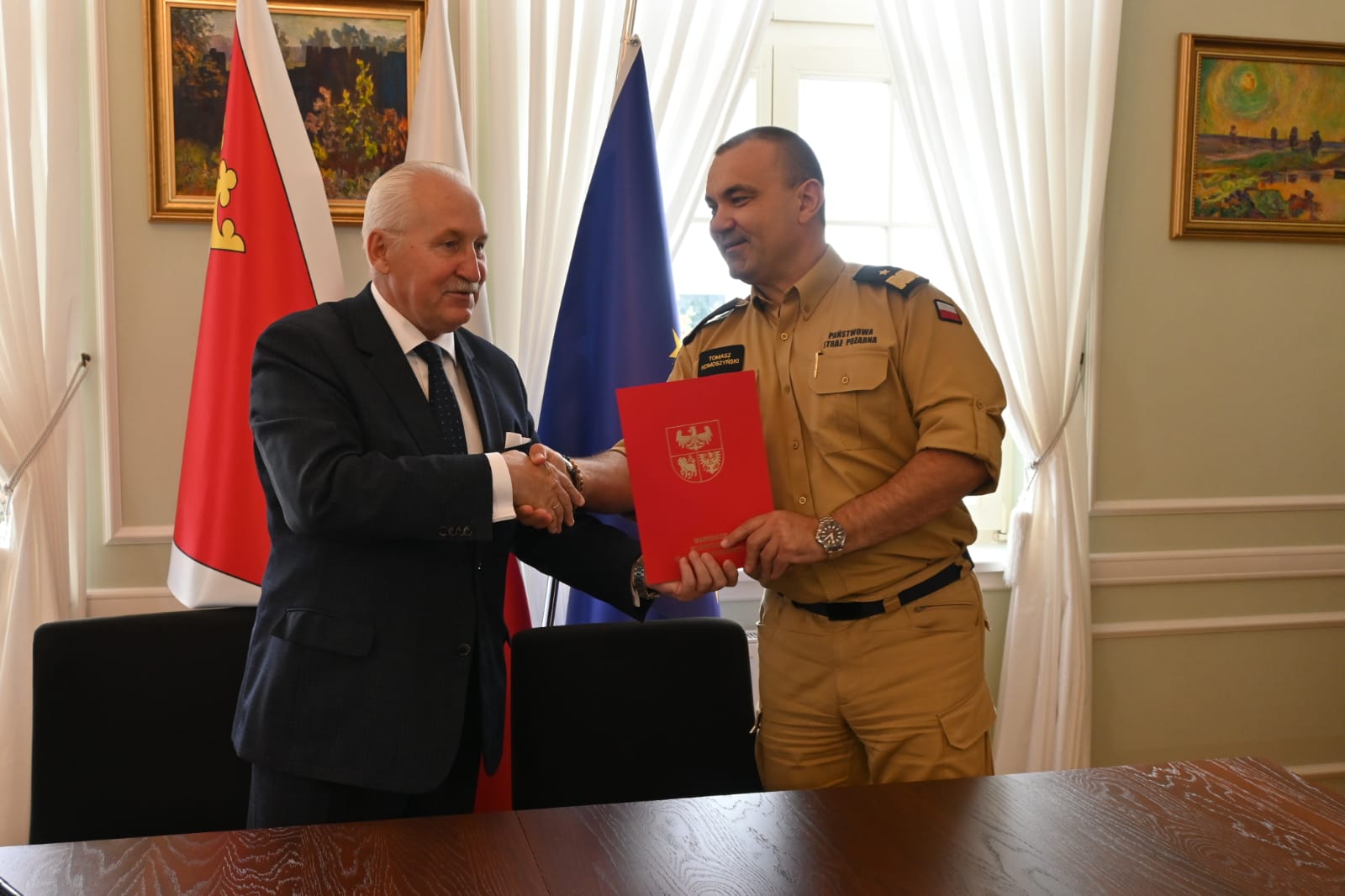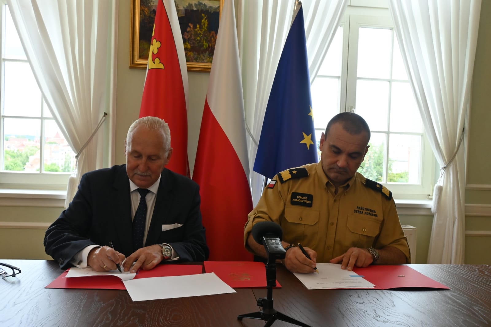 Z tej okazji 9 sierpnia w Urzędzie Marszałkowskim w Olsztynie odbyło się uroczyste podpisanie umów z przedstawicielami służb mundurowych. Umowę o przekazanie środków dla warmińsko-mazurskich strażaków PSP podpisali Gustaw Marek Brzezin Marszałek Województwa i nadbryg. Tomasz Komoszyński Warmińsko-Mazurski Komendant Wojewódzki PSP. Podobnie umowy dla Warmińsko-Mazurskiego Oddziału Straży Granicznej i Komendy Wojewódzkiej Policji parafowali Marszałek Województwa i ze strony SG Zastępca Komendanta płk. SG Zbigniew Klimczyk, a Policji insp. Arkadiusz Sylwestrzak.