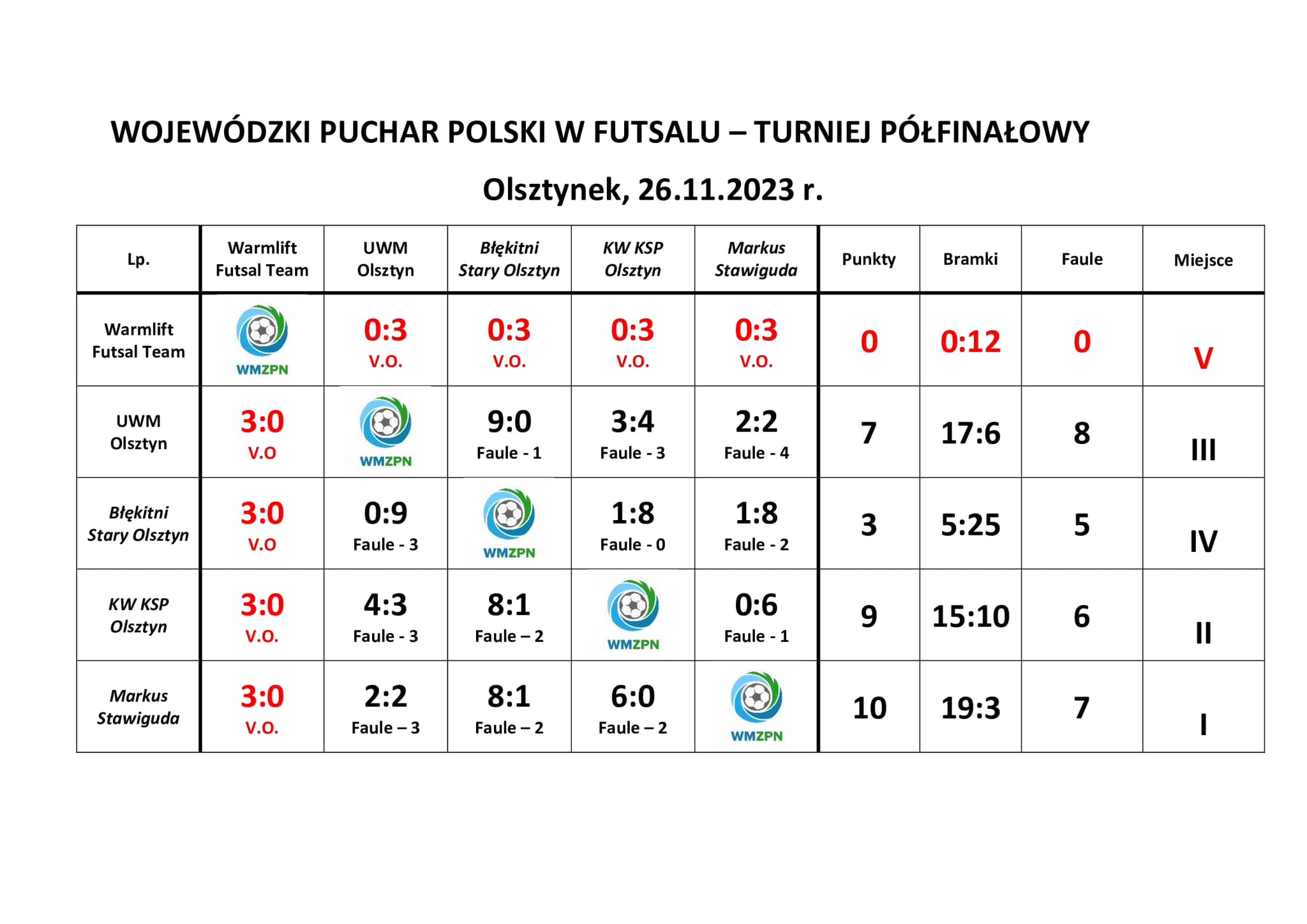 W minioną niedzielę 26 listopada w Olsztynku odbył się turniej półfinałowy Wojewódzkiego Pucharu Polski w Futsalu. W hali Szkoły Podstawowej nr 1 im. Noblistów Polskich w Olsztynku, gdzie rozegrano turniej, nie brakowało emocji. W walce o drugie premiowane awansem miejsce do boju stanęły drużyny Komendy Wojewódzkiej Państwowej Straży w Olsztynie z drużyną Uniwersytetu Warmińsko-Mazurskiego. Drużynie akademickiej do szczęścia wystarczał tylko remis. Mało tego, na 27 sekund przed zakończeniem spotkania akademicy prowadzili ze strażakami 3:2. Jednak strażacy PSP z Warmii i Mazur pokazali niezwykły charakter drużyny. 26 sekund przed zakończeniem meczu Arkadiusz Konicz zdobył bramkę wyrównującą. To nie był koniec emocji! Strażacka drużyna na 3 sekundy przed końcową syreną wykonywała rzut rożny…we wspaniały sposób 0,2 sekundy przed końcem meczu kolejną bramkę zdobył Arkadiusz Konicz i tym samym Strażacy wyszli na prowadzenie i w efekcie wygrali spotkanie, co dało Strażakom PSP z krainy jezior awans do turnieju finałowego.