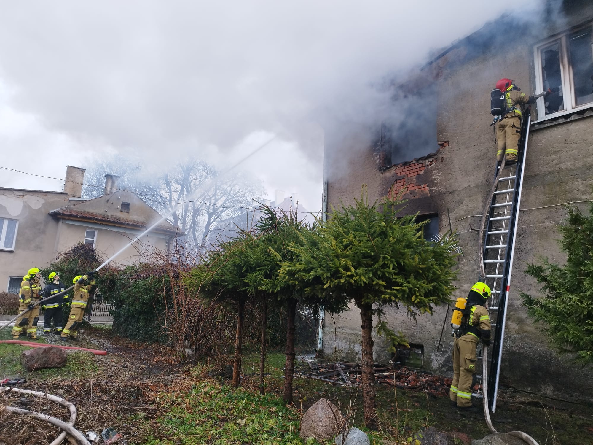 Do akcji gaśniczej zadysponowano 11 zastępów pożarniczych. Strażacy, gdy przybyli na miejsce zdarzenia, zastali rozwinięty pożar budynku. Ustalili, że w chwili wybuchu pożaru w domu przebywały dwie osoby. Jedna z nich ewakuowała się samodzielnie, a miejsce pobytu drugiej osoby było nieznane. Istniało prawdopodobieństwo, że może ona znajdować się w płonącym domu.