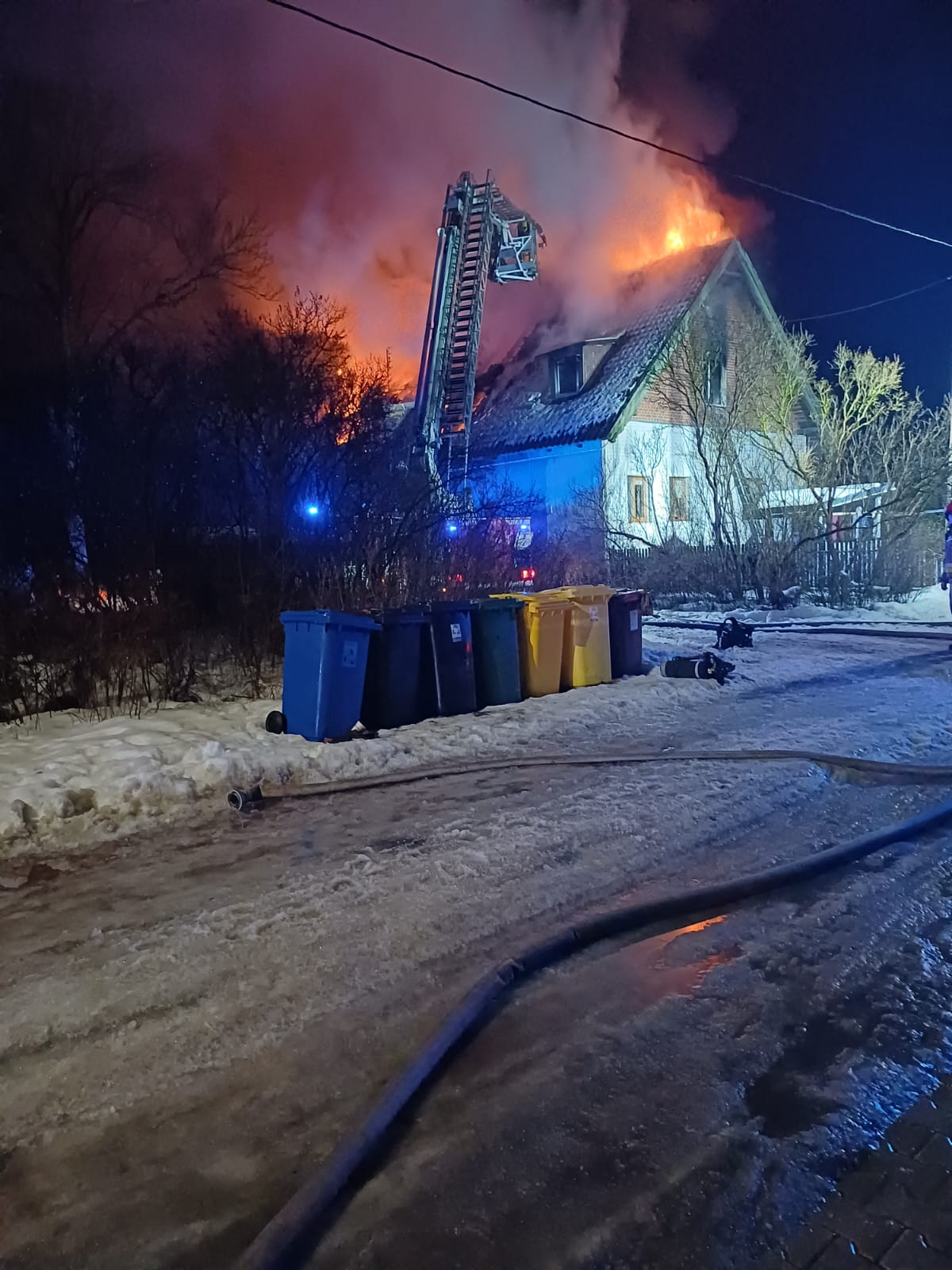 Gdy strażacy przybyli na miejsce zdarzenia pożar był, już w fazie rozwiniętej, ogień wydobywał się ponad więźbę dachową. Z budynku ewakuowało się 8 osób, a spośród nich 3 pod wpływem zdarzenia zostały zabrane przez Zespoły Ratownictwa Medycznego do szpitala. Mieszkańcy przekazali strażakom, że w budynku może przebywać jeszcze jedna osoba.