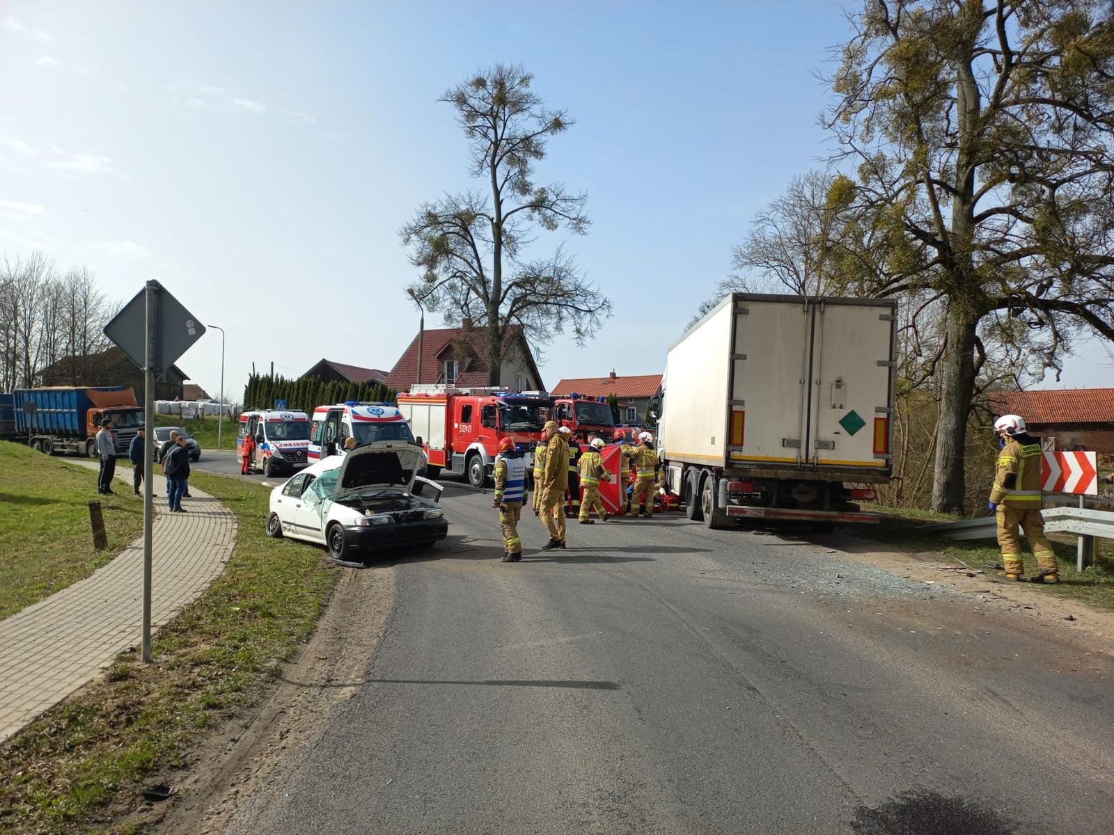 Do tragicznego w skutkach wypadku drogowego doszło 28 marca w miejscowości Niebrzydowo Wielkie w powiecie ostródzkim. Kilka minut po godzinie jedenastej na drodze wojewódzkiej nr 519 samochód osobowy zderzył się z ciężarówką. Pojazdami podróżowali kierujący nimi mężczyźni. Z informacji, jakie wpłynęły do stanowiska kierowania komendanta powiatowego PSP w Ostródzie, wynikało, że kierowca auta osobowego jest nieprzytomny i uwięziony w pojeździe. Na miejsce akcji ratowniczej zadysponowano 9 zastępów pożarniczych, między innymi z jednostki ratowniczo-gaśniczej w Morągu, a także z Ochotniczych Straży Pożarnych w Miłakowie i Jurkach. Na miejsce zdarzenia udali się również Komendant Powiatowy PSP w Ostródzie wraz ze swoim Zastępcą. Potwierdziły się informacje ze zgłoszenia. Strażacy przy pomocy narzędzi hydraulicznych musieli wykonać dostęp do poszkodowanego kierowcy samochodu osobowego. Mężczyzna nie wykazywał oznak życia. Zespoły Państwowego Ratownictwa Medycznego przystąpiły do udzielania poszkodowanemu pomocy medycznej. Niestety pomimo prowadzenia przez ponad godzinę resuscytacji krążeniowo-oddechowej nie udało się przywrócić czynności życiowych 19-letniemu mężczyźnie. Lekarz stwierdził zgon. Kierowca samochodu ciężarowego nie odniósł obrażeń. Ponadto działania straży pożarnej polegały na zabezpieczeniu miejsca zderzenia pod względem pożarowym oraz zabezpieczeniu operacji lądowania i startu śmigłowca Lotniczego Pogotowia Ratunkowego. Droga nr 519 jest zablokowana.