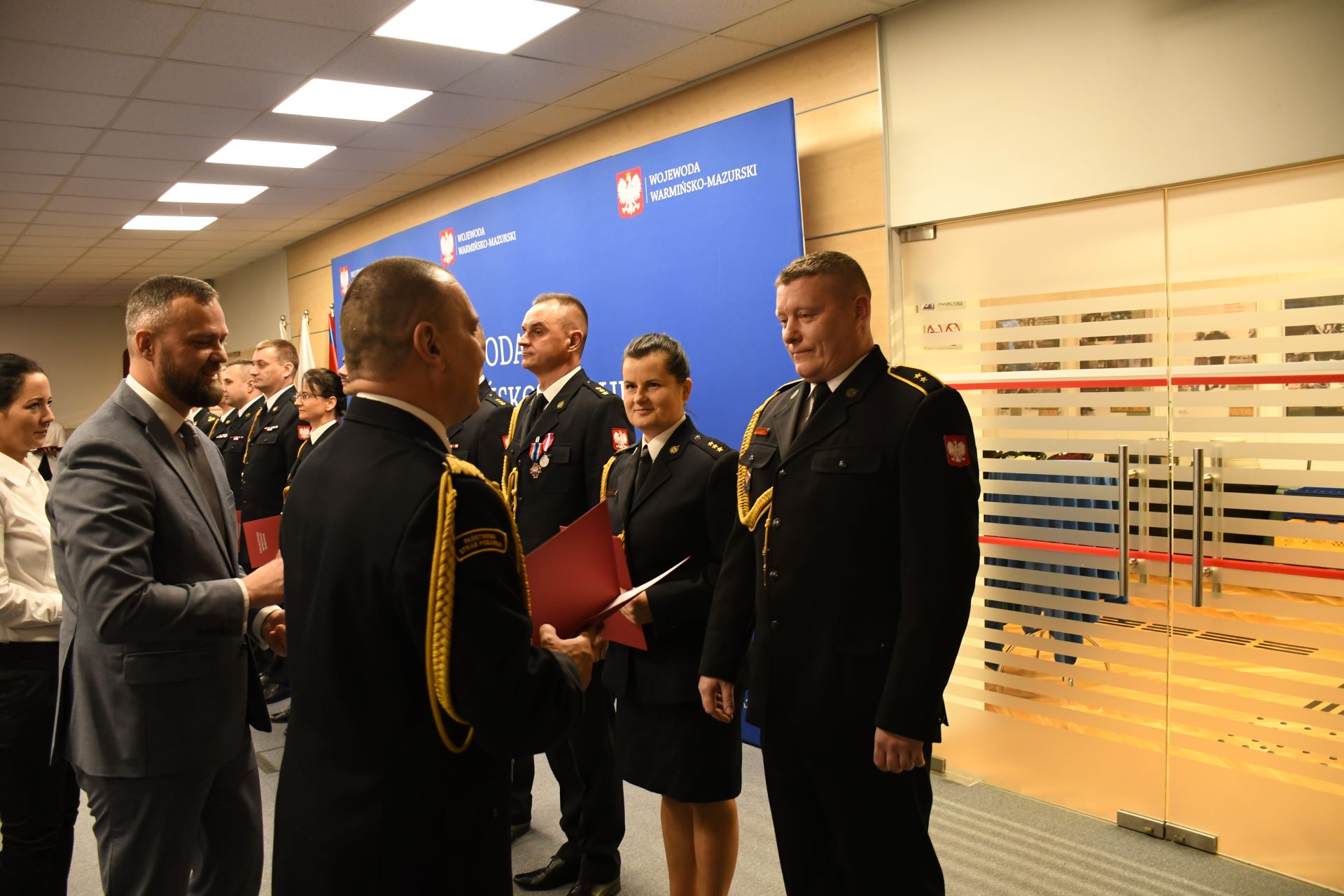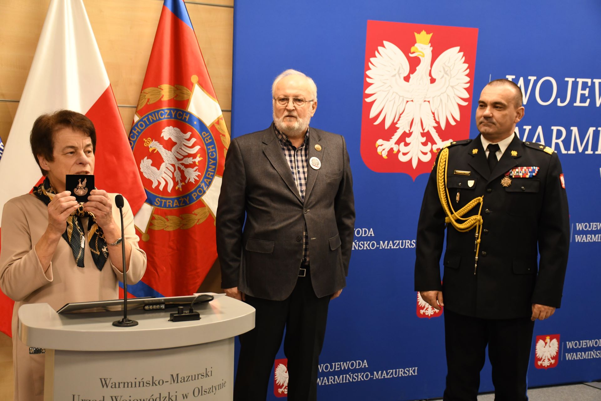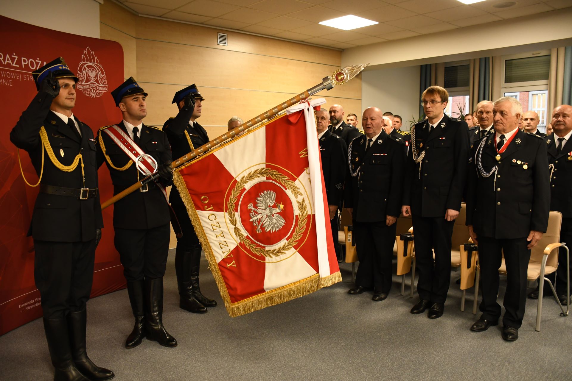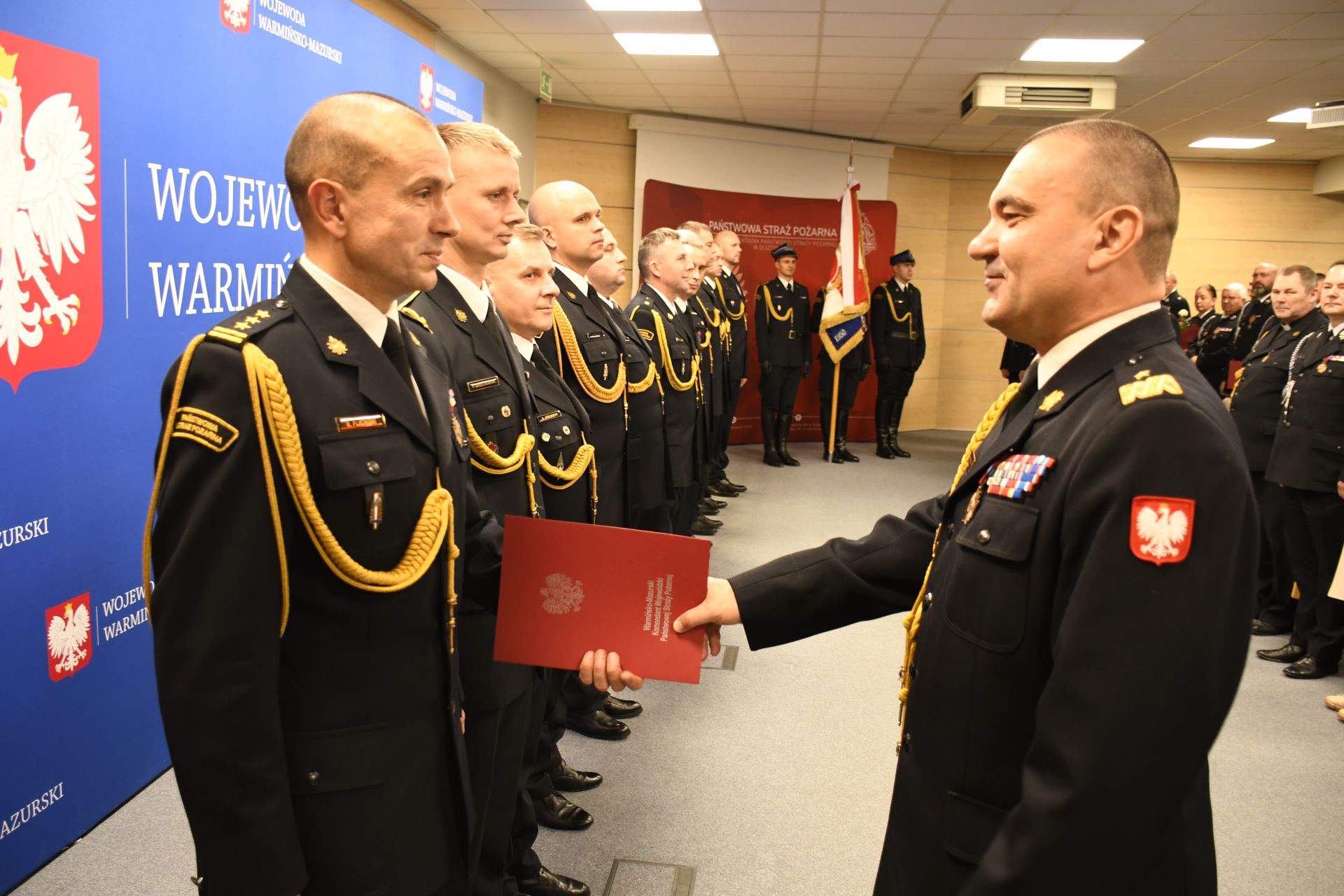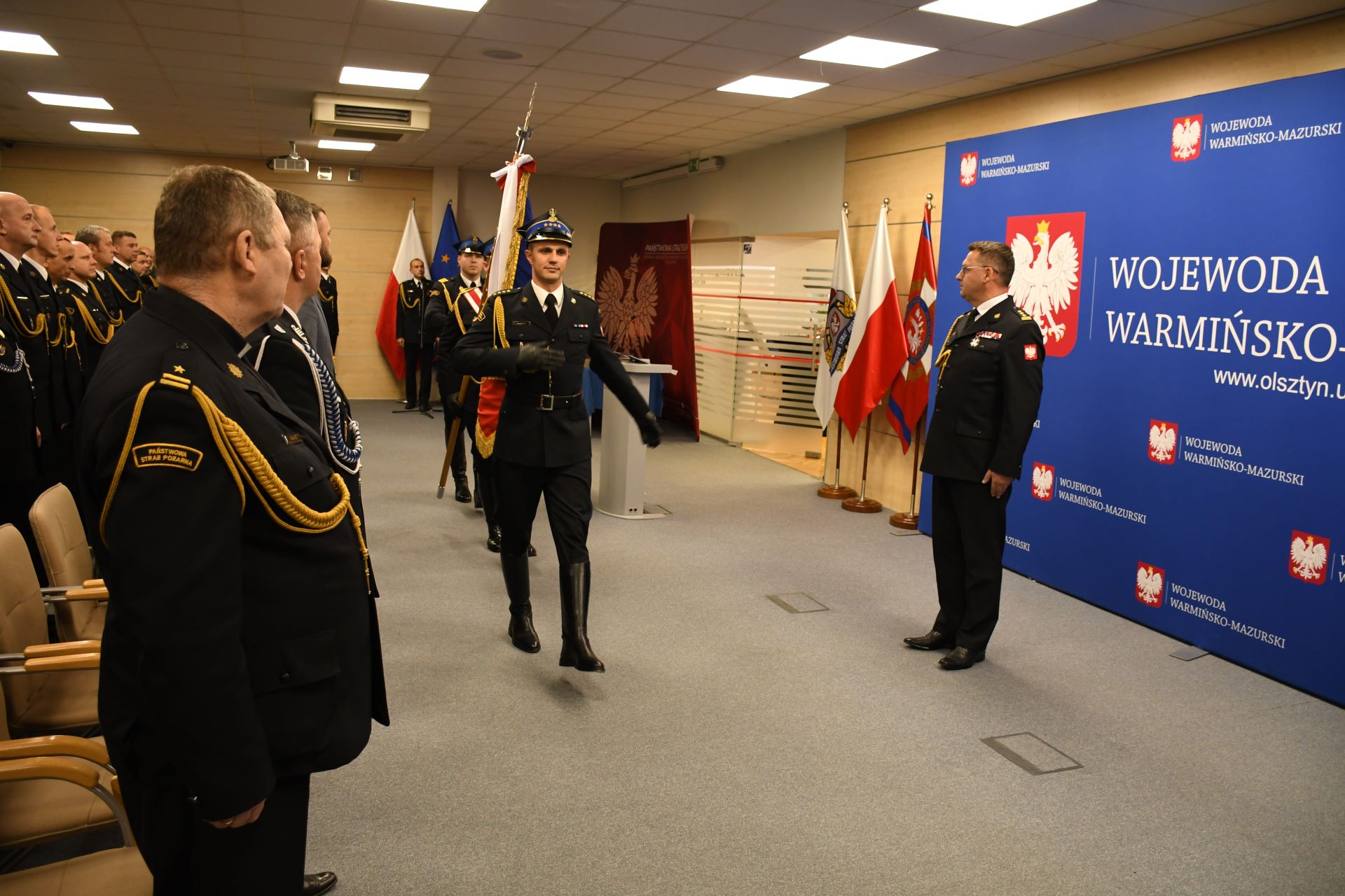 We wtorek 14 listopada w Urzędzie Wojewódzkim w Olsztynie odbyła się uroczysta zbiórka z okazji Narodowego Święta Niepodległości. Uroczystość rozpoczęła się od złożenia meldunku Piotrowi Opaczewskiemu Wicewojewodzie Warmińsko-Mazurskiemu o gotowości pododdziału do zbiórki, po czym odśpiewano hymn państwowy. Następnie nadbryg. Tomasz Komoszyński Warmińsko-Mazurski Komendant Wojewódzki Państwowej Straży Pożarnej przywitał zaproszonych gości, między innymi Piotra Opaczewskiego Wicewojewodę Warmińsko-Mazurskiego wraz z Dyrektorami urzędu, Barbarę Gawlicką Prezes Stowarzyszenia Rodzina Katyńska w Olsztynie wraz z Ryszardem Bombą członkiem zarządu stowarzyszenia oraz dh. Macieja Jasińskiego Dyrektora Zarządu Wykonawczego ZOSP RP w Olsztynie, a także kierownictwo Komendy Wojewódzkiej PSP w Olsztynie i kadrę kierowniczą PSP z woj. warmińsko-mazurskiego i pozostałych zgromadzonych. W rocznicowy, niepodległościowy nastrój uczestników uroczystości wprowadziła Prezes Barbara Gawlicka, która przedstawiła referat na temat walki o niepodległość Polski. Kolejnym punktem zbiórki było wręczenie funkcjonariuszom i pracownikom PSP oraz druhom Ochotniczych Straży Pożarnych z naszego województwa odznaczeń państwowych i resortowych. Ponadto strażacy PSP otrzymali awanse na wyższe stopnie służbowe oraz indywidualne wyróżnienia. Podczas uroczystości Komendant Wojewódzki PSP w Olsztynie wręczył st. kpt. Łukaszowi Zaniewskiemu akt powołania na stanowisko Zastępcy Komendanta Powiatowego PSP w Ostródzie. Wyjątkową chwilą podczas uroczystości było, wręczenie przez Członków Zarządu Stowarzyszenia Rodzina Katyńska w Olsztynie nadbryg. Tomaszowi Komoszyńskiemu repliki „Orła Katyńskiego”, który został odnaleziony w Charkowie podczas ekshumacji polskich oficerów, w dowód uznania za dbałość i pamięć o poległych za niepodległość Polski. Na zakończenie głos zabrał Wicewojewoda Piotr Opaczewski, który podziękował strażakom PSP i strażakom ochotnikom za codzienne poświęcenie i zaangażowanie w służbie dla dobra społeczeństwa.
