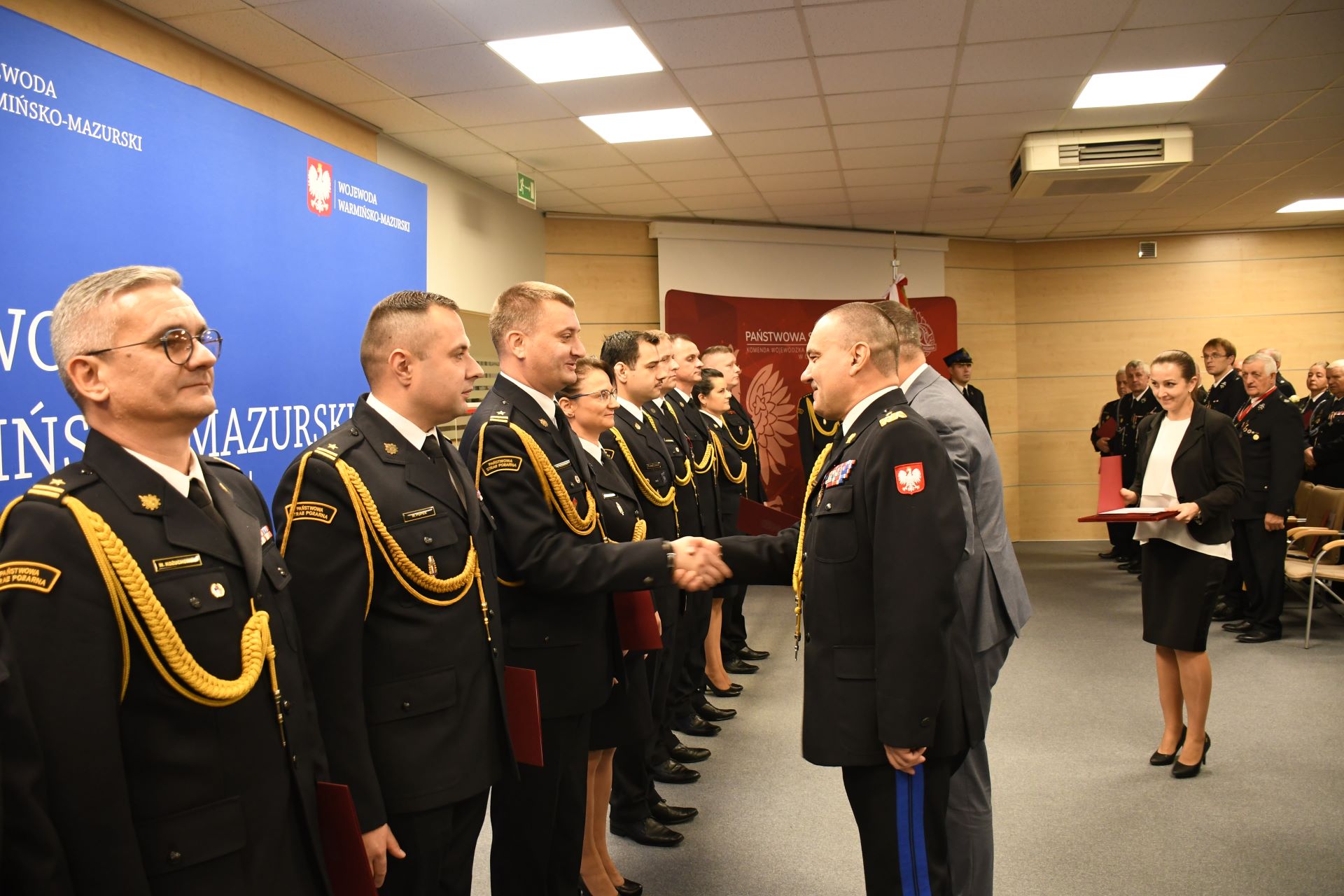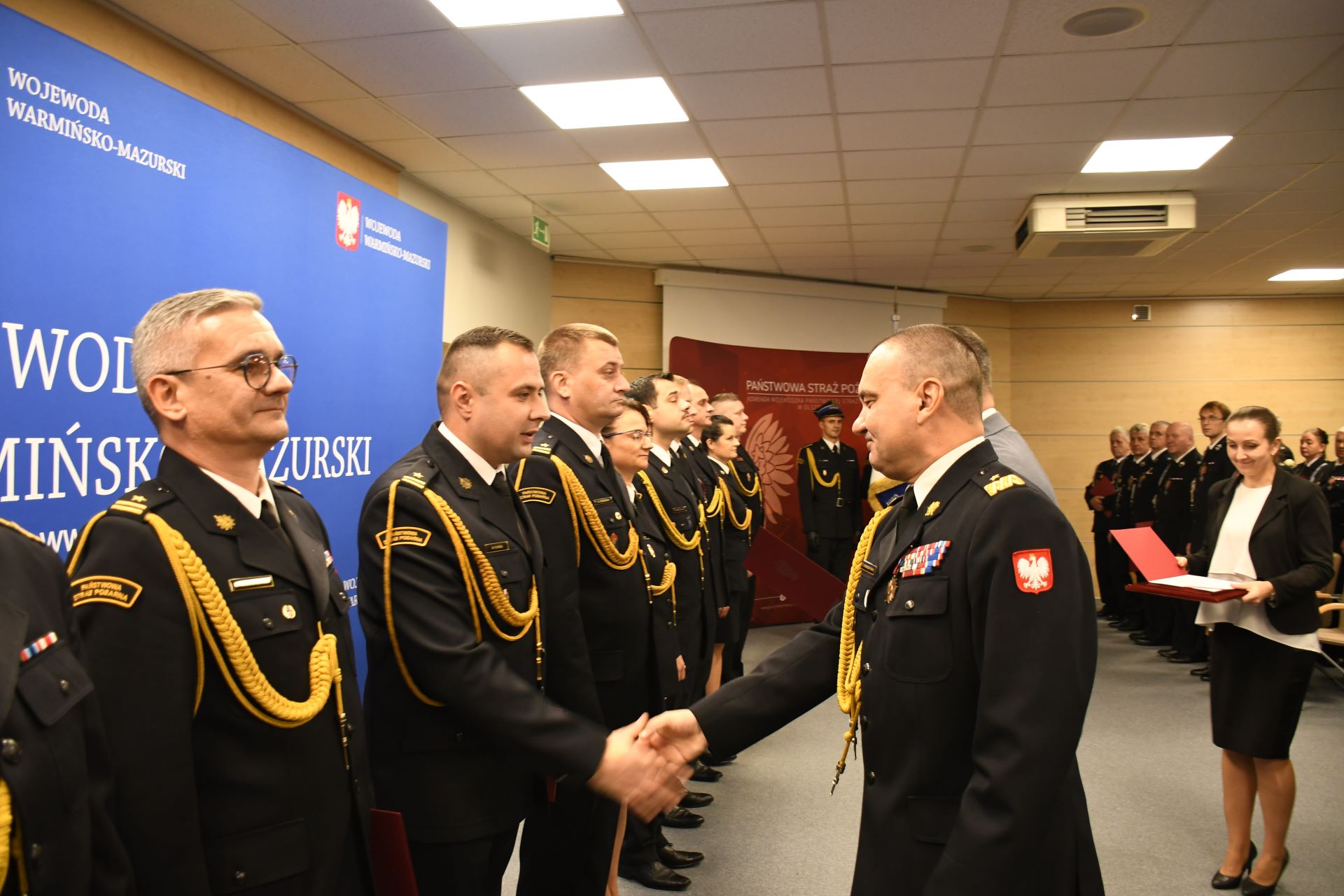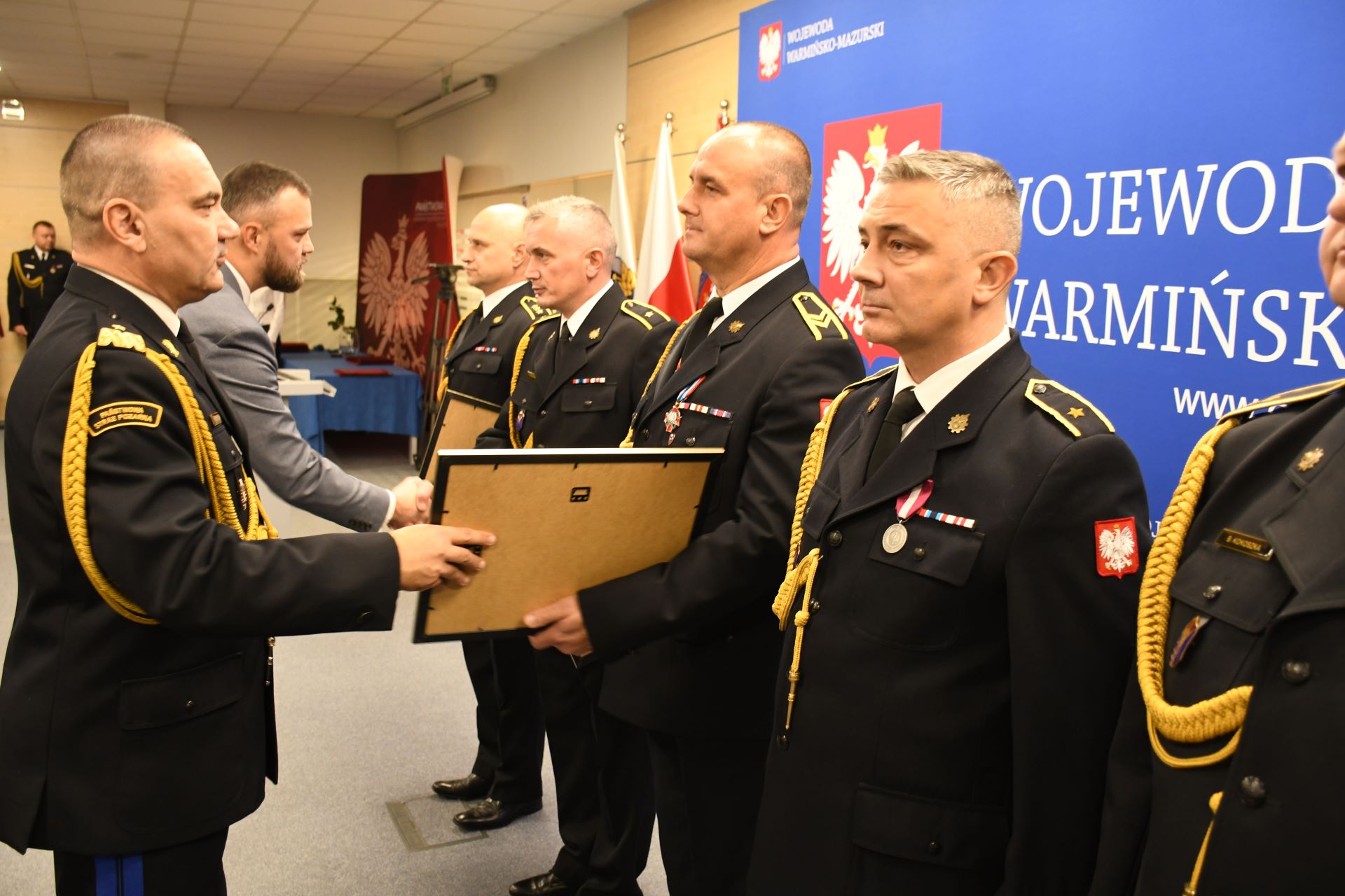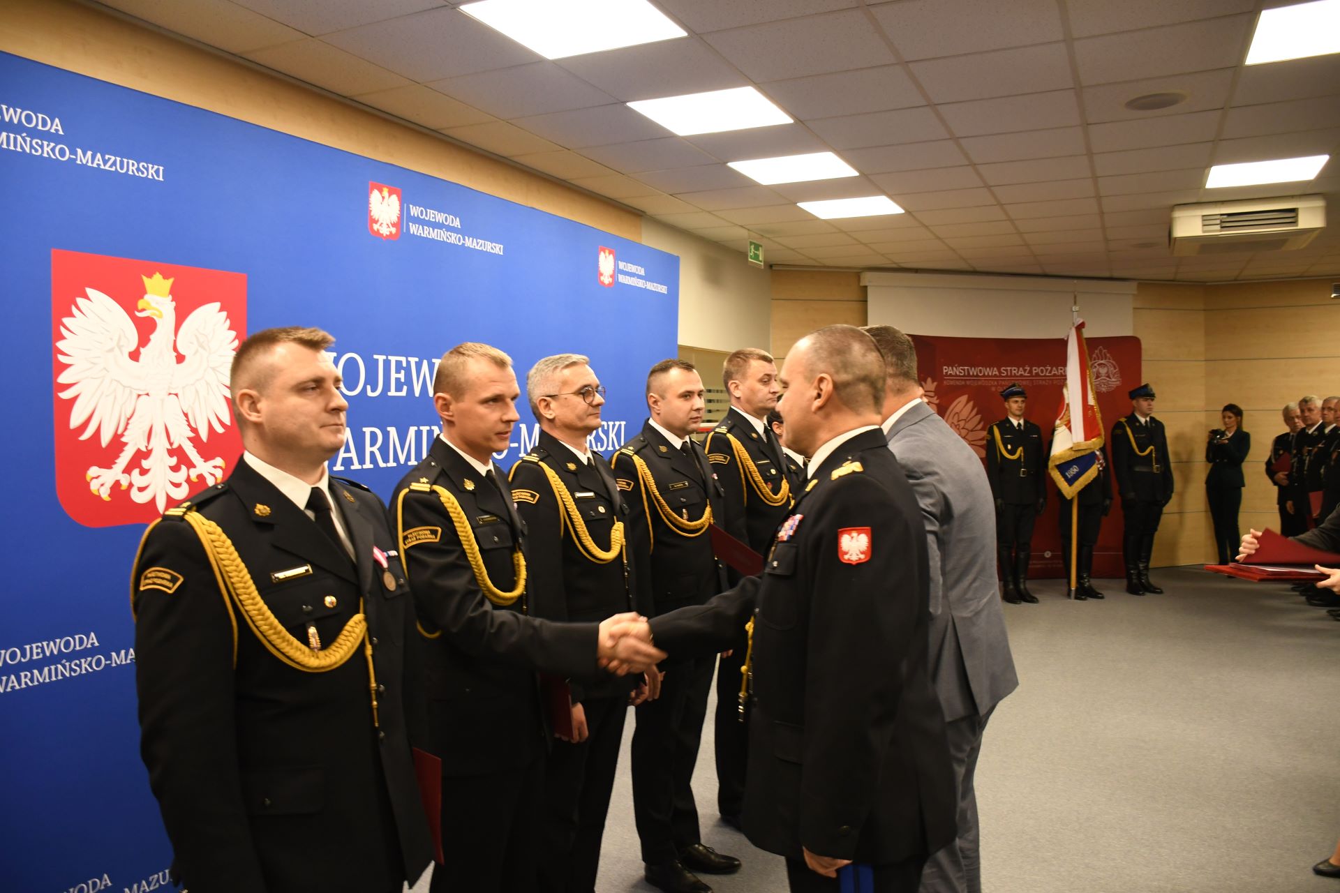 We wtorek 14 listopada w Urzędzie Wojewódzkim w Olsztynie odbyła się uroczysta zbiórka z okazji Narodowego Święta Niepodległości. Uroczystość rozpoczęła się od złożenia meldunku Piotrowi Opaczewskiemu Wicewojewodzie Warmińsko-Mazurskiemu o gotowości pododdziału do zbiórki, po czym odśpiewano hymn państwowy. Następnie nadbryg. Tomasz Komoszyński Warmińsko-Mazurski Komendant Wojewódzki Państwowej Straży Pożarnej przywitał zaproszonych gości, między innymi Piotra Opaczewskiego Wicewojewodę Warmińsko-Mazurskiego wraz z Dyrektorami urzędu, Barbarę Gawlicką Prezes Stowarzyszenia Rodzina Katyńska w Olsztynie wraz z Ryszardem Bombą członkiem zarządu stowarzyszenia oraz dh. Macieja Jasińskiego Dyrektora Zarządu Wykonawczego ZOSP RP w Olsztynie, a także kierownictwo Komendy Wojewódzkiej PSP w Olsztynie i kadrę kierowniczą PSP z woj. warmińsko-mazurskiego i pozostałych zgromadzonych. W rocznicowy, niepodległościowy nastrój uczestników uroczystości wprowadziła Prezes Barbara Gawlicka, która przedstawiła referat na temat walki o niepodległość Polski. Kolejnym punktem zbiórki było wręczenie funkcjonariuszom i pracownikom PSP oraz druhom Ochotniczych Straży Pożarnych z naszego województwa odznaczeń państwowych i resortowych. Ponadto strażacy PSP otrzymali awanse na wyższe stopnie służbowe oraz indywidualne wyróżnienia. Podczas uroczystości Komendant Wojewódzki PSP w Olsztynie wręczył st. kpt. Łukaszowi Zaniewskiemu akt powołania na stanowisko Zastępcy Komendanta Powiatowego PSP w Ostródzie. Wyjątkową chwilą podczas uroczystości było, wręczenie przez Członków Zarządu Stowarzyszenia Rodzina Katyńska w Olsztynie nadbryg. Tomaszowi Komoszyńskiemu repliki „Orła Katyńskiego”, który został odnaleziony w Charkowie podczas ekshumacji polskich oficerów, w dowód uznania za dbałość i pamięć o poległych za niepodległość Polski. Na zakończenie głos zabrał Wicewojewoda Piotr Opaczewski, który podziękował strażakom PSP i strażakom ochotnikom za codzienne poświęcenie i zaangażowanie w służbie dla dobra społeczeństwa.