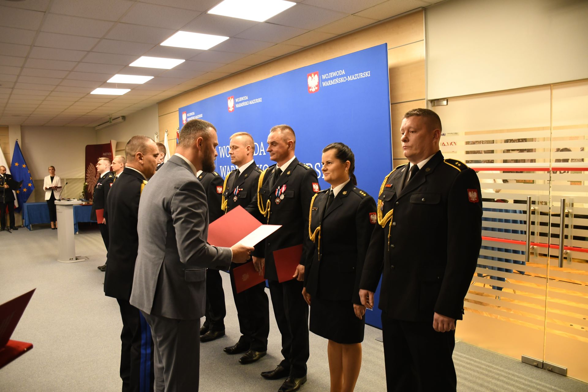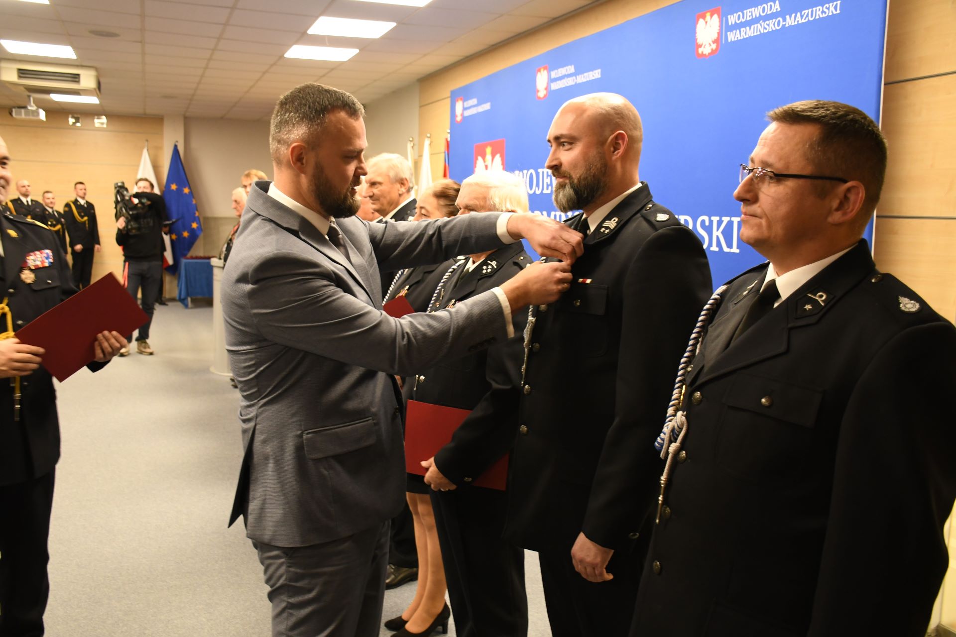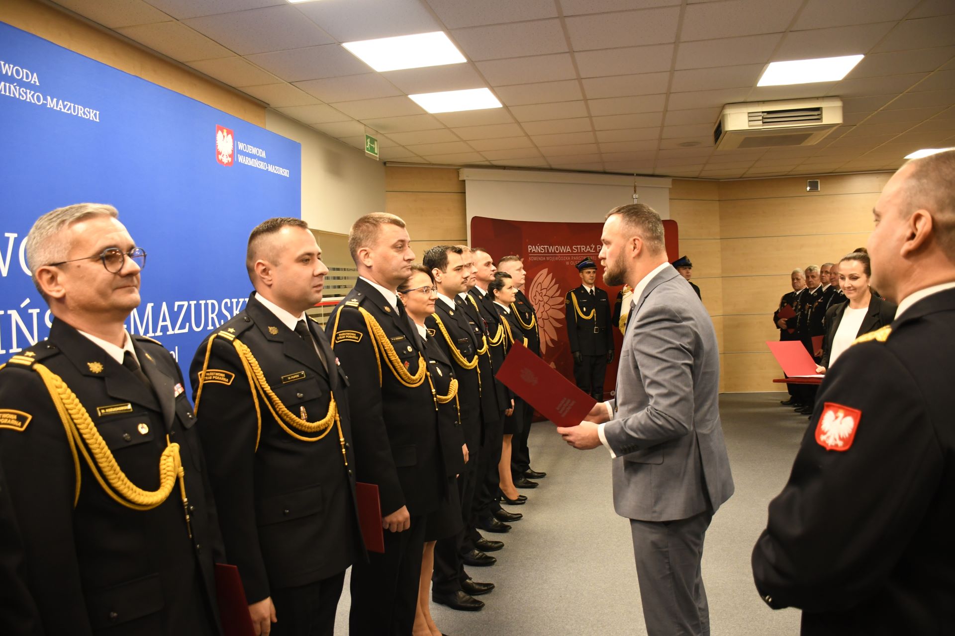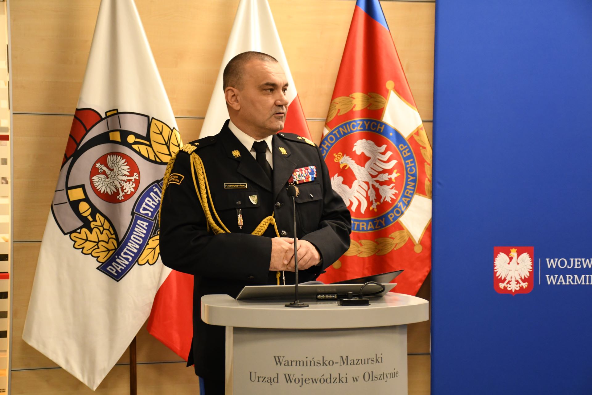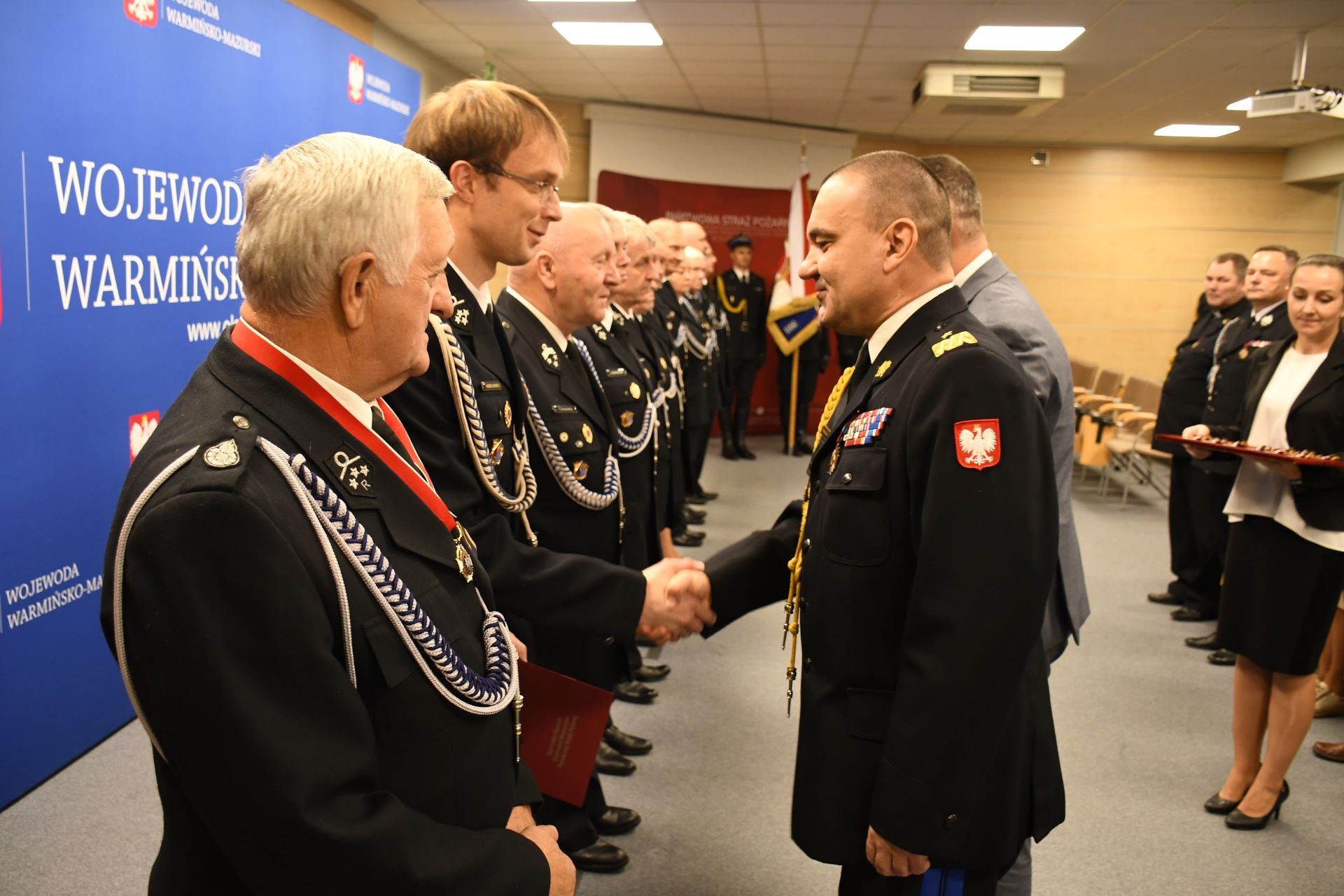 We wtorek 14 listopada w Urzędzie Wojewódzkim w Olsztynie odbyła się uroczysta zbiórka z okazji Narodowego Święta Niepodległości. Uroczystość rozpoczęła się od złożenia meldunku Piotrowi Opaczewskiemu Wicewojewodzie Warmińsko-Mazurskiemu o gotowości pododdziału do zbiórki, po czym odśpiewano hymn państwowy. Następnie nadbryg. Tomasz Komoszyński Warmińsko-Mazurski Komendant Wojewódzki Państwowej Straży Pożarnej przywitał zaproszonych gości, między innymi Piotra Opaczewskiego Wicewojewodę Warmińsko-Mazurskiego wraz z Dyrektorami urzędu, Barbarę Gawlicką Prezes Stowarzyszenia Rodzina Katyńska w Olsztynie wraz z Ryszardem Bombą członkiem zarządu stowarzyszenia oraz dh. Macieja Jasińskiego Dyrektora Zarządu Wykonawczego ZOSP RP w Olsztynie, a także kierownictwo Komendy Wojewódzkiej PSP w Olsztynie i kadrę kierowniczą PSP z woj. warmińsko-mazurskiego i pozostałych zgromadzonych. W rocznicowy, niepodległościowy nastrój uczestników uroczystości wprowadziła Prezes Barbara Gawlicka, która przedstawiła referat na temat walki o niepodległość Polski. Kolejnym punktem zbiórki było wręczenie funkcjonariuszom i pracownikom PSP oraz druhom Ochotniczych Straży Pożarnych z naszego województwa odznaczeń państwowych i resortowych. Ponadto strażacy PSP otrzymali awanse na wyższe stopnie służbowe oraz indywidualne wyróżnienia. Podczas uroczystości Komendant Wojewódzki PSP w Olsztynie wręczył st. kpt. Łukaszowi Zaniewskiemu akt powołania na stanowisko Zastępcy Komendanta Powiatowego PSP w Ostródzie. Wyjątkową chwilą podczas uroczystości było, wręczenie przez Członków Zarządu Stowarzyszenia Rodzina Katyńska w Olsztynie nadbryg. Tomaszowi Komoszyńskiemu repliki „Orła Katyńskiego”, który został odnaleziony w Charkowie podczas ekshumacji polskich oficerów, w dowód uznania za dbałość i pamięć o poległych za niepodległość Polski. Na zakończenie głos zabrał Wicewojewoda Piotr Opaczewski, który podziękował strażakom PSP i strażakom ochotnikom za codzienne poświęcenie i zaangażowanie w służbie dla dobra społeczeństwa.