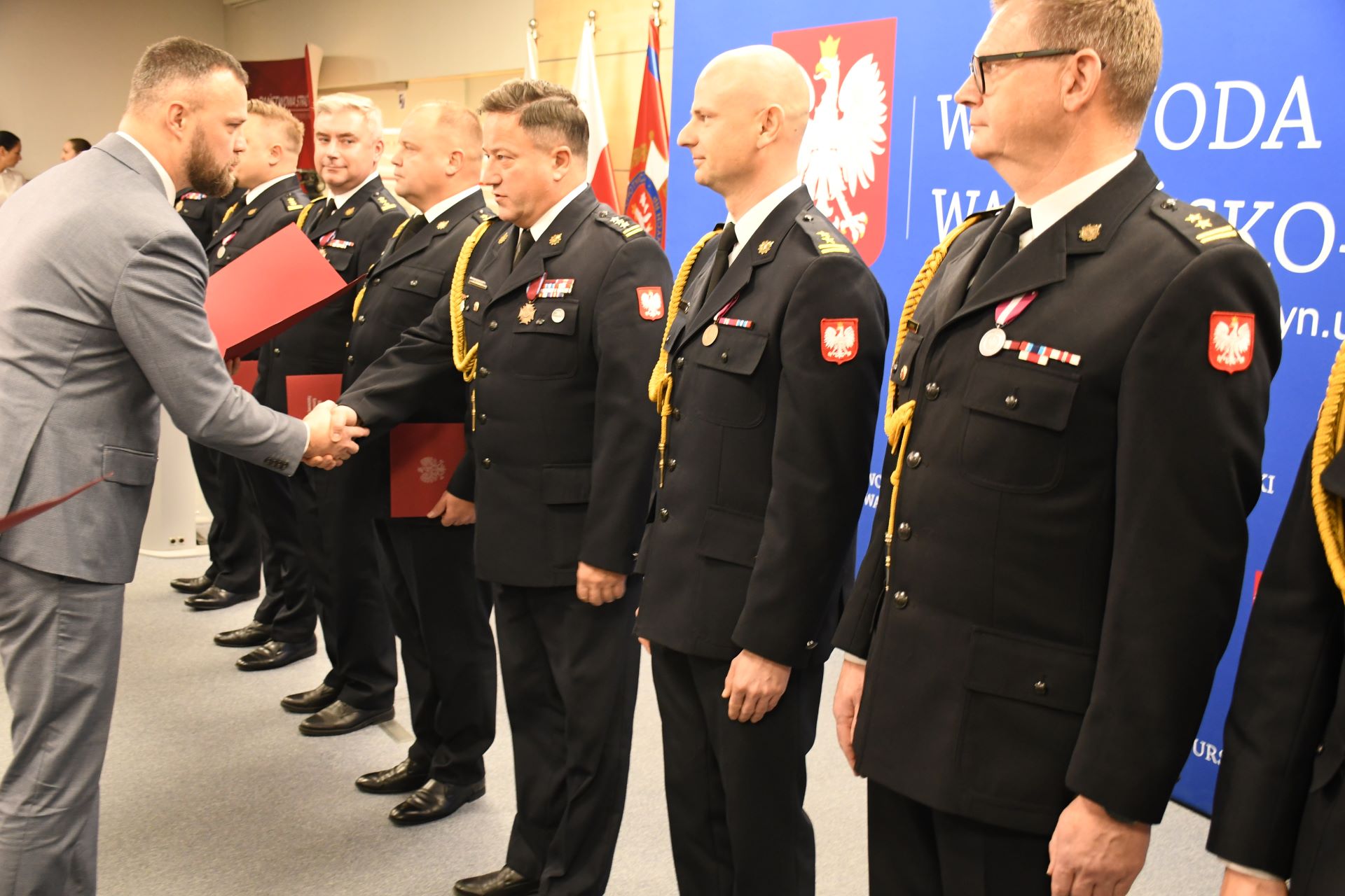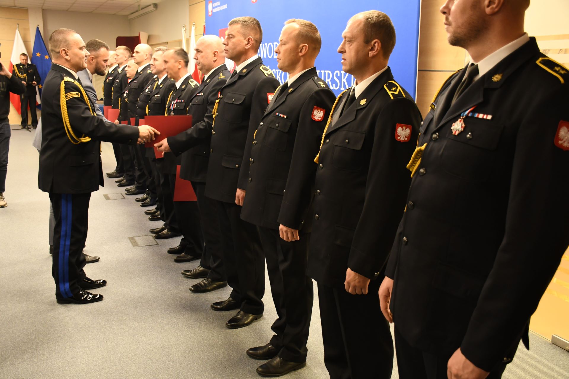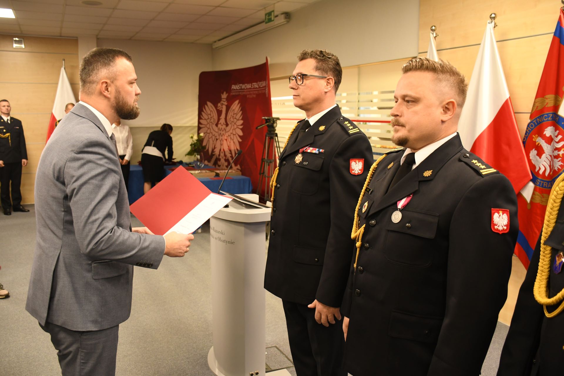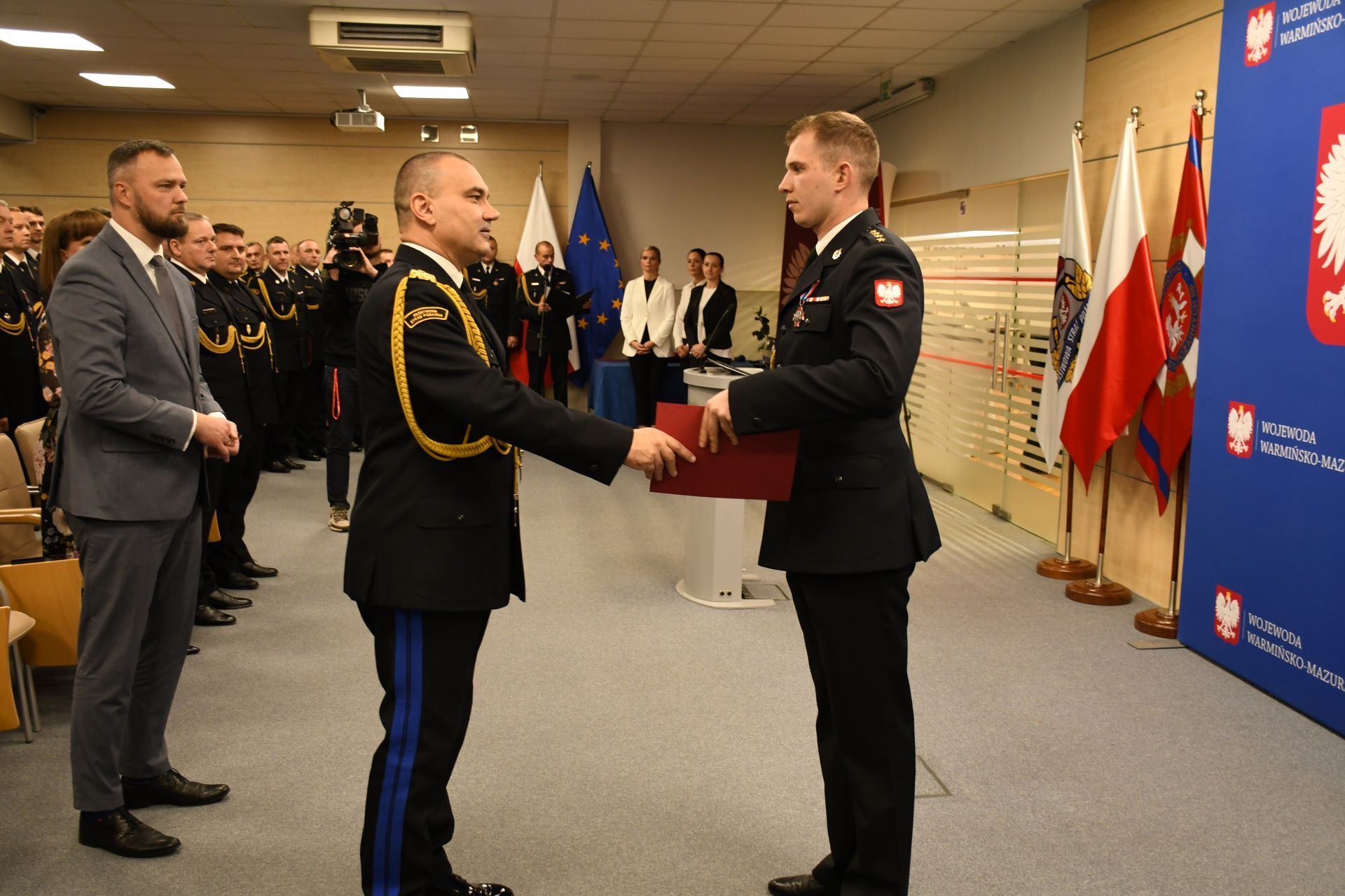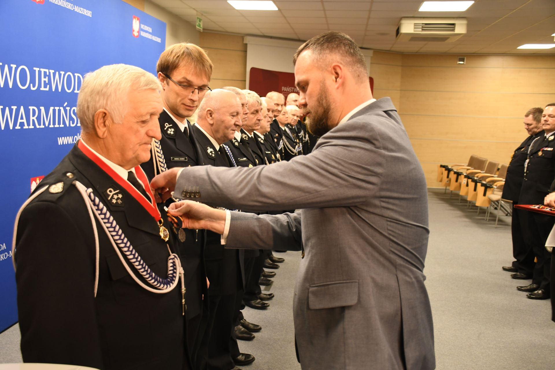 We wtorek 14 listopada w Urzędzie Wojewódzkim w Olsztynie odbyła się uroczysta zbiórka z okazji Narodowego Święta Niepodległości. Uroczystość rozpoczęła się od złożenia meldunku Piotrowi Opaczewskiemu Wicewojewodzie Warmińsko-Mazurskiemu o gotowości pododdziału do zbiórki, po czym odśpiewano hymn państwowy. Następnie nadbryg. Tomasz Komoszyński Warmińsko-Mazurski Komendant Wojewódzki Państwowej Straży Pożarnej przywitał zaproszonych gości, między innymi Piotra Opaczewskiego Wicewojewodę Warmińsko-Mazurskiego wraz z Dyrektorami urzędu, Barbarę Gawlicką Prezes Stowarzyszenia Rodzina Katyńska w Olsztynie wraz z Ryszardem Bombą członkiem zarządu stowarzyszenia oraz dh. Macieja Jasińskiego Dyrektora Zarządu Wykonawczego ZOSP RP w Olsztynie, a także kierownictwo Komendy Wojewódzkiej PSP w Olsztynie i kadrę kierowniczą PSP z woj. warmińsko-mazurskiego i pozostałych zgromadzonych. W rocznicowy, niepodległościowy nastrój uczestników uroczystości wprowadziła Prezes Barbara Gawlicka, która przedstawiła referat na temat walki o niepodległość Polski. Kolejnym punktem zbiórki było wręczenie funkcjonariuszom i pracownikom PSP oraz druhom Ochotniczych Straży Pożarnych z naszego województwa odznaczeń państwowych i resortowych. Ponadto strażacy PSP otrzymali awanse na wyższe stopnie służbowe oraz indywidualne wyróżnienia. Podczas uroczystości Komendant Wojewódzki PSP w Olsztynie wręczył st. kpt. Łukaszowi Zaniewskiemu akt powołania na stanowisko Zastępcy Komendanta Powiatowego PSP w Ostródzie. Wyjątkową chwilą podczas uroczystości było, wręczenie przez Członków Zarządu Stowarzyszenia Rodzina Katyńska w Olsztynie nadbryg. Tomaszowi Komoszyńskiemu repliki „Orła Katyńskiego”, który został odnaleziony w Charkowie podczas ekshumacji polskich oficerów, w dowód uznania za dbałość i pamięć o poległych za niepodległość Polski. Na zakończenie głos zabrał Wicewojewoda Piotr Opaczewski, który podziękował strażakom PSP i strażakom ochotnikom za codzienne poświęcenie i zaangażowanie w służbie dla dobra społeczeństwa.