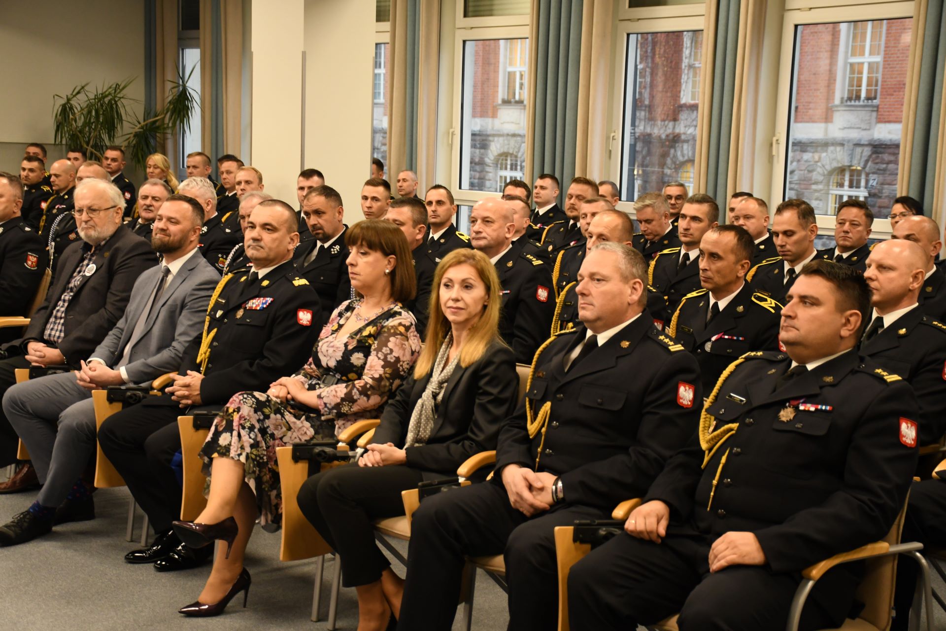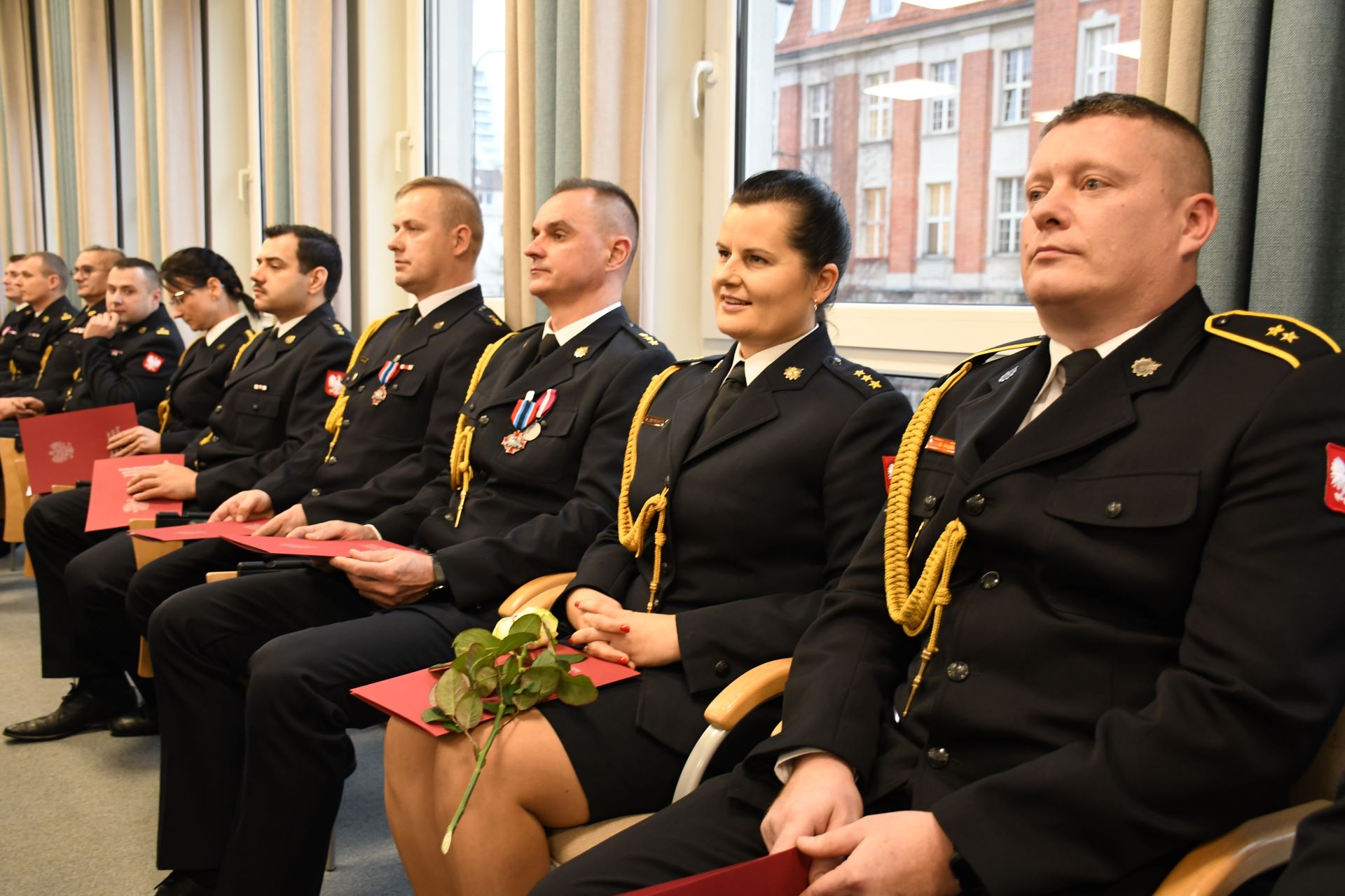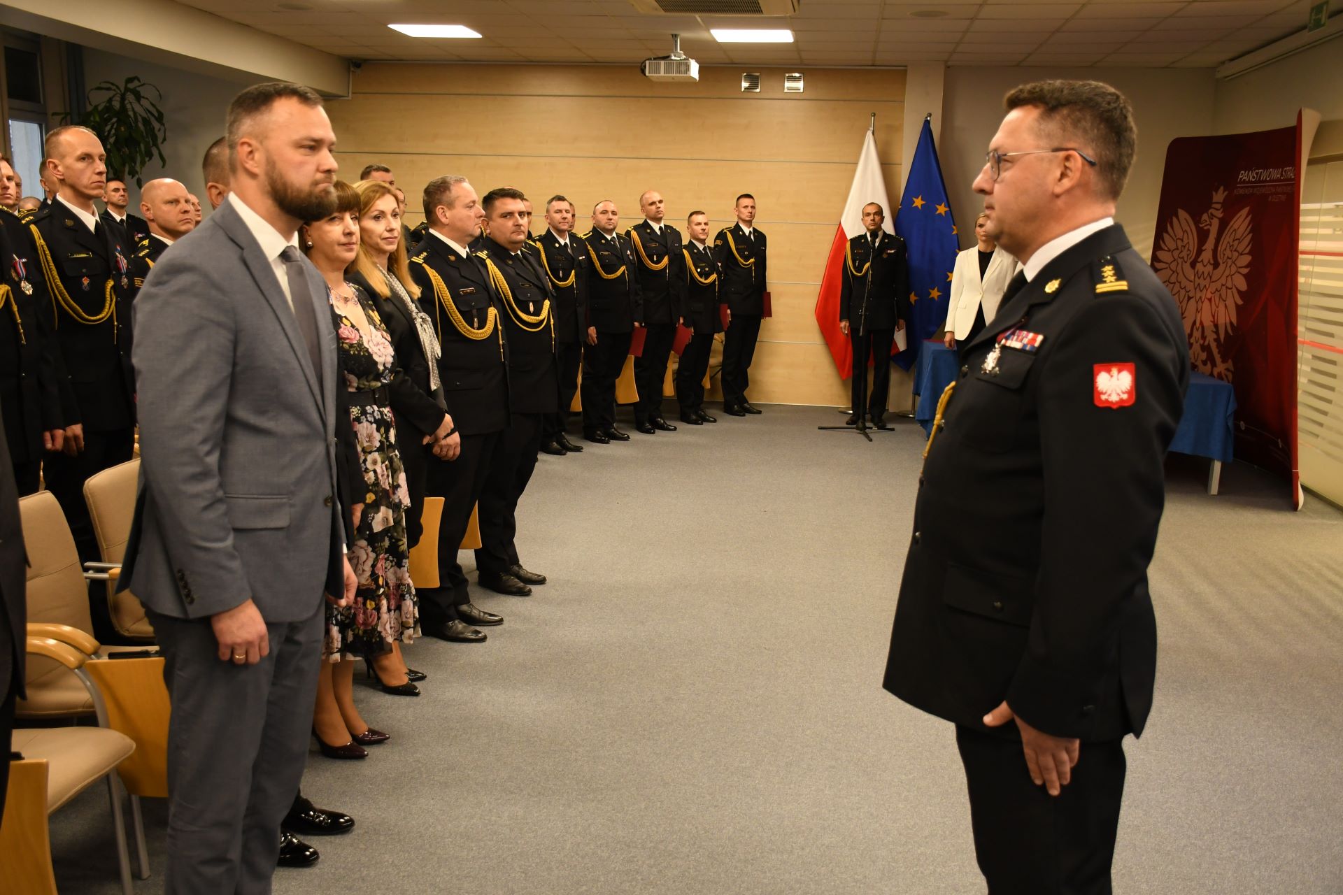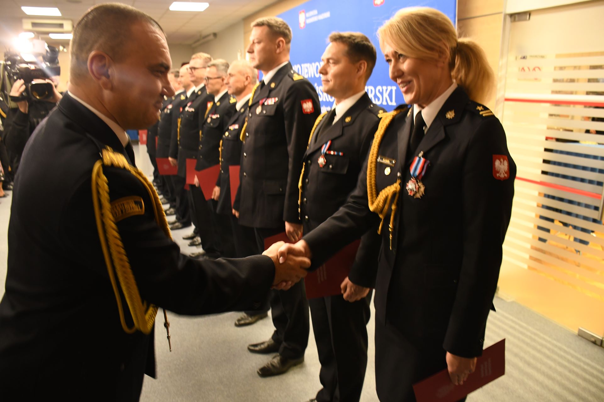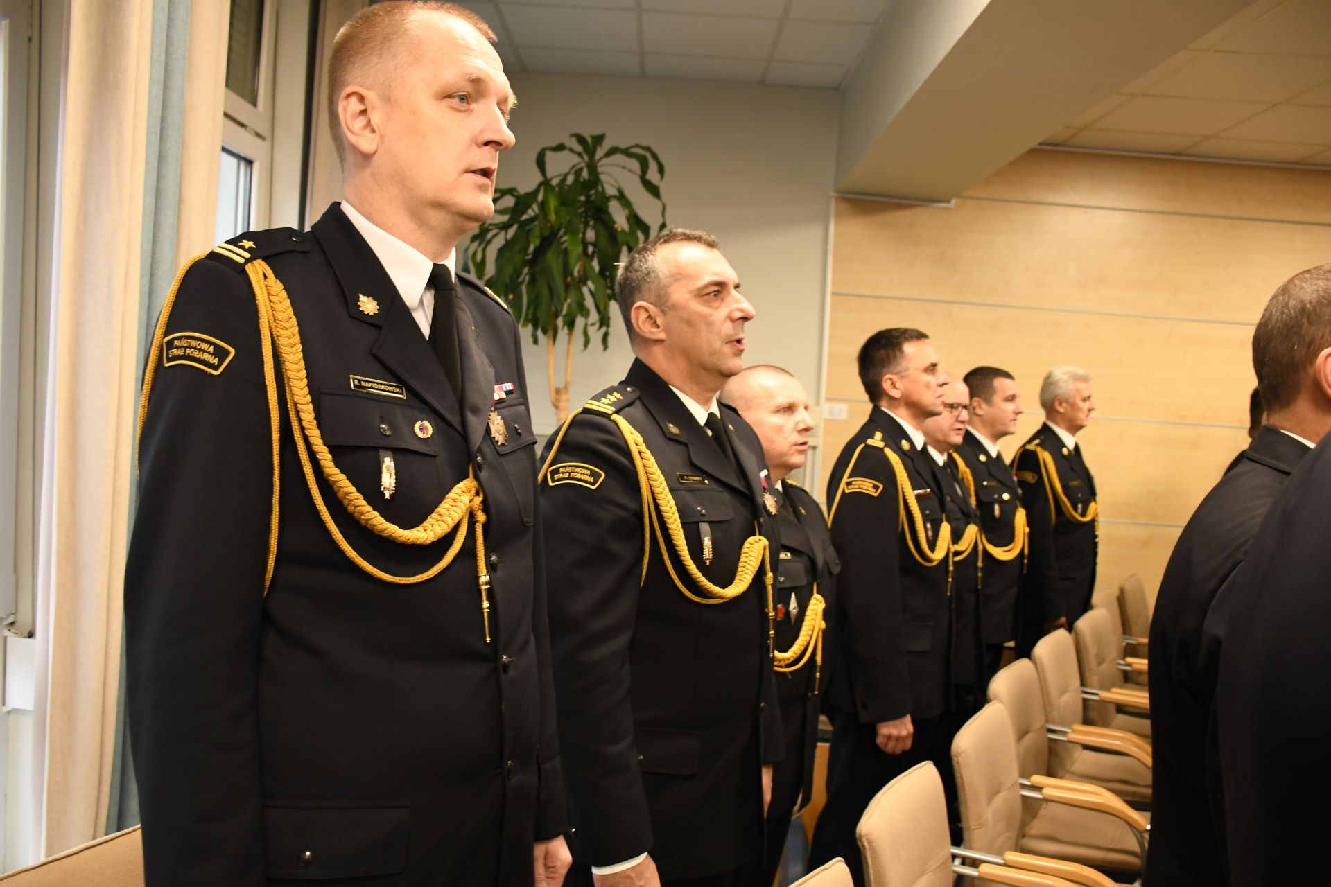 We wtorek 14 listopada w Urzędzie Wojewódzkim w Olsztynie odbyła się uroczysta zbiórka z okazji Narodowego Święta Niepodległości. Uroczystość rozpoczęła się od złożenia meldunku Piotrowi Opaczewskiemu Wicewojewodzie Warmińsko-Mazurskiemu o gotowości pododdziału do zbiórki, po czym odśpiewano hymn państwowy. Następnie nadbryg. Tomasz Komoszyński Warmińsko-Mazurski Komendant Wojewódzki Państwowej Straży Pożarnej przywitał zaproszonych gości, między innymi Piotra Opaczewskiego Wicewojewodę Warmińsko-Mazurskiego wraz z Dyrektorami urzędu, Barbarę Gawlicką Prezes Stowarzyszenia Rodzina Katyńska w Olsztynie wraz z Ryszardem Bombą członkiem zarządu stowarzyszenia oraz dh. Macieja Jasińskiego Dyrektora Zarządu Wykonawczego ZOSP RP w Olsztynie, a także kierownictwo Komendy Wojewódzkiej PSP w Olsztynie i kadrę kierowniczą PSP z woj. warmińsko-mazurskiego i pozostałych zgromadzonych. W rocznicowy, niepodległościowy nastrój uczestników uroczystości wprowadziła Prezes Barbara Gawlicka, która przedstawiła referat na temat walki o niepodległość Polski. Kolejnym punktem zbiórki było wręczenie funkcjonariuszom i pracownikom PSP oraz druhom Ochotniczych Straży Pożarnych z naszego województwa odznaczeń państwowych i resortowych. Ponadto strażacy PSP otrzymali awanse na wyższe stopnie służbowe oraz indywidualne wyróżnienia. Podczas uroczystości Komendant Wojewódzki PSP w Olsztynie wręczył st. kpt. Łukaszowi Zaniewskiemu akt powołania na stanowisko Zastępcy Komendanta Powiatowego PSP w Ostródzie. Wyjątkową chwilą podczas uroczystości było, wręczenie przez Członków Zarządu Stowarzyszenia Rodzina Katyńska w Olsztynie nadbryg. Tomaszowi Komoszyńskiemu repliki „Orła Katyńskiego”, który został odnaleziony w Charkowie podczas ekshumacji polskich oficerów, w dowód uznania za dbałość i pamięć o poległych za niepodległość Polski. Na zakończenie głos zabrał Wicewojewoda Piotr Opaczewski, który podziękował strażakom PSP i strażakom ochotnikom za codzienne poświęcenie i zaangażowanie w służbie dla dobra społeczeństwa.