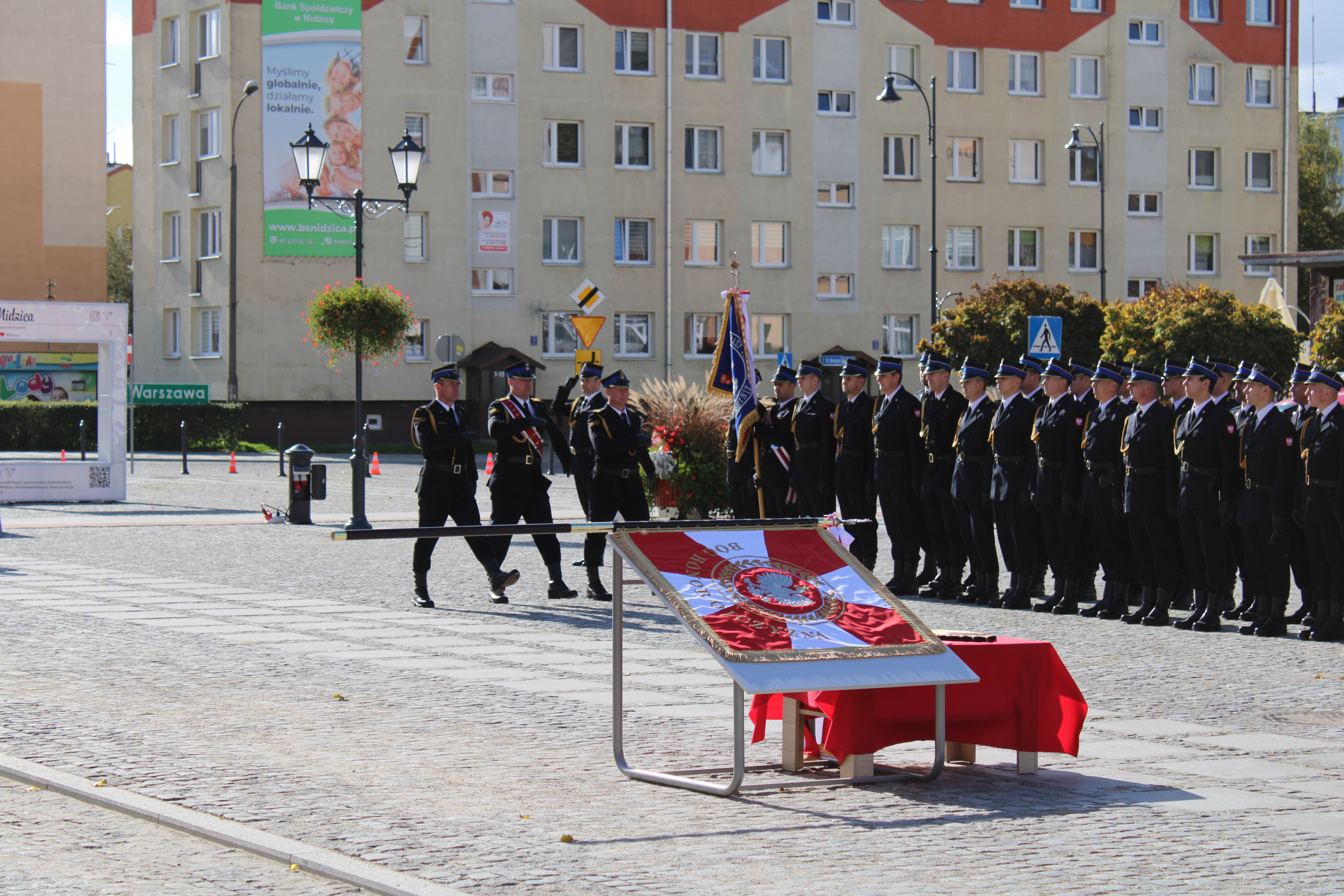 Uroczystość rozpoczęła się mszą świętą, po której nastąpiło paradne przejście uczestników na plac miejski. Akt ufundowania sztandaru odczytał Przewodniczący Społecznego Komitetu Fundacji Sztandaru – Pan Marcin Paliński, Starosta Nidzicki i Prezes ZOP ZOSP RP w Nidzicy. Zabierając głos Pan Minister Błażej Poboży podkreślił znaczenie symboliki nadawanego sztandaru, a także podziękował strażakom za ich postawę i zaangażowanie. Warmińsko-Mazurski Komendant Wojewódzki PSP – nadbryg. Tomasz Komoszyński odczytał list Komendanta Głównego PSP, gen. brygadiera Andrzeja Bartkowiaka skierowany do strażaków i pracowników nidzickiej komendy oraz podziękował za organizację i sprawne przeprowadzenie całego przedsięwzięcia związanego z nadaniem Sztandaru KP PSP w Nidzicy.
