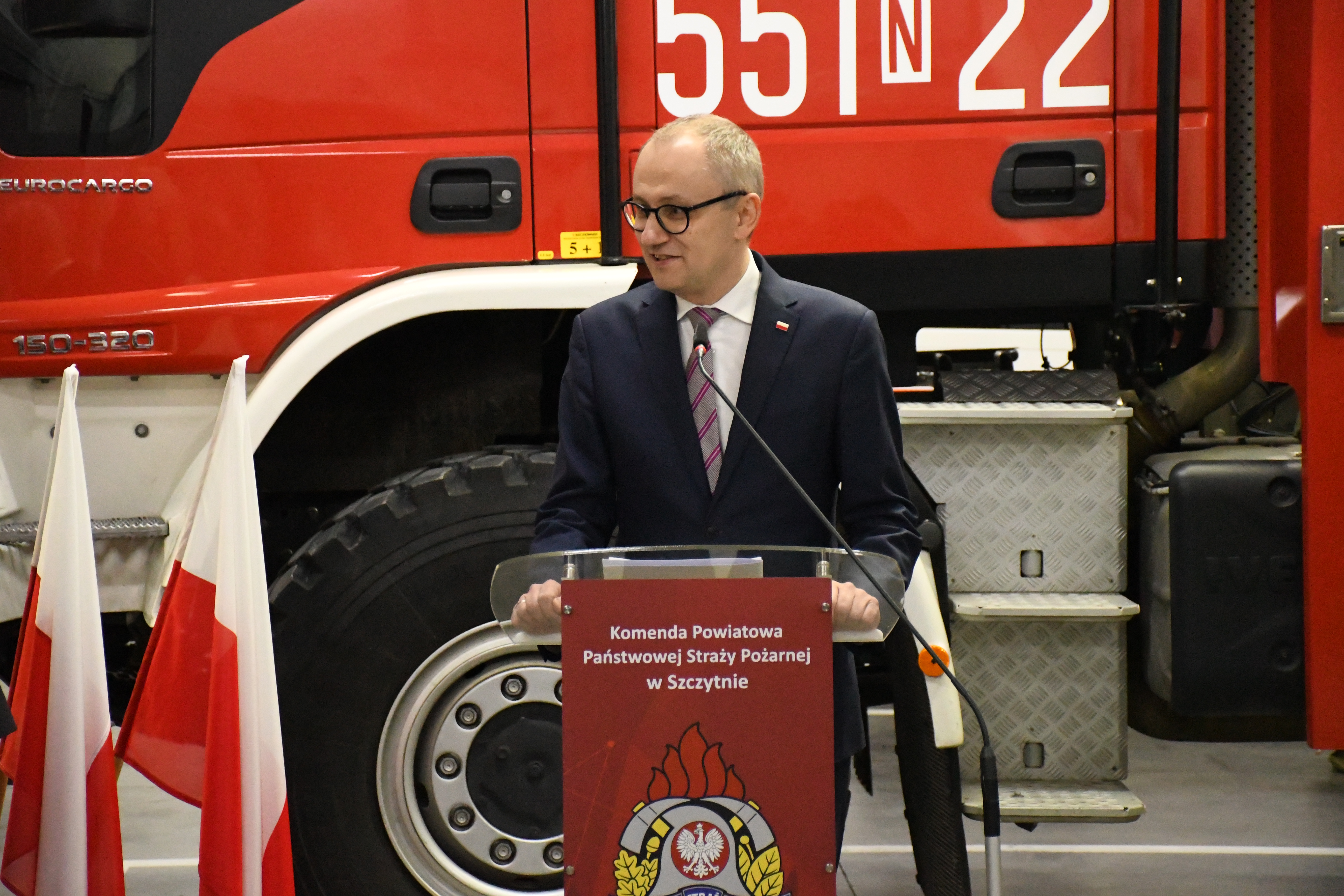 Na drugiej uroczystej zbiórce, tym razem w Szczytnie, oficjalnie przekazano kolejne dwa pojazdy pożarnicze. Do szczycieńskiej Komendy Powiatowej PSP trafił fabrycznie nowy ciężki samochód ratowniczo-gaśniczy na podwoziu MAN 4x4, a strażacy ochotnicy z OSP Nowe Kiejkuty otrzymali ciężki samochód ratowniczo-gaśniczy na podwoziu Scania, który był użytkowany przez Komendę Powiatową PSP w Szczytnie. Ponadto podczas uroczystości wyróżniającym się strażakom z KP PSP Szczytno nadano odznaczenia państwowe i resortowe. W imieniu Prezydenta RP i Ministra Spraw Wewnętrznych i Administracji aktów dekoracji wyróżnionych dokonał Błażej Poboży Podsekretarz Stanu w MSWiA w asyście nadbryg. Tomasza Komoszyńskiego Warmińsko-Mazurskiego Komendanta Wojewódzkiego PSP.