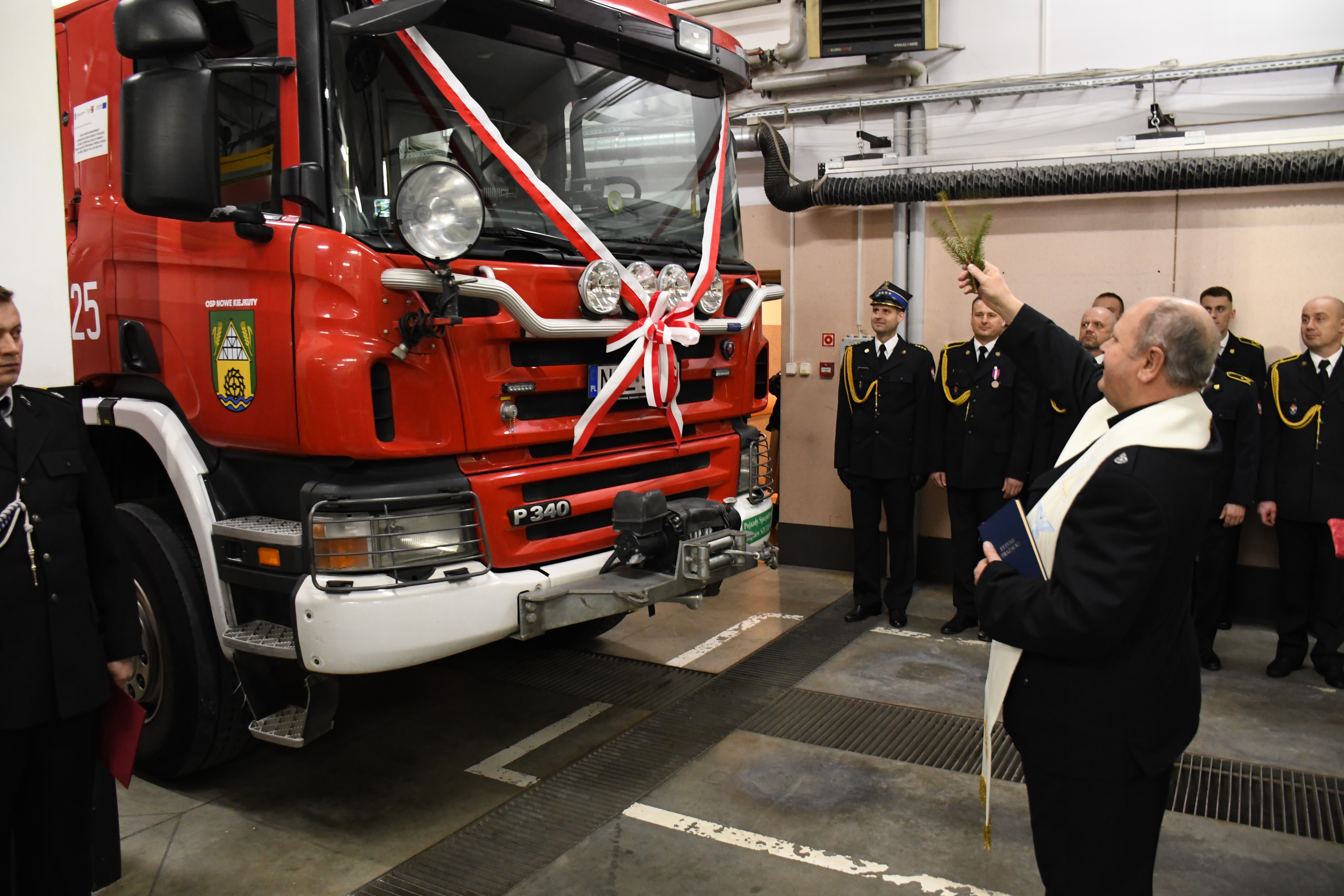 Uroczyste przekazanie samochodów pożarniczych komendom powiatowym PSP w Mrągowie i Szczytnie oraz jednostkom OSP w Woźnicach i Nowych Kiejkutach