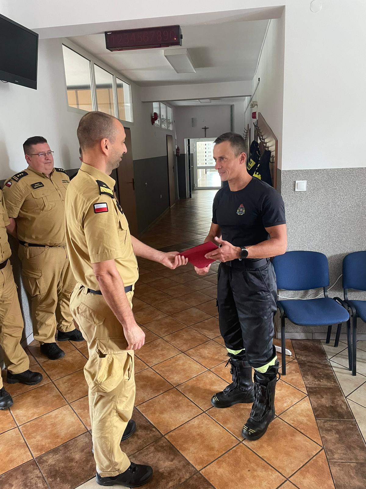 Podczas spotkania z załogą nadbryg. Michał Kamieniecki wręczył wyróżnienia dwóm funkcjonariuszom ełckiej Komendy Powiatowej PSP.
