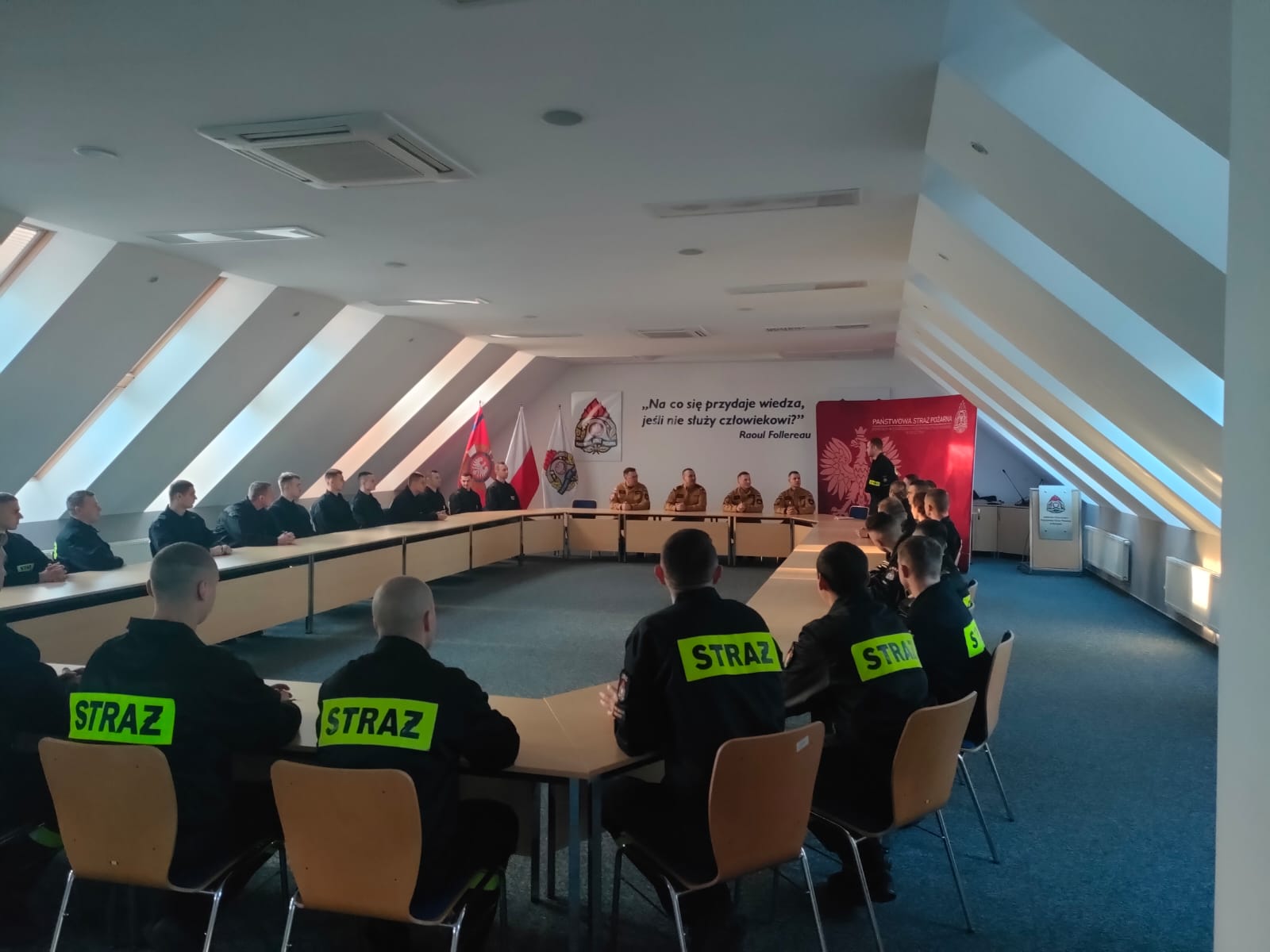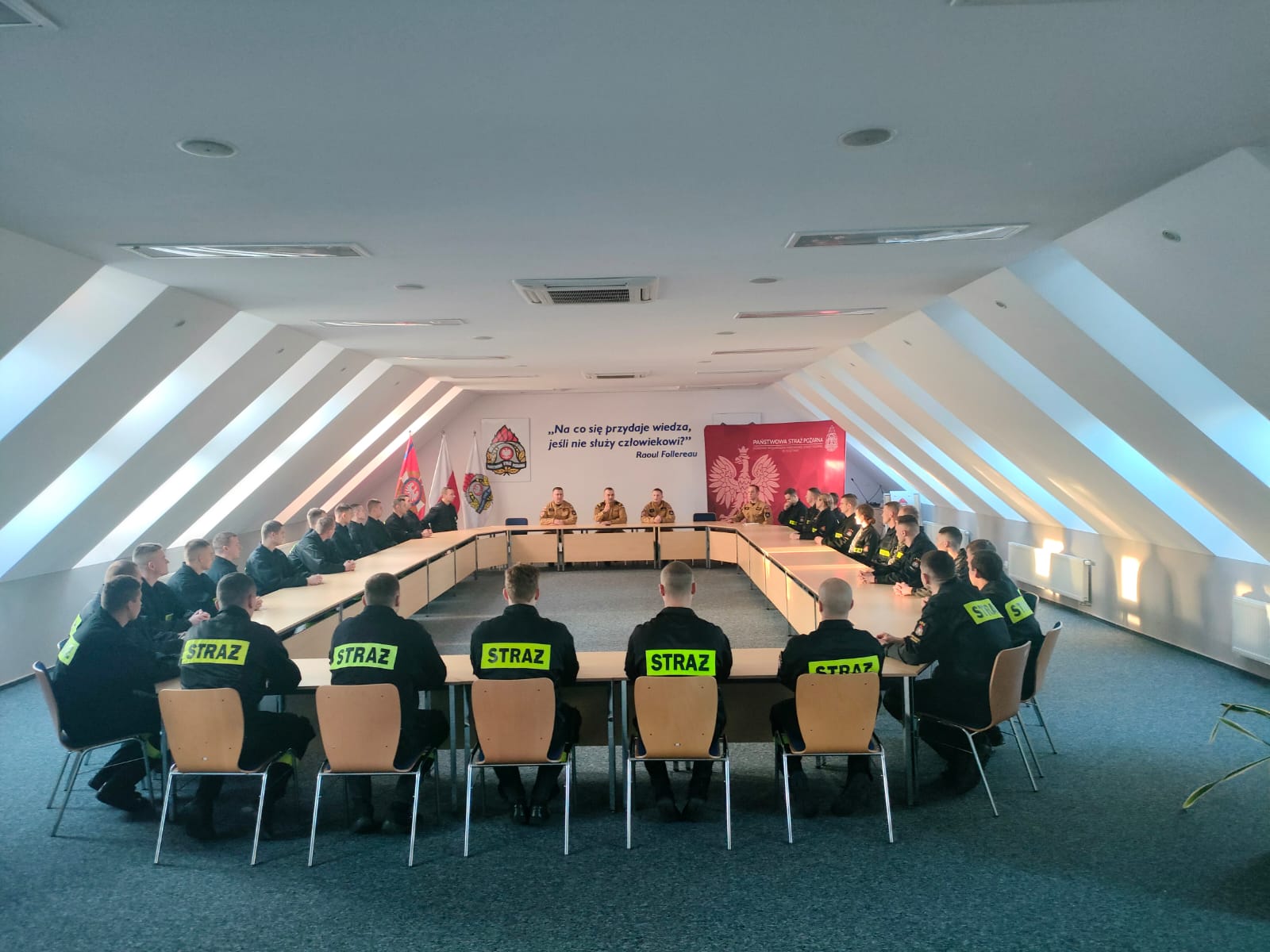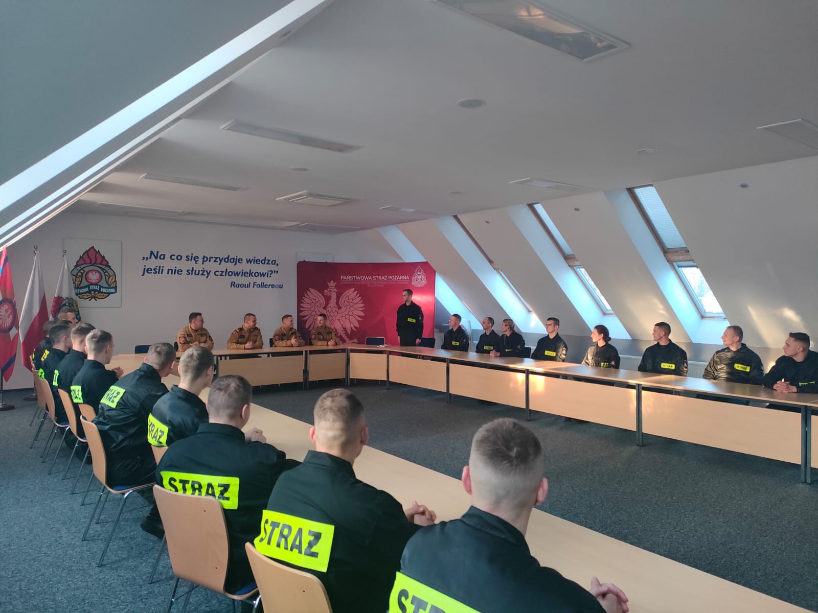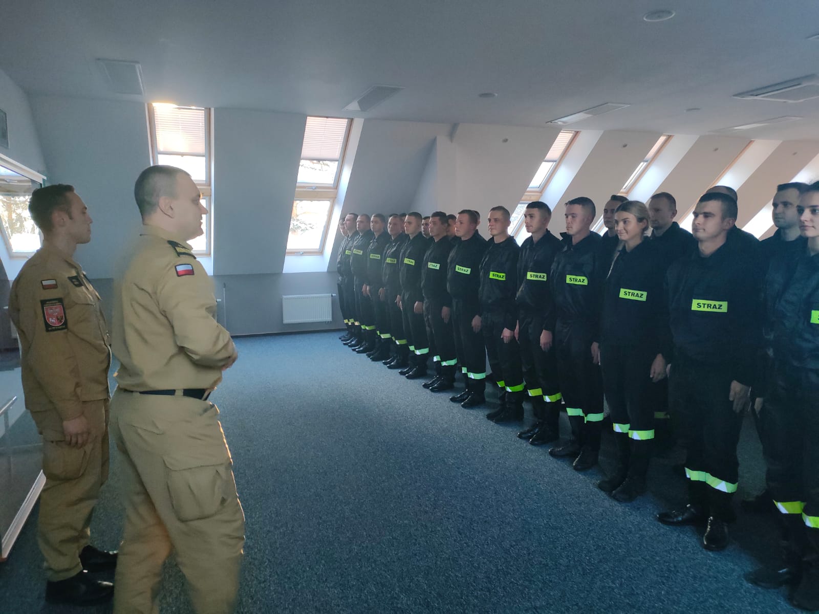 Warmińsko-Mazurski Komendant Wojewódzki Państwowej Straży Pożarnej nadbryg. Tomasz Komoszyński wraz ze swoim Zastępcą st. bryg. Tomaszem Ostrowskim wizytowali Ośrodek Szkolenia Komendy Wojewódzkiej PSP w Olsztynie, w którym obecnie trwa szkolenie podstawowe w zawodzie strażak. Komendanci spotkali się z kadrą ośrodka i zapoznali się z etapem, na jakim obecnie jest przebieg szkolenia. Nie zabrakło też spotkania słuchaczy z Generałem Komoszyńskim i jego Zastępcą. Komendanci w rozmowie z kursantami pytali ich między innymi o samopoczucie, ciężar szkolenia oraz warunki socjalne. Jak przekazali przyszli adepci szkolenia, samopoczucie mają znakomite, kadra jest merytoryczna i wymagająca, a na warunki nikt nie narzeka.