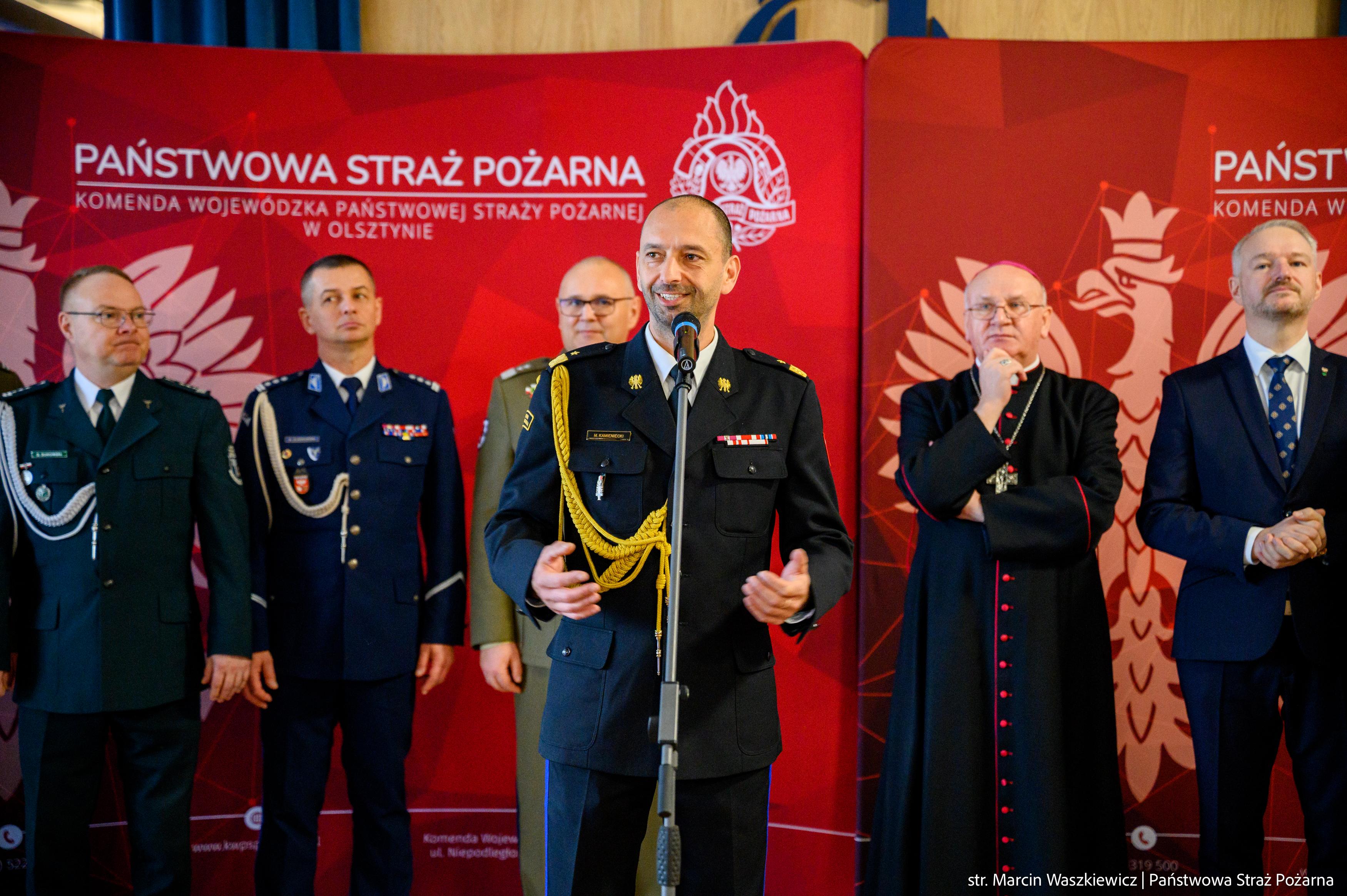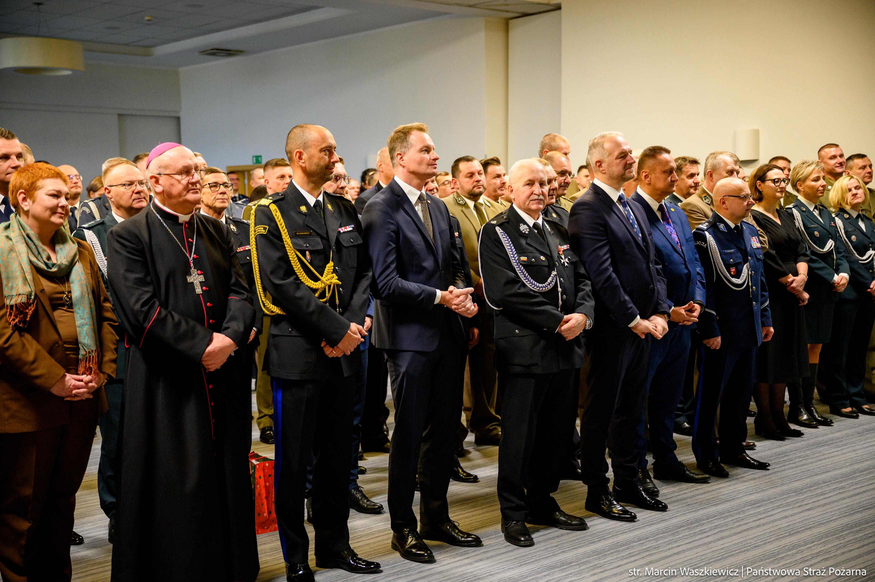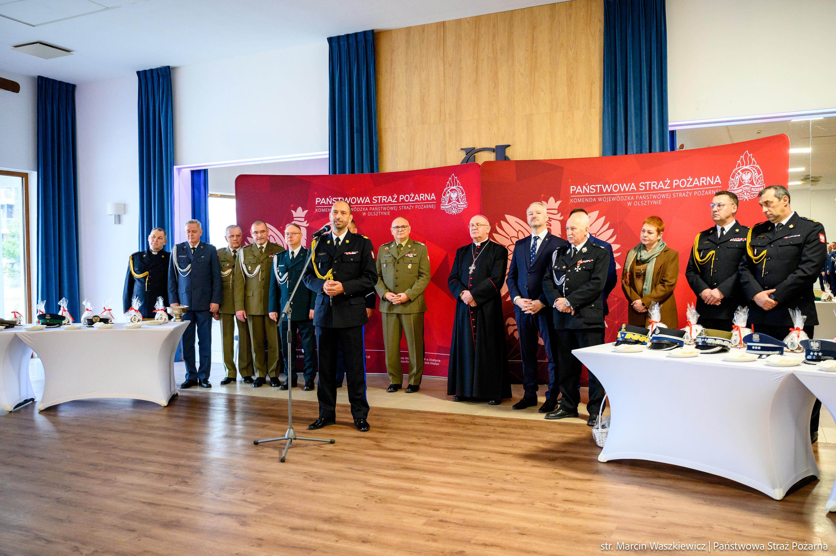 Zgromadzonych na spotkaniu opłatkowym, jako tegoroczny gospodarz przywitał nadbryg. Michał Kamieniecki Warmińsko-Mazurski Komendant Wojewódzki PSP, a pośród nich obecni byli między innymi: