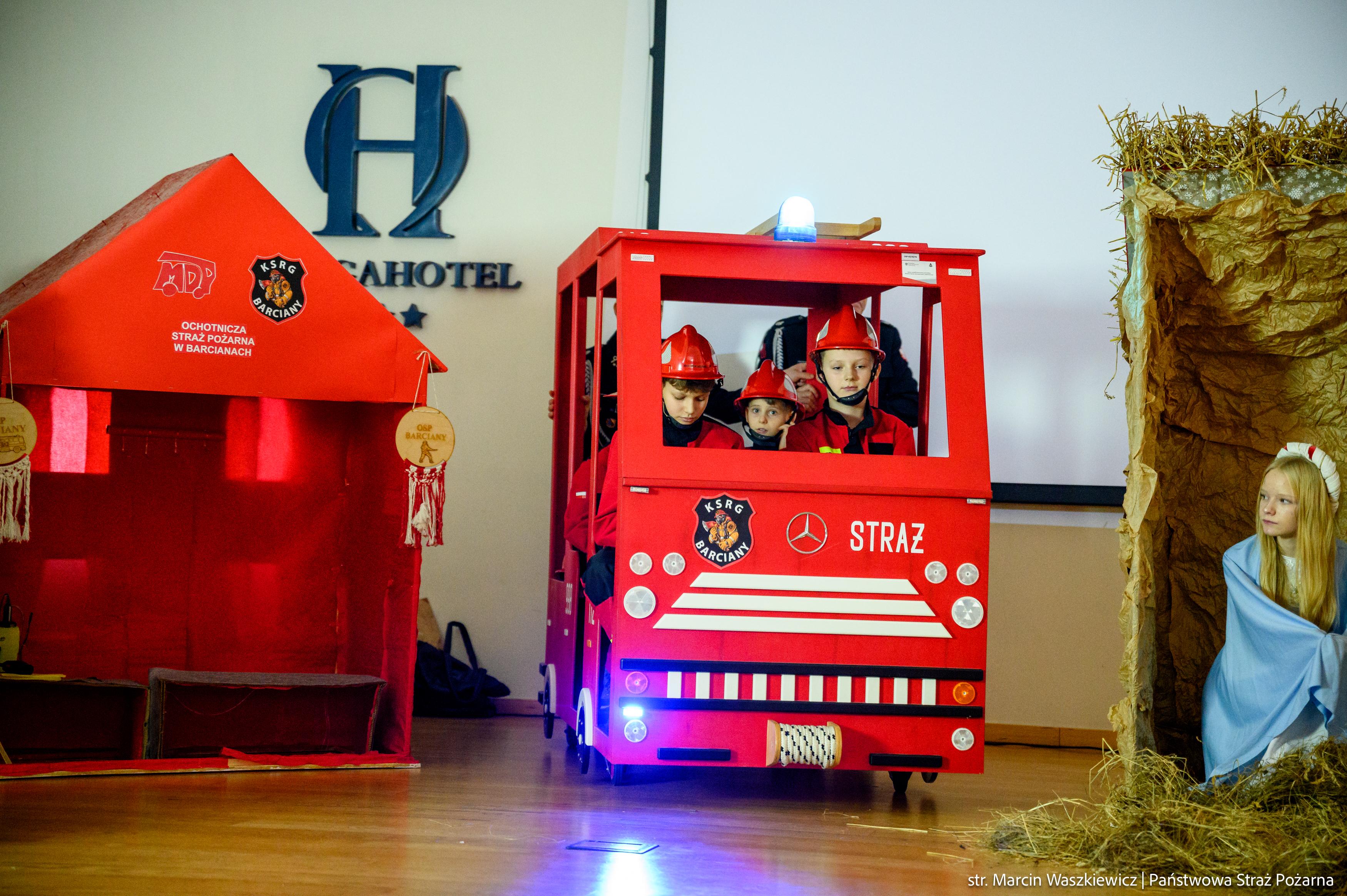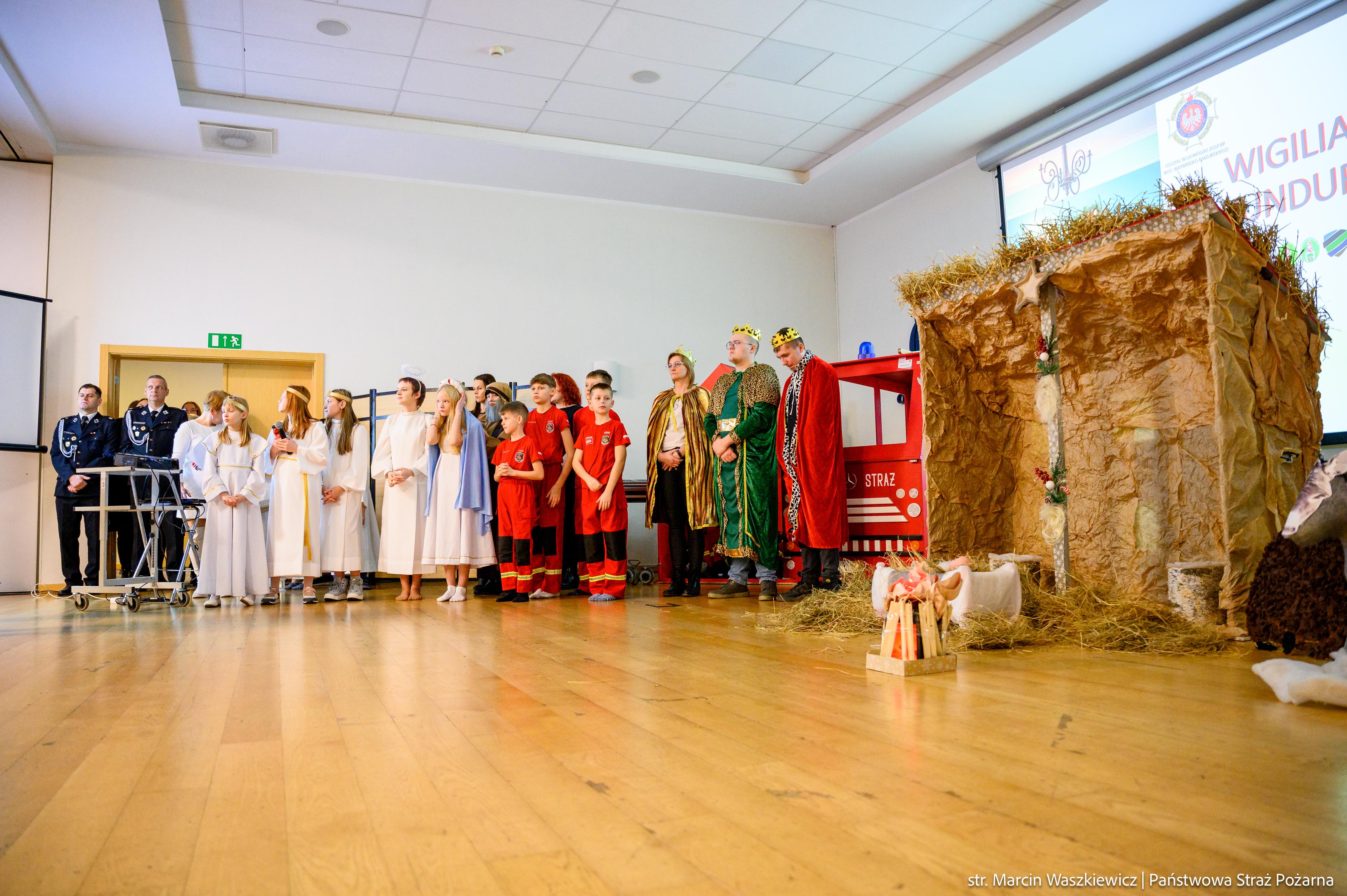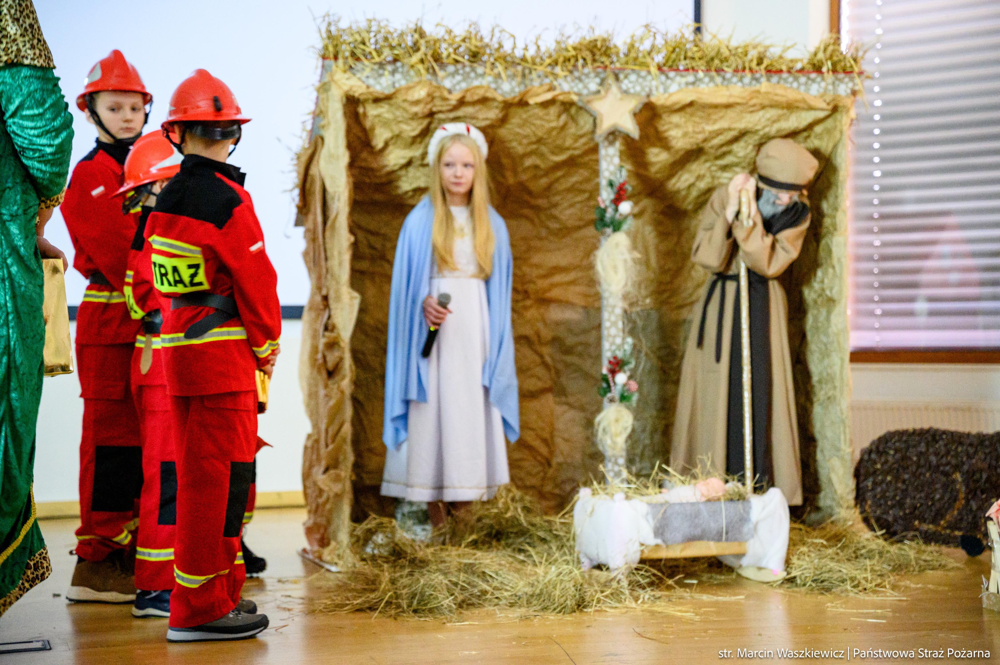 Spotkanie rozpoczęło się od przedstawienia jasełek ze szczyptą pożarniczej służby z przymrużeniem oka w wykonaniu dzieci i ich opiekunów z Młodzieżowej Drużyny Pożarniczej przy Ochotniczej Straży Pożarnej w Barcianach.