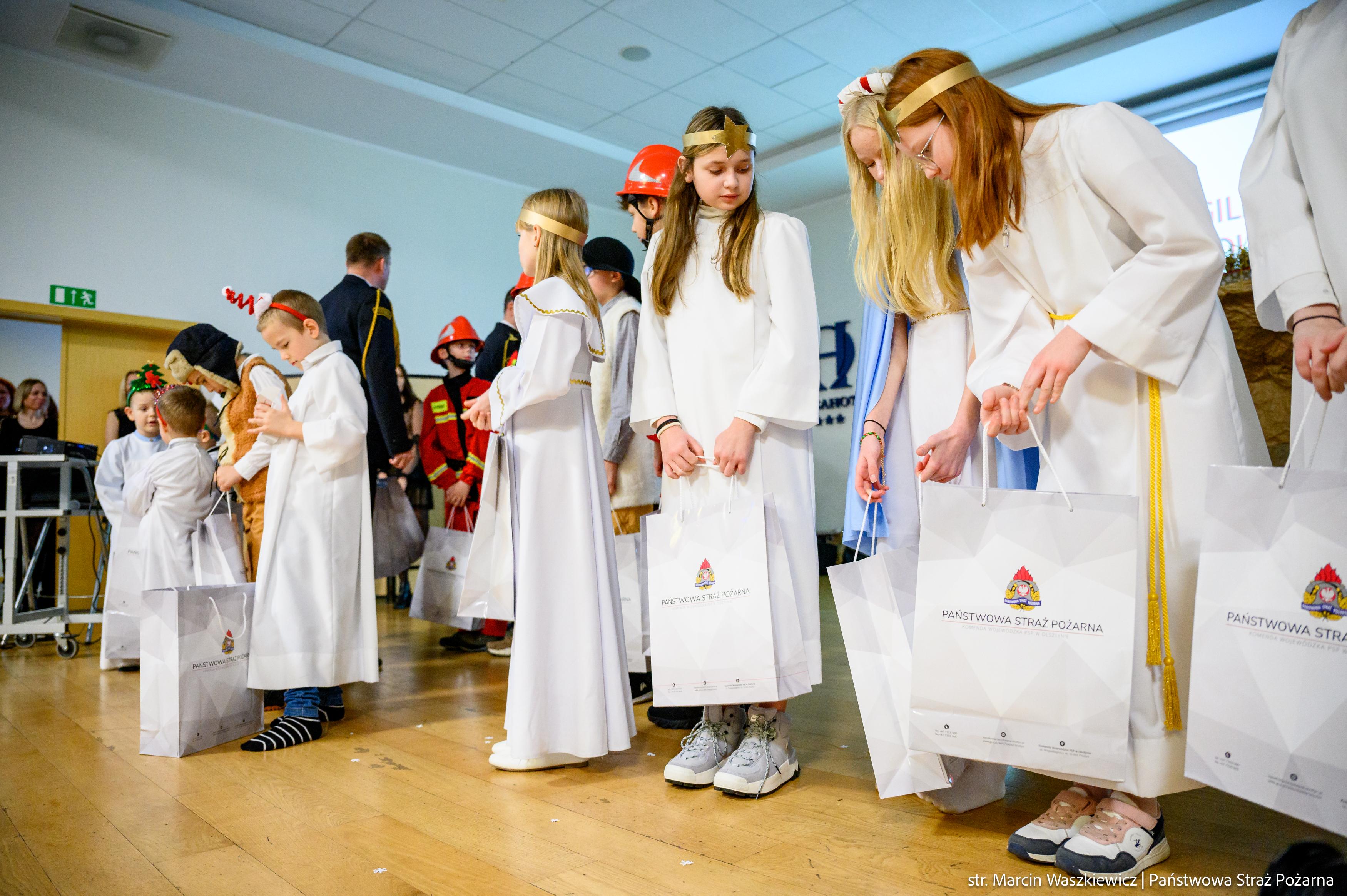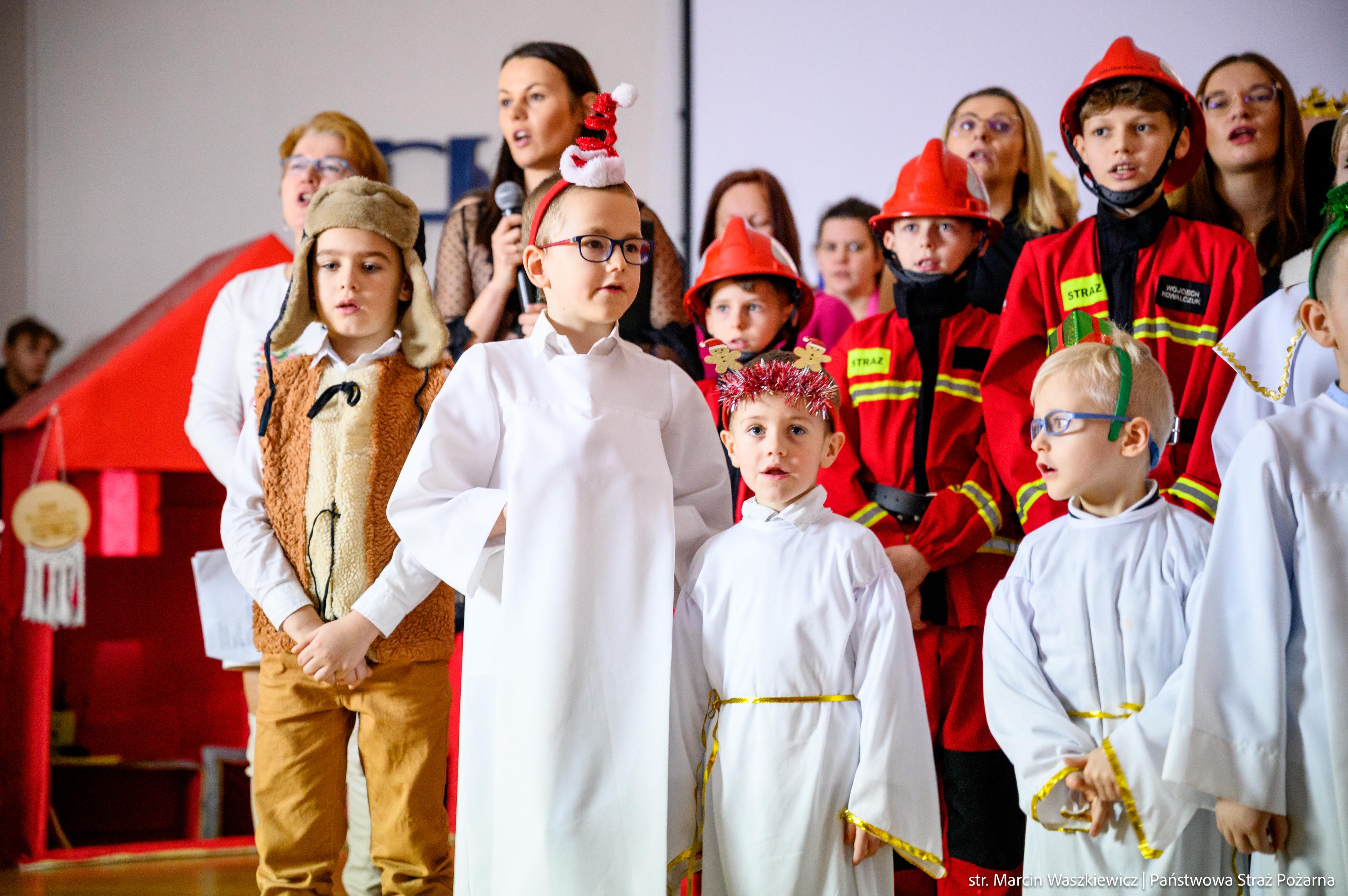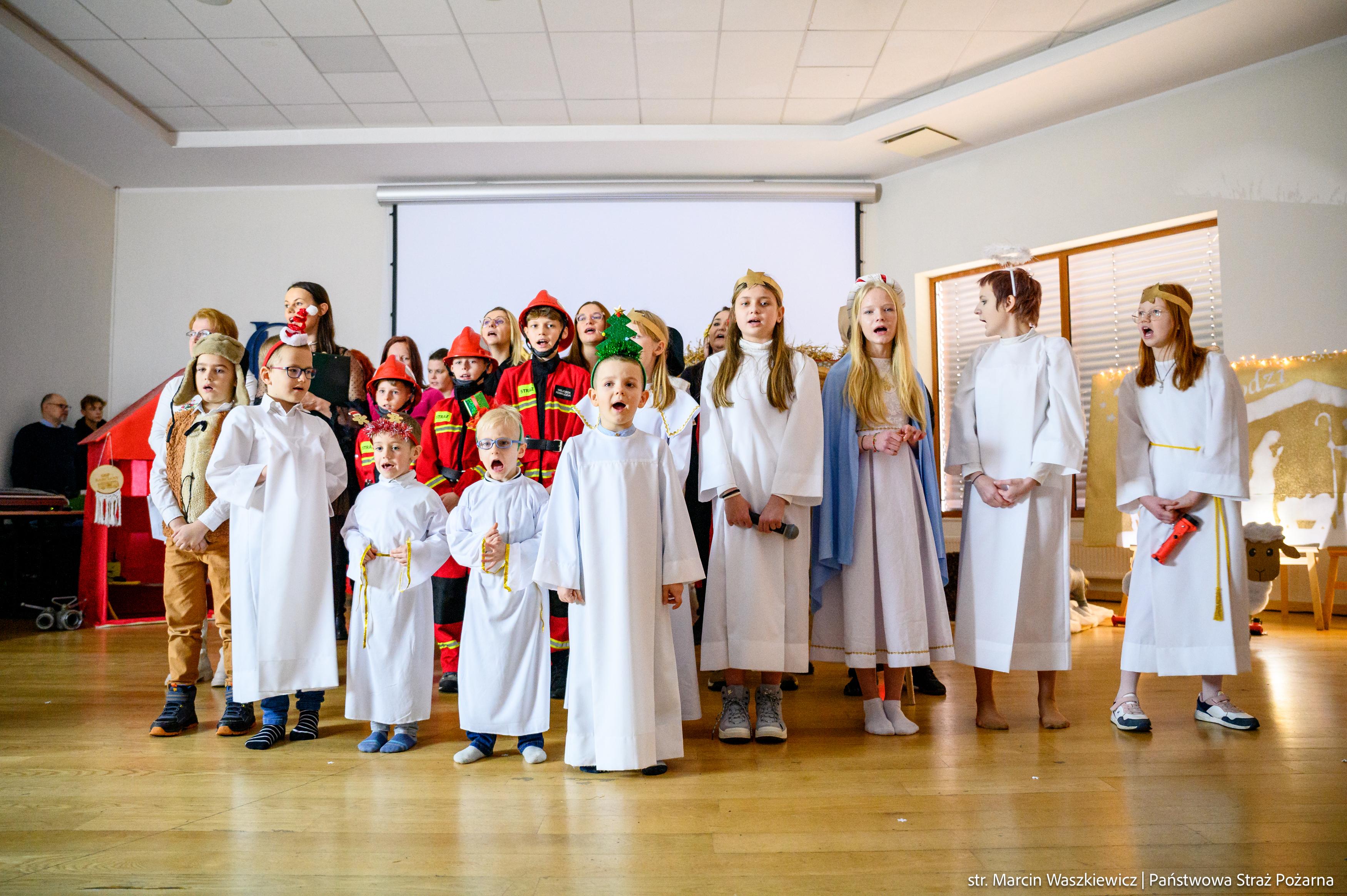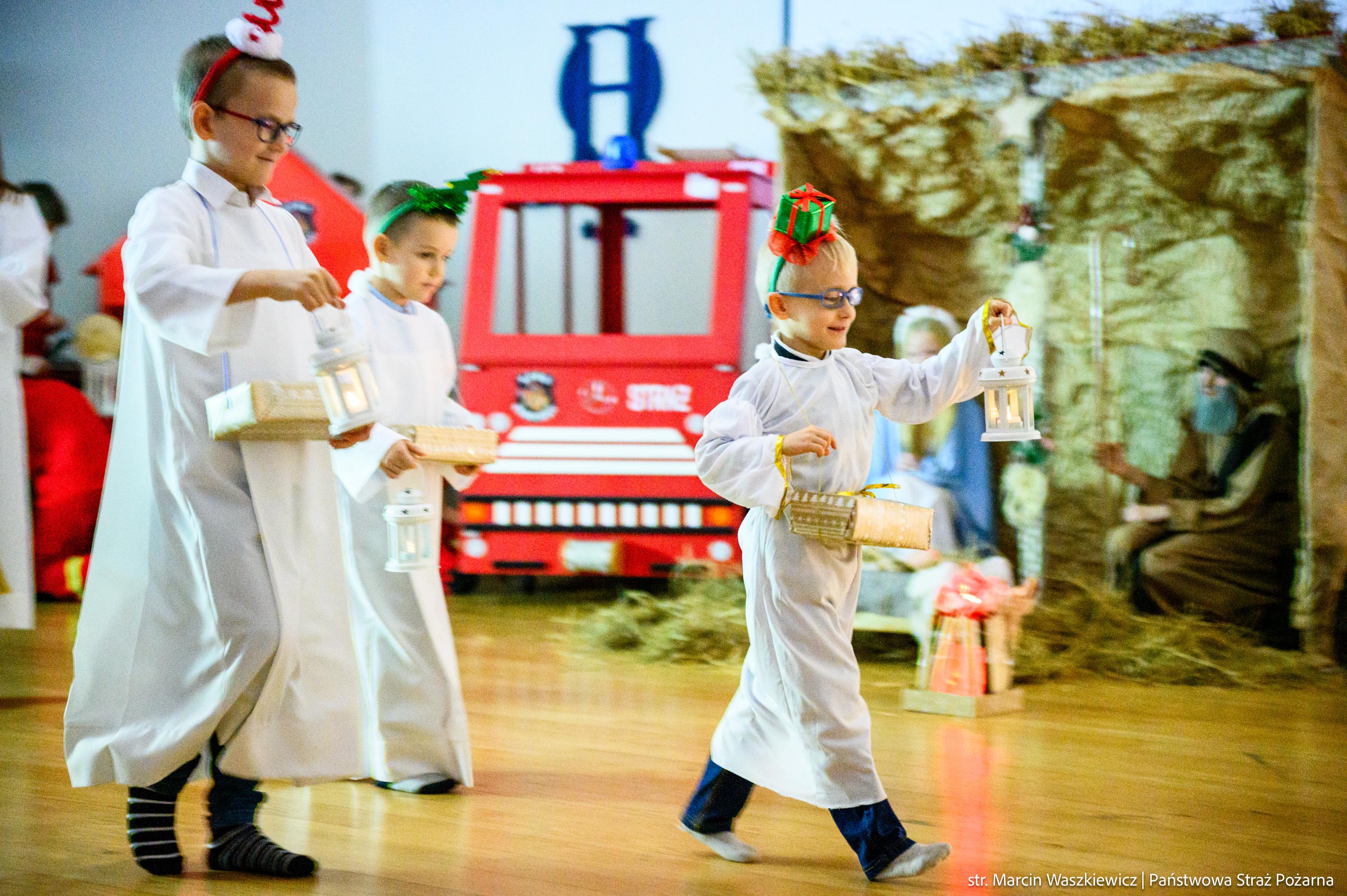 Spotkanie rozpoczęło się od przedstawienia jasełek ze szczyptą pożarniczej służby z przymrużeniem oka w wykonaniu dzieci i ich opiekunów z Młodzieżowej Drużyny Pożarniczej przy Ochotniczej Straży Pożarnej w Barcianach.