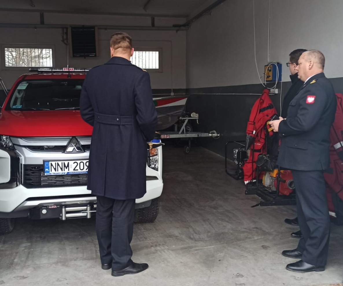 Podczas wizytacji Pan Robert Gontarz oraz st. bryg. Adam Jastrzębski dokonali przeglądu sprzętu i warunków lokalowych w tym nowo zakupionego lekkiego samochodu rozpoznawczo-ratowniczego MITSUBISHI L200 i pralnicy wraz z suszarką do prania i impregnacji ubrań specjalnych strażaków.