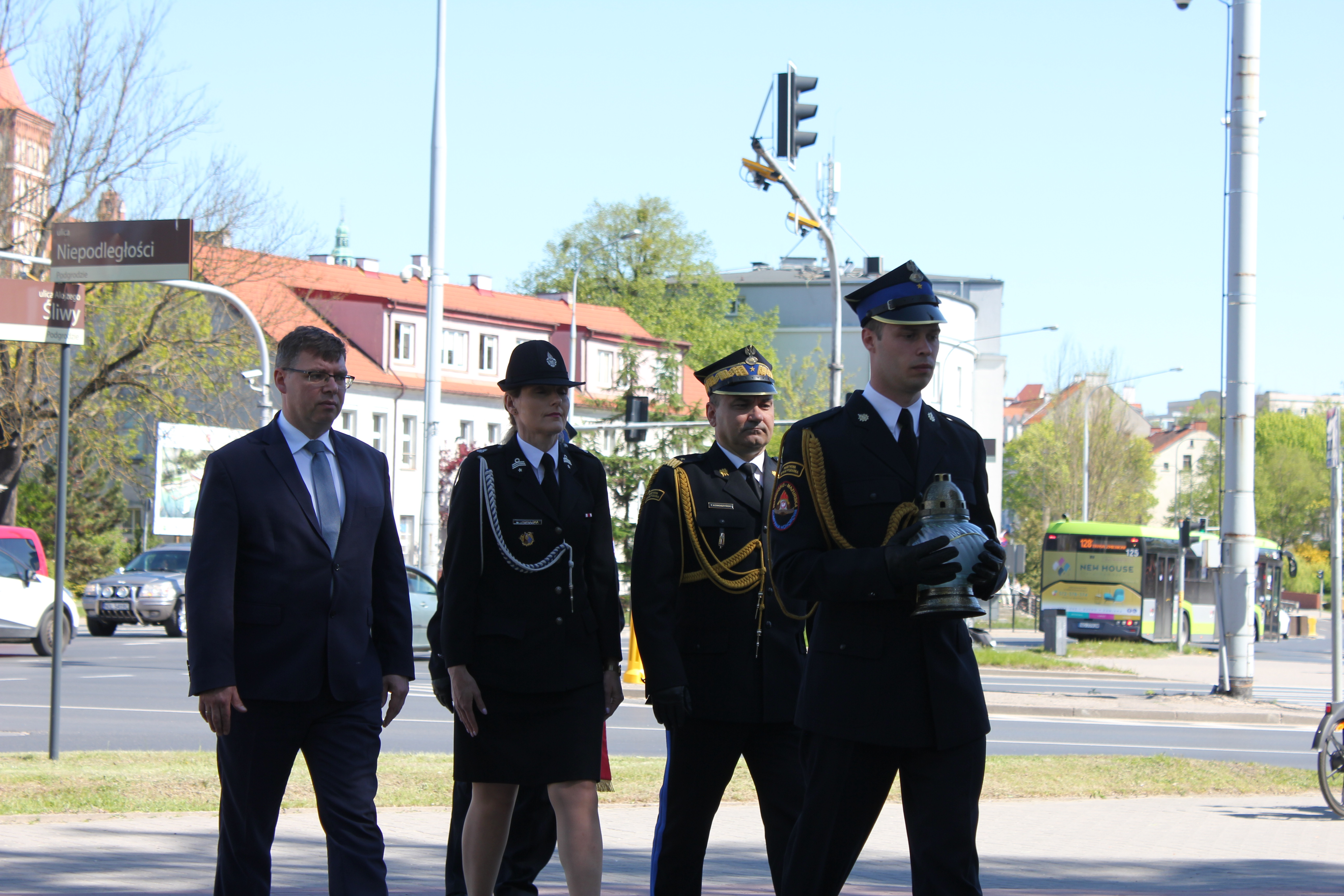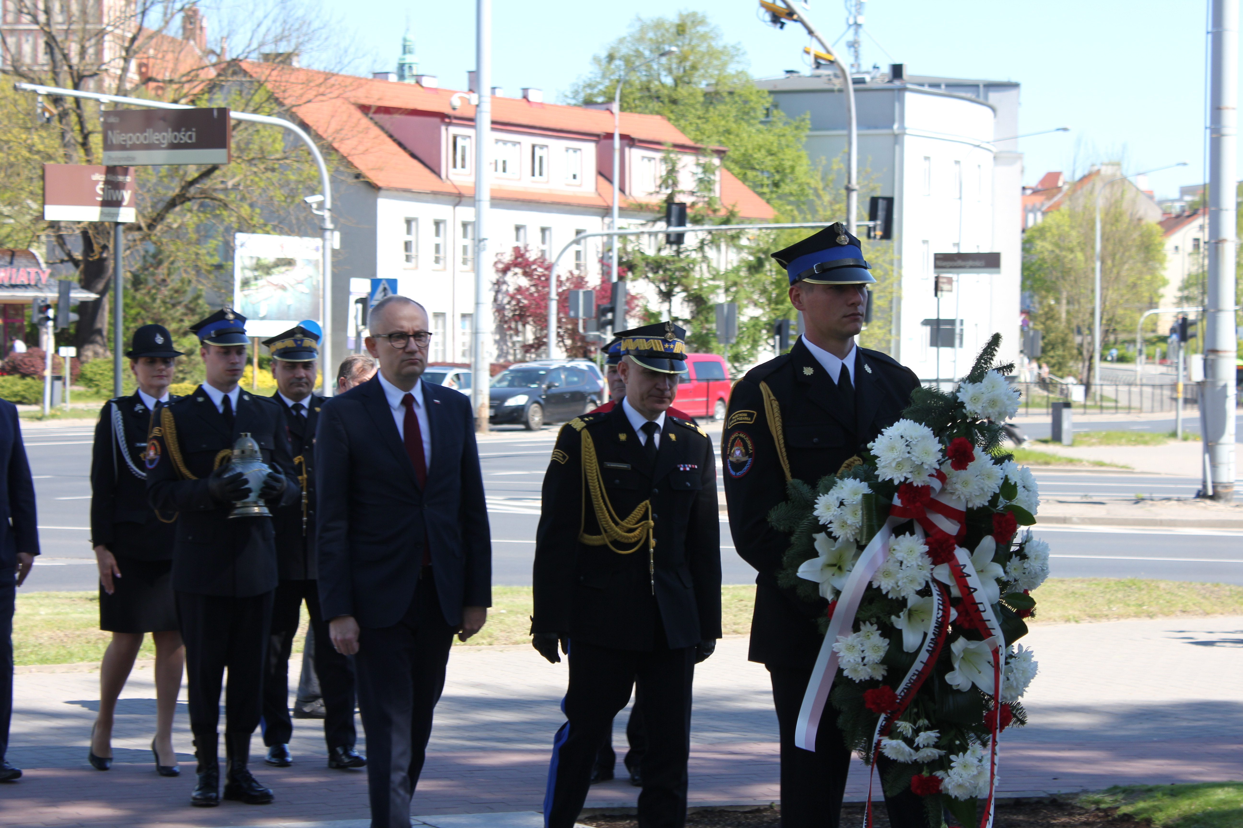 Przed rozpoczęciem uroczystości w dniu 10 maja br. delegacje na czele z Podsekretarzem Stanu w MSWiA – Panem Błażejem Pobożym oraz Komendantem Głównym Państwowej Straży Pożarnej – gen. brygadierem Andrzejem Bartkowiakiem złożyły kwiaty pod Pomnikiem Strażaków Poległych w Akcji, oddając hołd wszystkim strażakom naszego województwa, którzy odeszli na wieczną służbę.