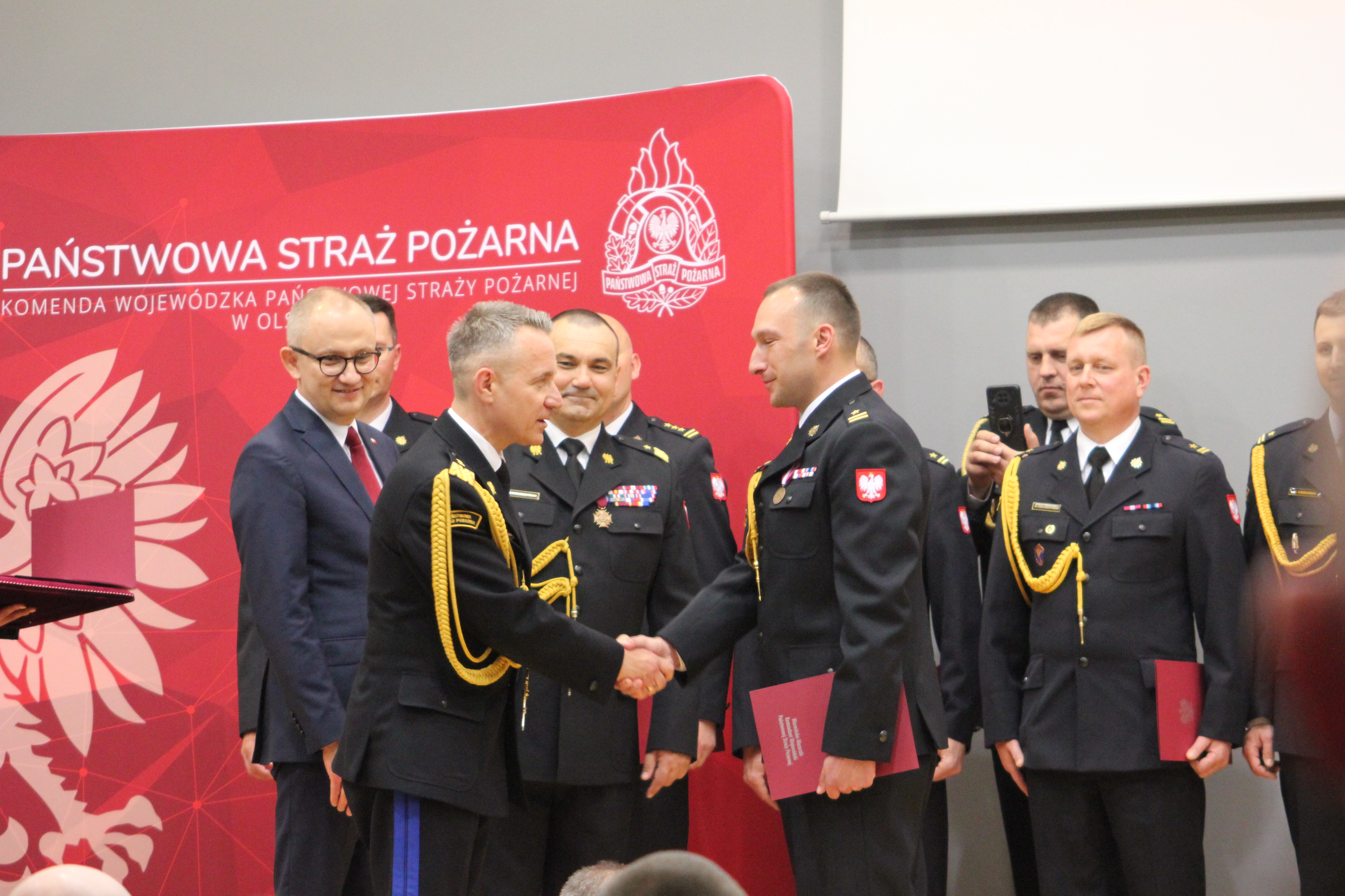 Podczas uroczystości Podsekretarz Stanu w MSWiA – Pan Błażej Poboży, Komendant Główny PSP – gen. brygadier Andrzej Bartkowiak oraz Warmińsko-Mazurski Komendant Wojewódzki PSP – nadbryg. Tomasz Komoszyński wręczyli odznaczanym funkcjonariuszom PSP Medale za Długoletnią Służbę, Odznaki Zasłużony dla Ochrony Przeciwpożarowej, awanse na wyższe stopnie służbowe oraz nagrody finansowe MSWiA i KG PSP, Dyplomy Komendanta Głównego PSP, Dyplomy z okazji 30-lecia powołania PSP, a 5 jednostek OSP otrzymało decyzję o włączeniu ich do krajowego systemu ratowniczo-gaśniczego.