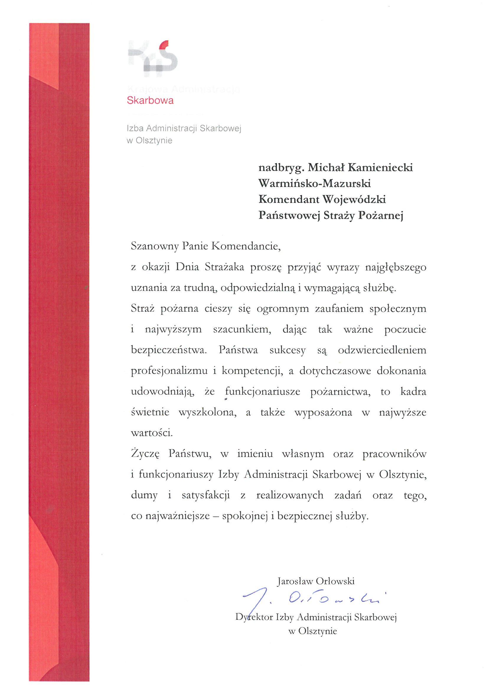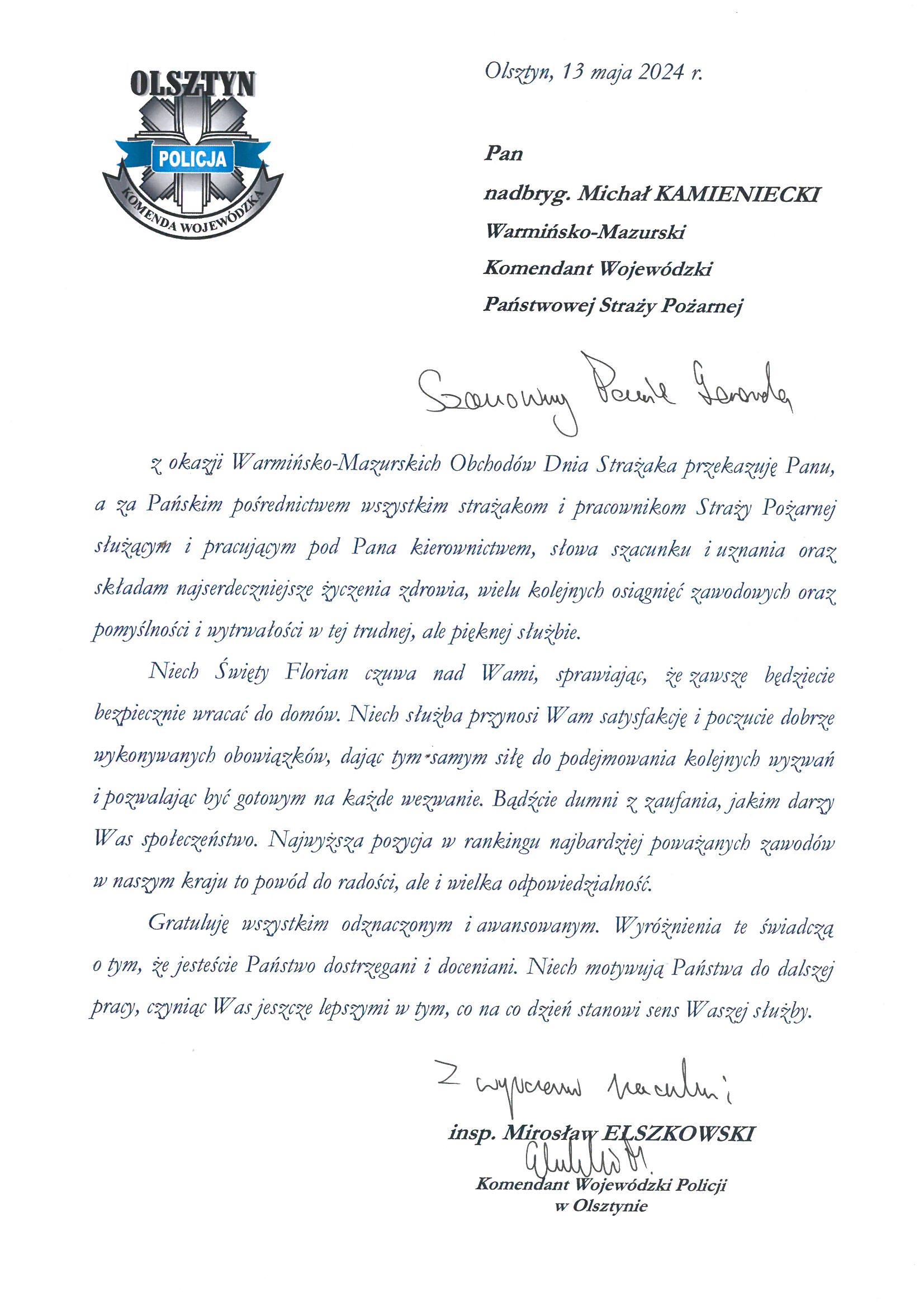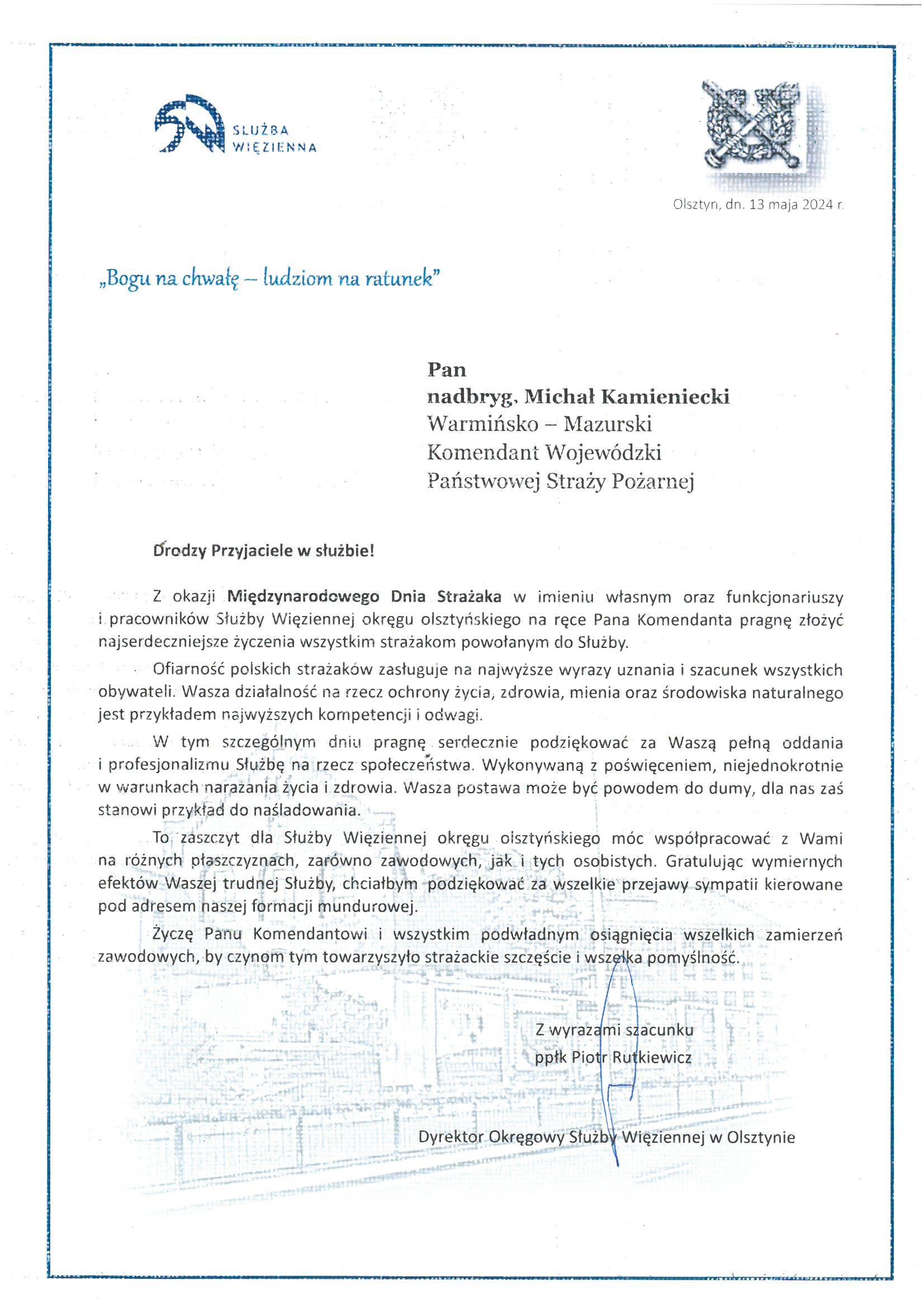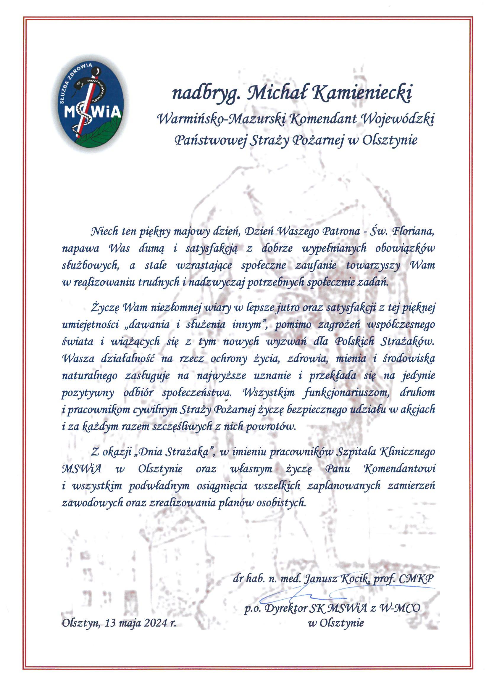 Na ręce nadbryg. Michała Kamienieckiego Warmińsko-Mazurskiego Komendanta Wojewódzkiego Państwowej Straży Pożarnej napłynęły okolicznościowe listy i życzenia z okazji Dnia Strażaka, skierowane do Komendanta Wojewódzkiego PSP, funkcjonariuszy i pracowników PSP z woj. warmińsko-mazurskiego, a także do strażaków Ochotniczych Straży Pożarnych z Warmii i Mazur.