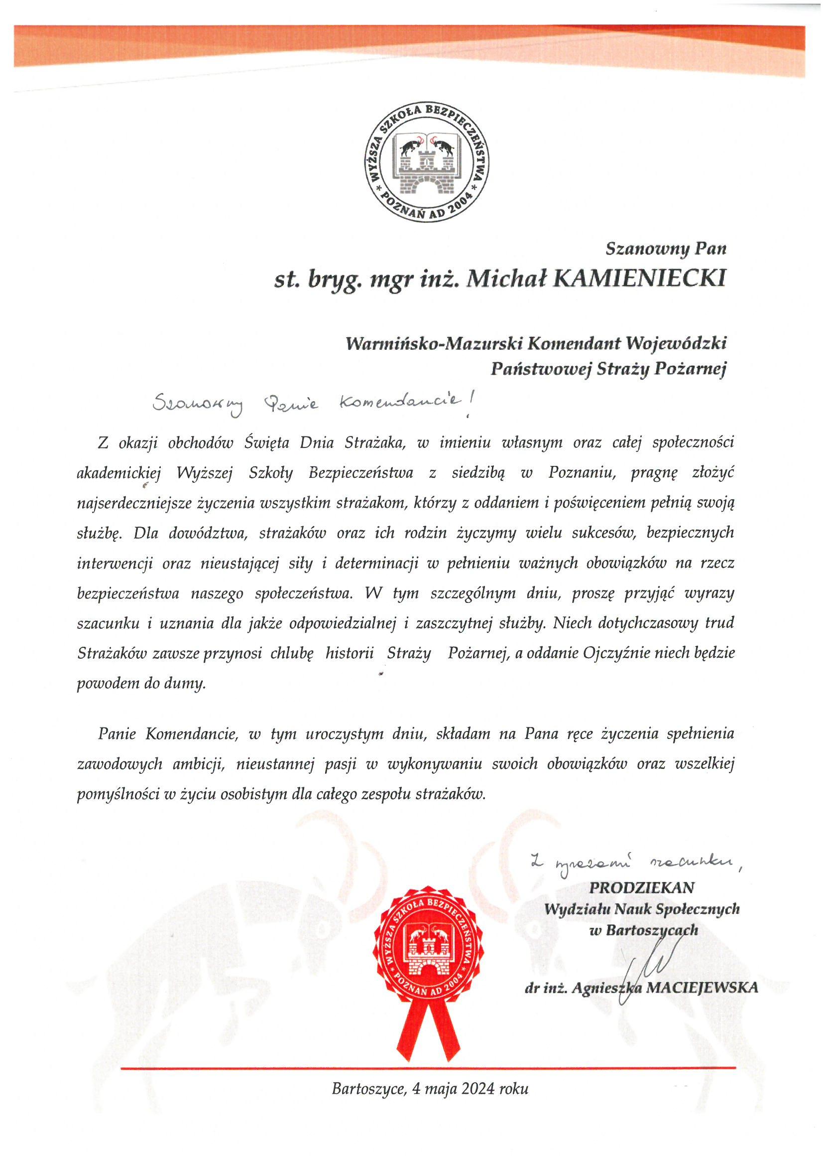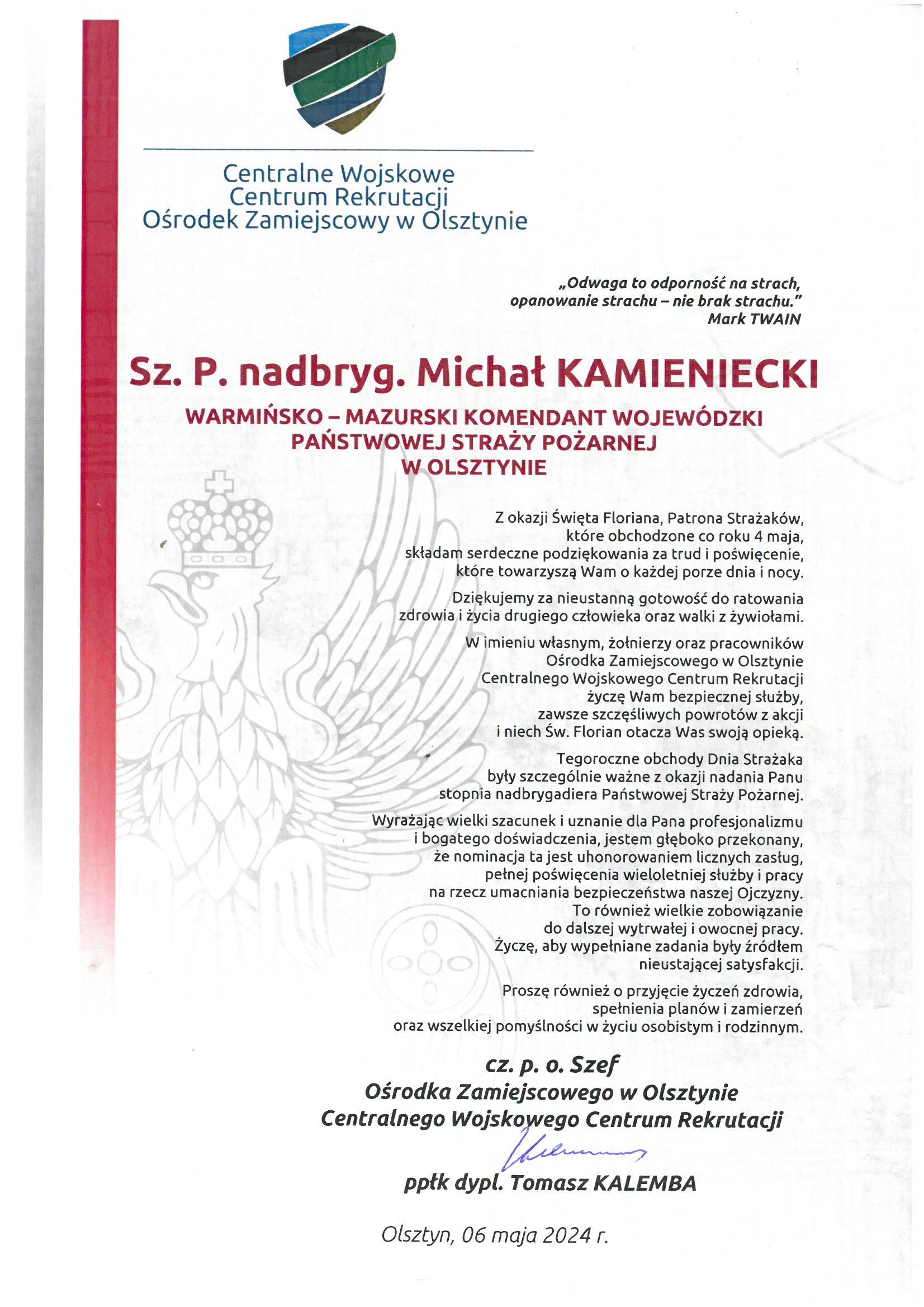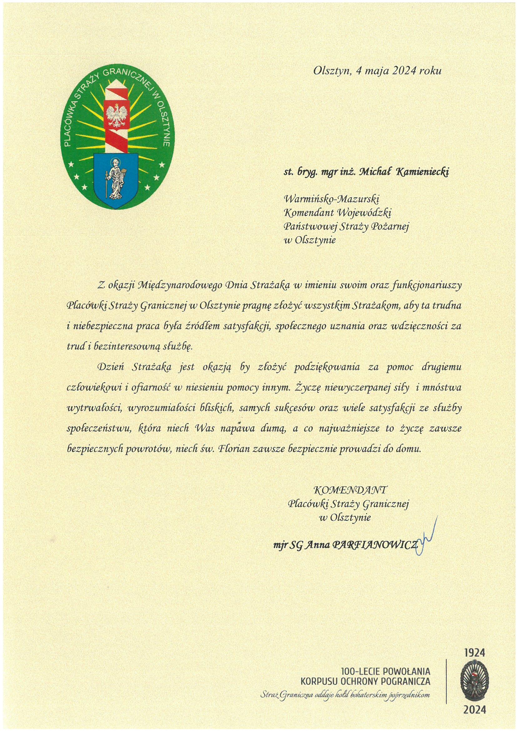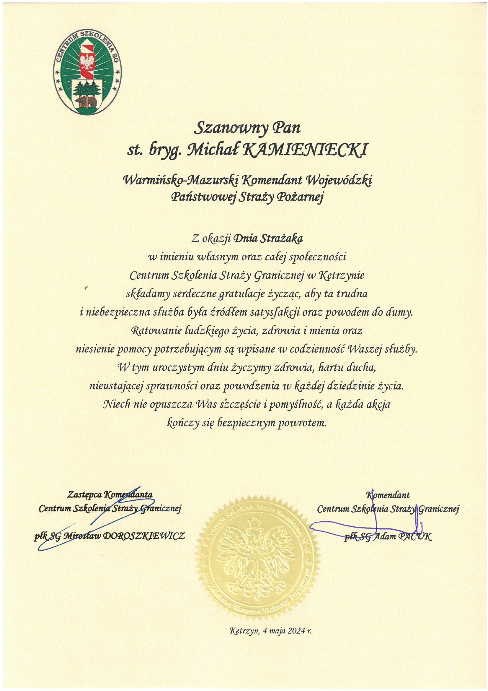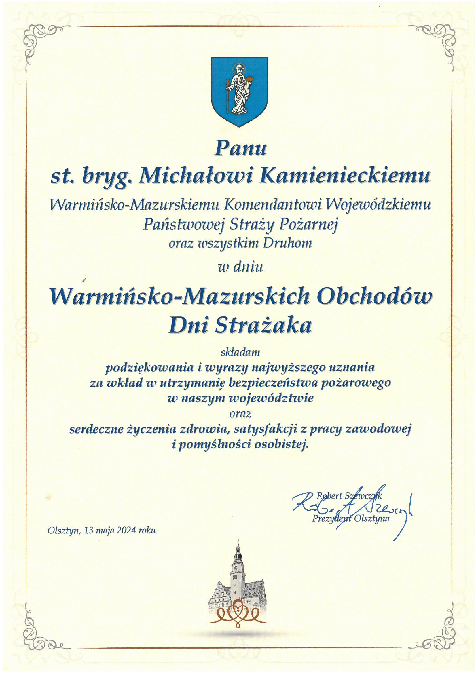 Na ręce nadbryg. Michała Kamienieckiego Warmińsko-Mazurskiego Komendanta Wojewódzkiego Państwowej Straży Pożarnej napłynęły okolicznościowe listy i życzenia z okazji Dnia Strażaka, skierowane do Komendanta Wojewódzkiego PSP, funkcjonariuszy i pracowników PSP z woj. warmińsko-mazurskiego, a także do strażaków Ochotniczych Straży Pożarnych z Warmii i Mazur.
