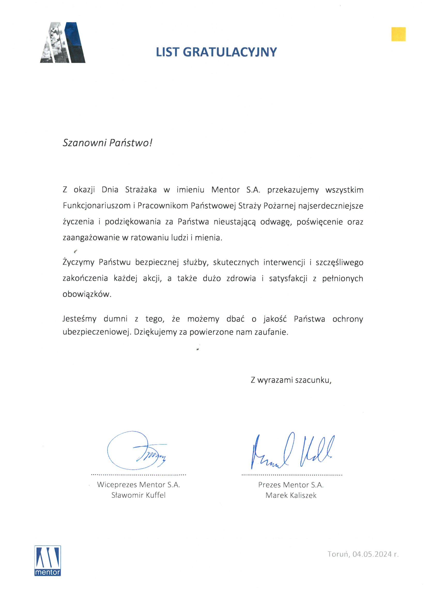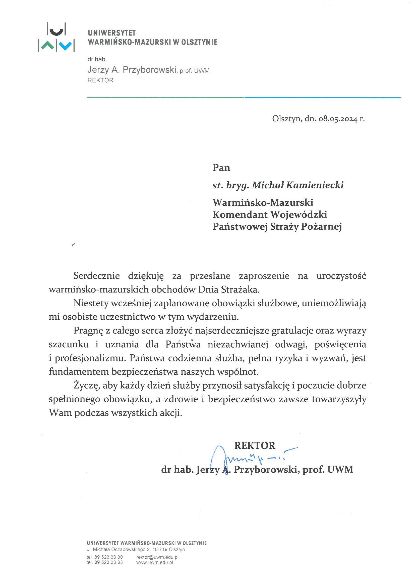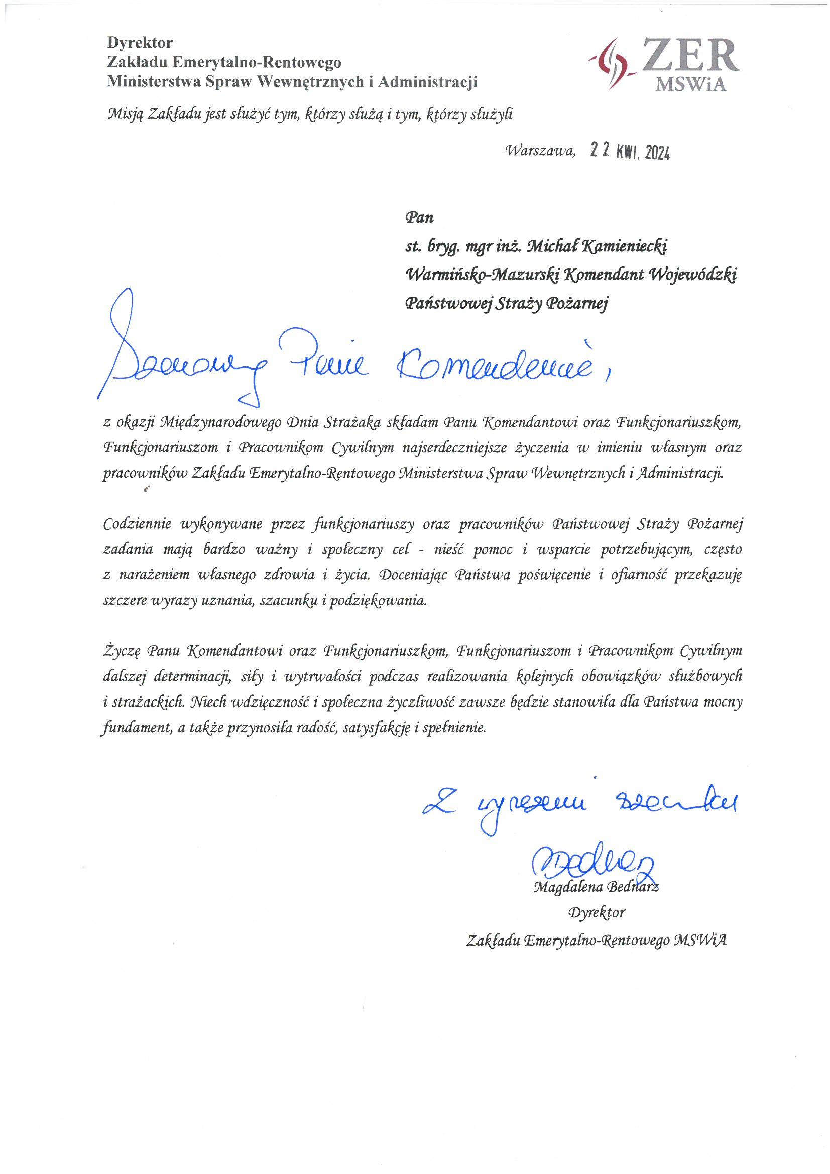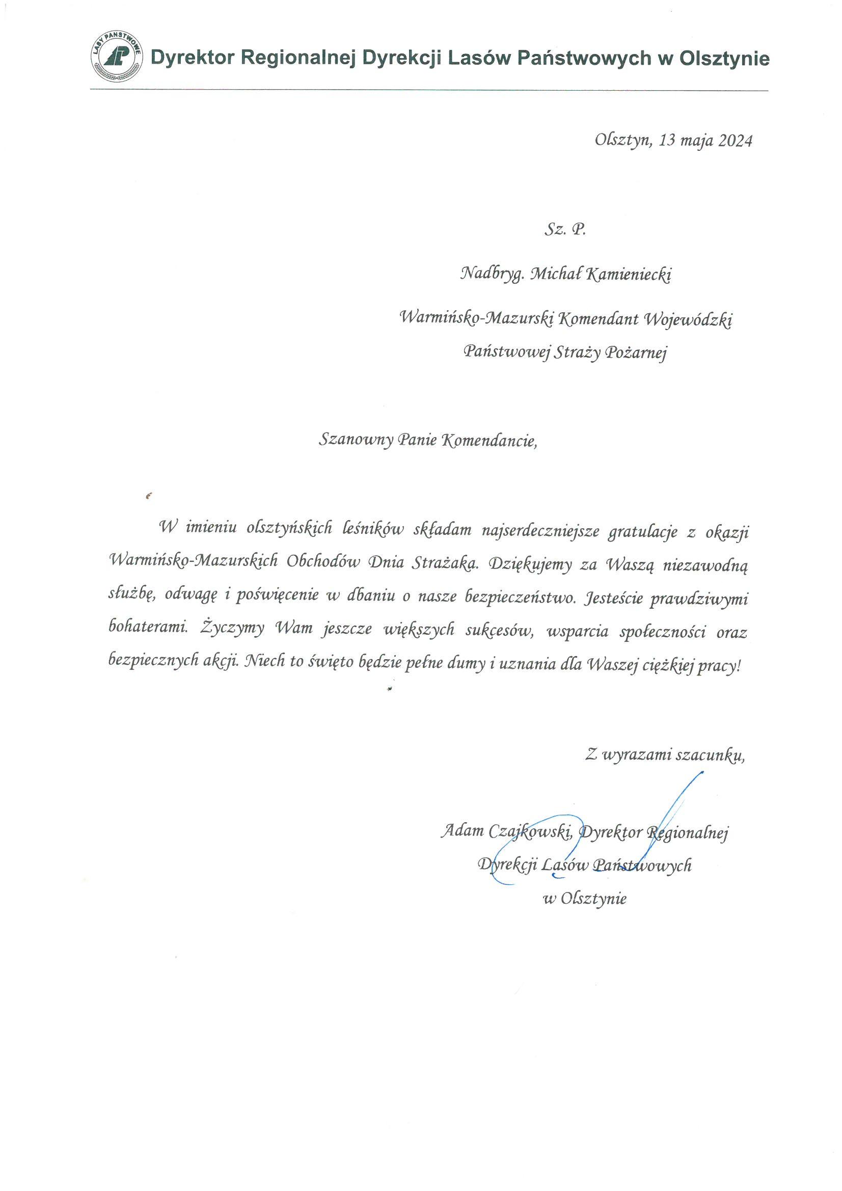Na ręce nadbryg. Michała Kamienieckiego Warmińsko-Mazurskiego Komendanta Wojewódzkiego Państwowej Straży Pożarnej napłynęły okolicznościowe listy i życzenia z okazji Dnia Strażaka, skierowane do Komendanta Wojewódzkiego PSP, funkcjonariuszy i pracowników PSP z woj. warmińsko-mazurskiego, a także do strażaków Ochotniczych Straży Pożarnych z Warmii i Mazur.