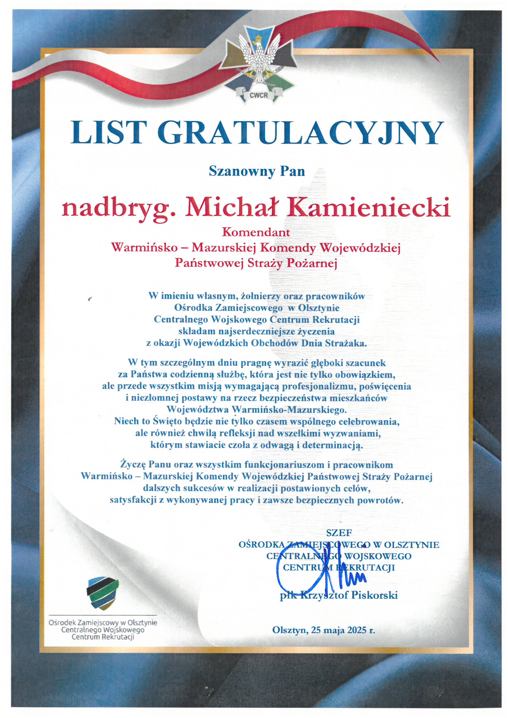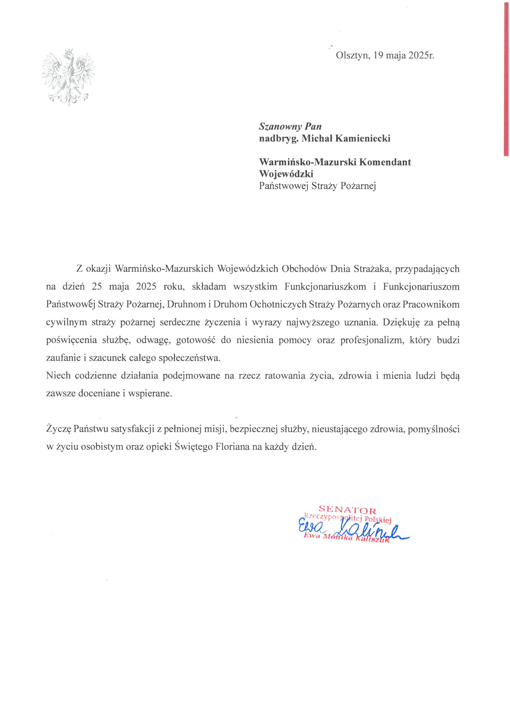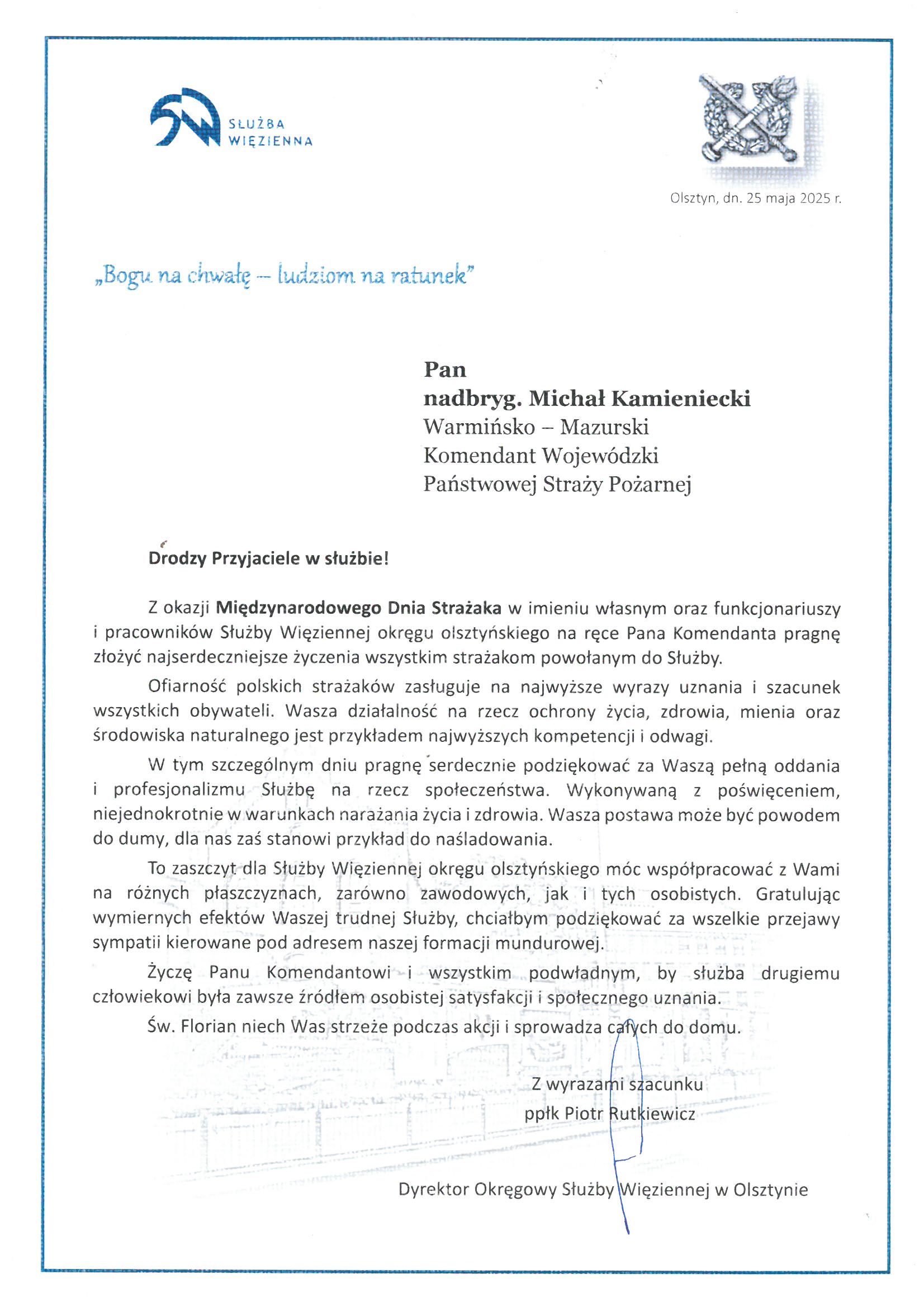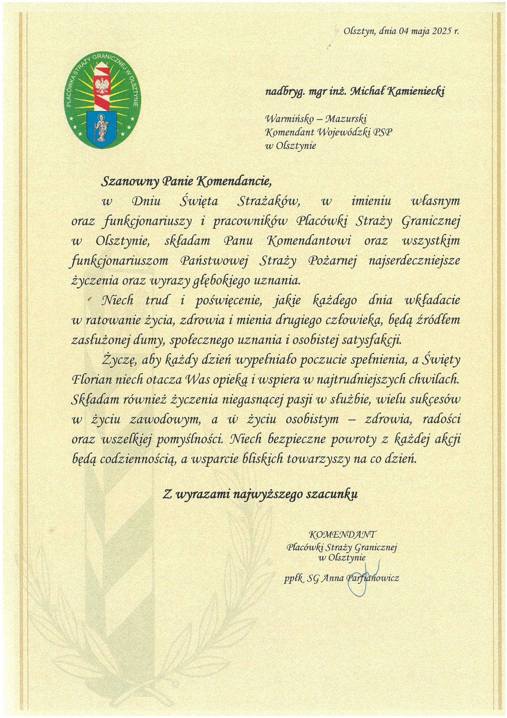 Na ręce nadbryg. Michała Kamienieckiego Warmińsko-Mazurskiego Komendanta Wojewódzkiego Państwowej Straży Pożarnej napłynęły okolicznościowe listy i życzenia z okazji Dnia Strażaka, skierowane do Komendanta Wojewódzkiego PSP, funkcjonariuszy i pracowników PSP z woj. warmińsko-mazurskiego, a także do strażaków Ochotniczych Straży Pożarnych z Warmii i Mazur.