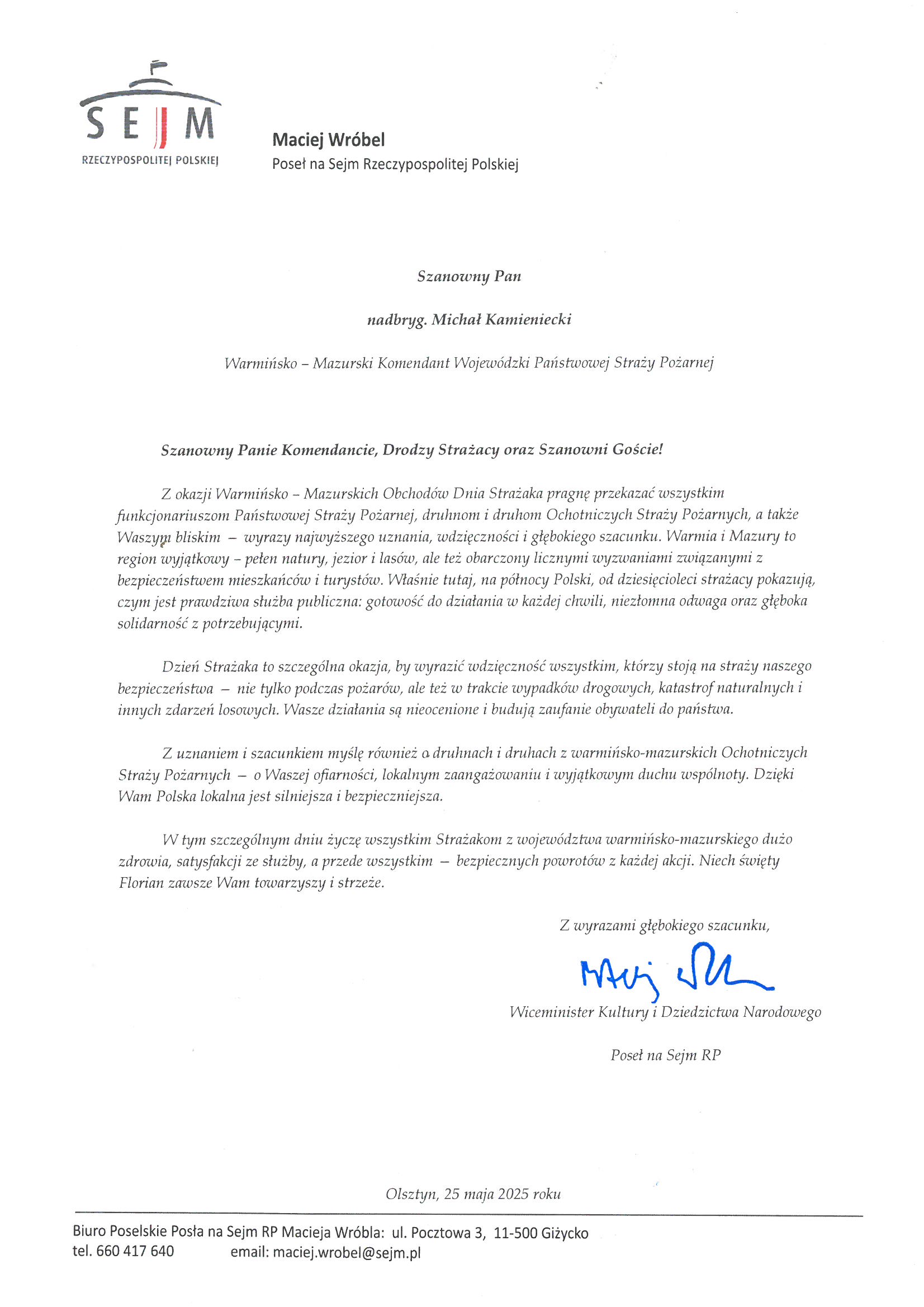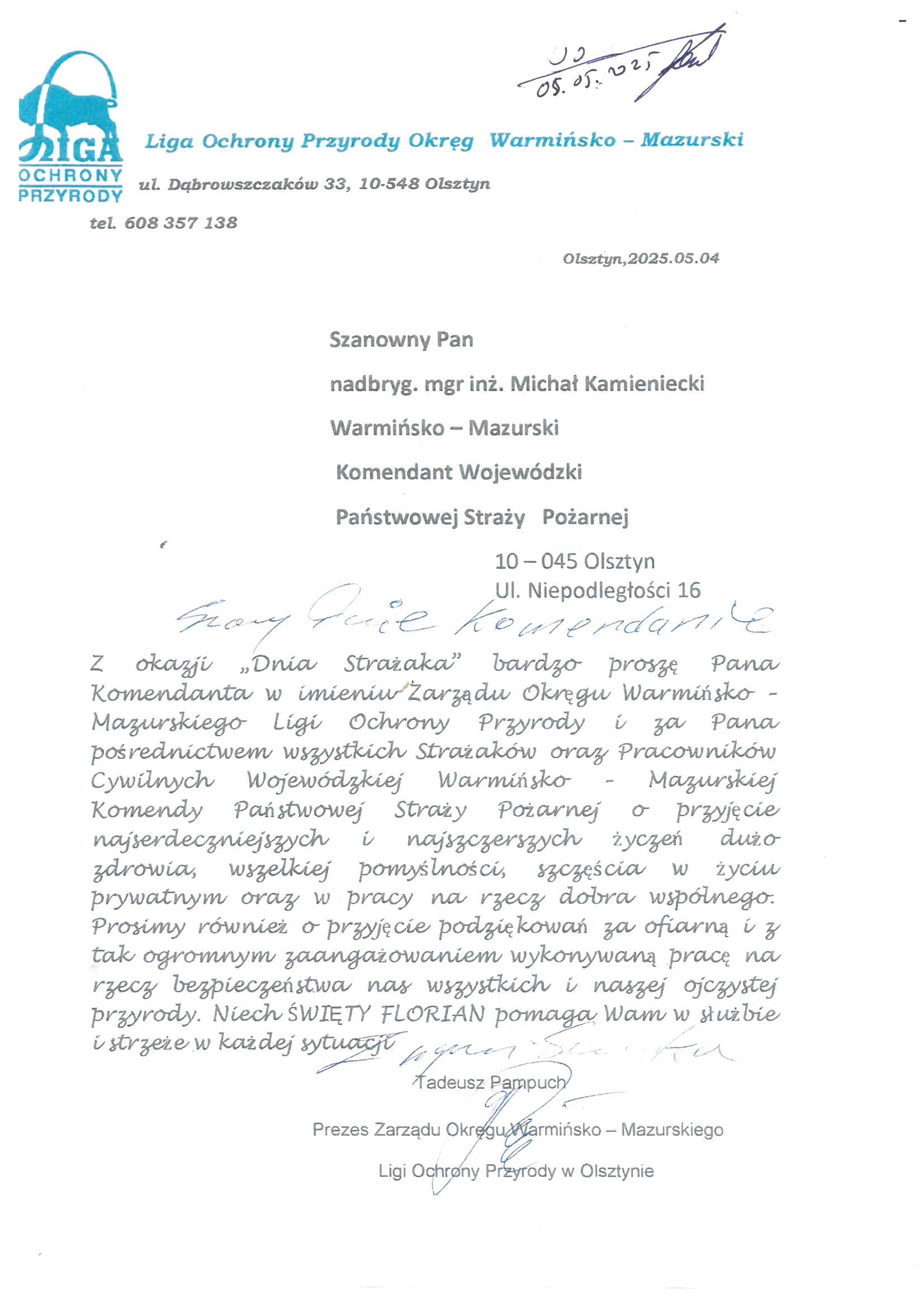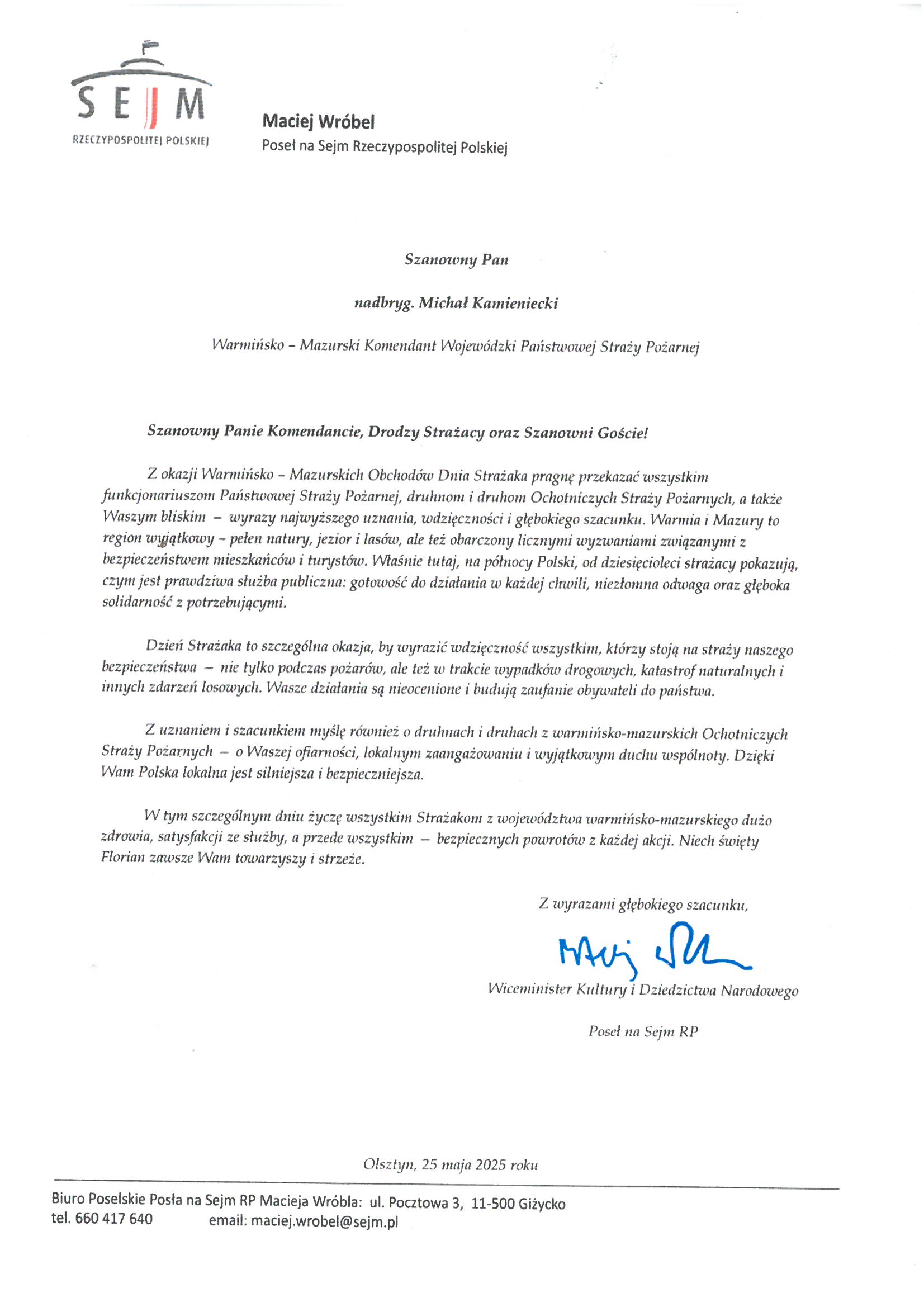 Na ręce nadbryg. Michała Kamienieckiego Warmińsko-Mazurskiego Komendanta Wojewódzkiego Państwowej Straży Pożarnej napłynęły okolicznościowe listy i życzenia z okazji Dnia Strażaka, skierowane do Komendanta Wojewódzkiego PSP, funkcjonariuszy i pracowników PSP z woj. warmińsko-mazurskiego, a także do strażaków Ochotniczych Straży Pożarnych z Warmii i Mazur.