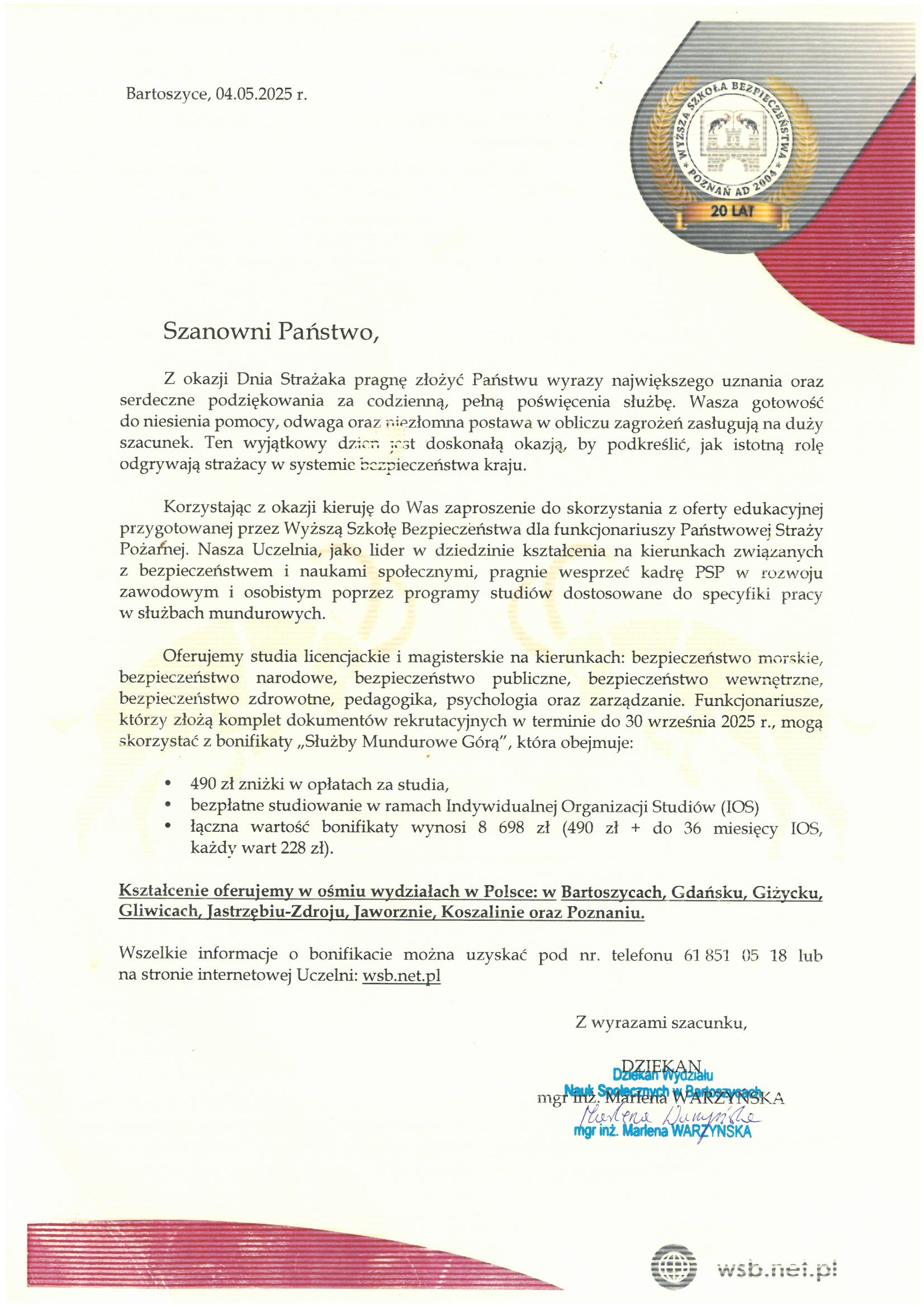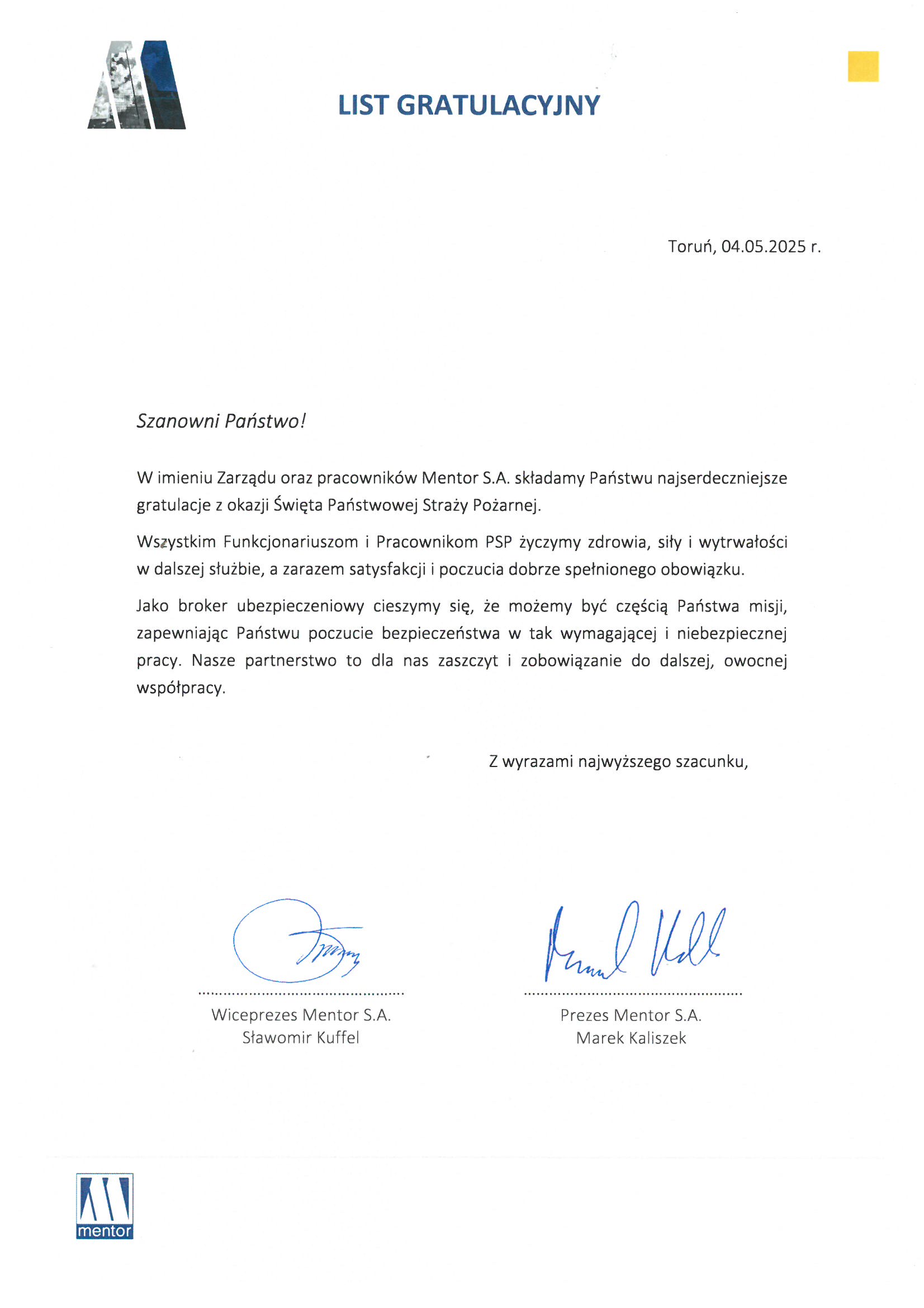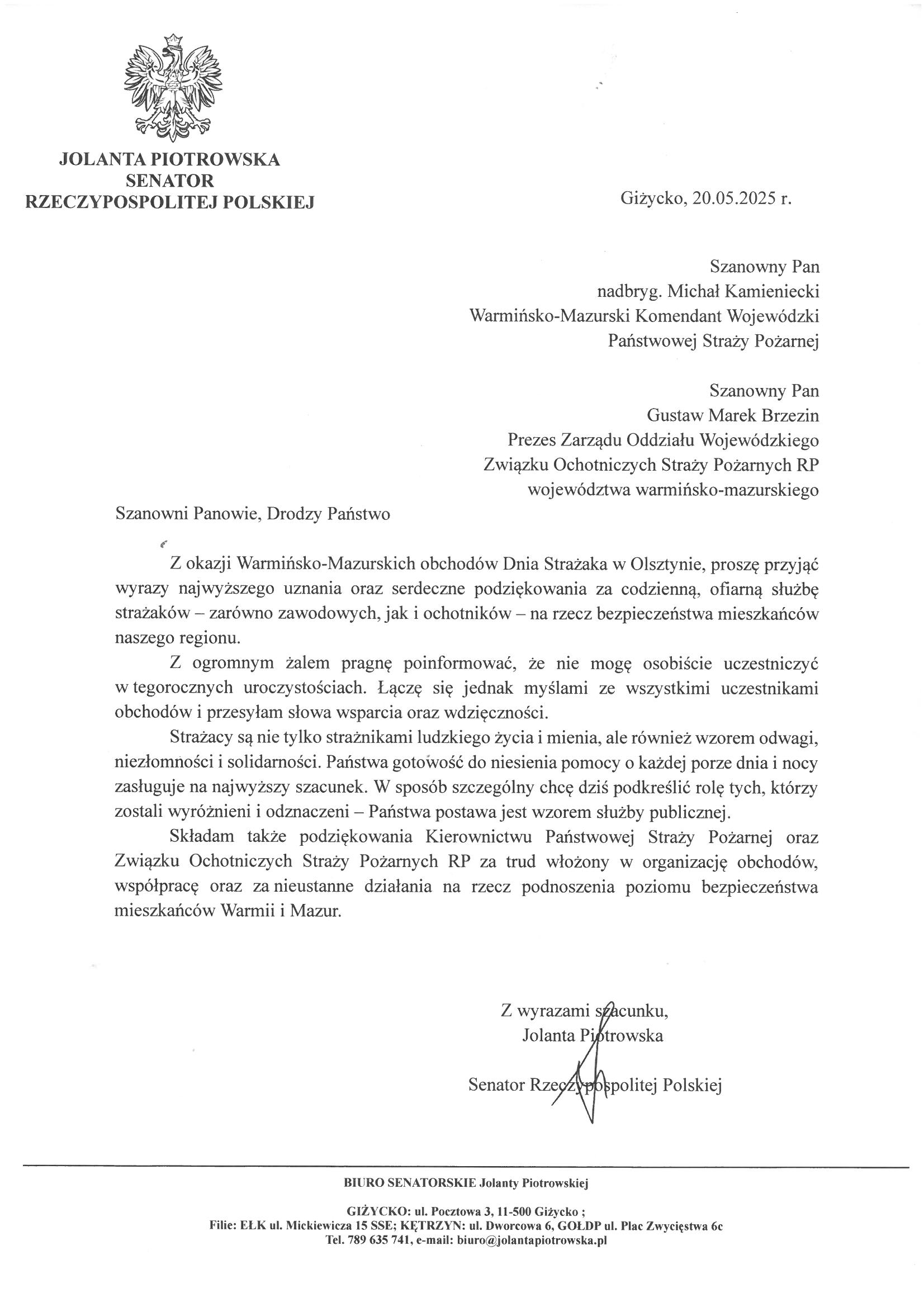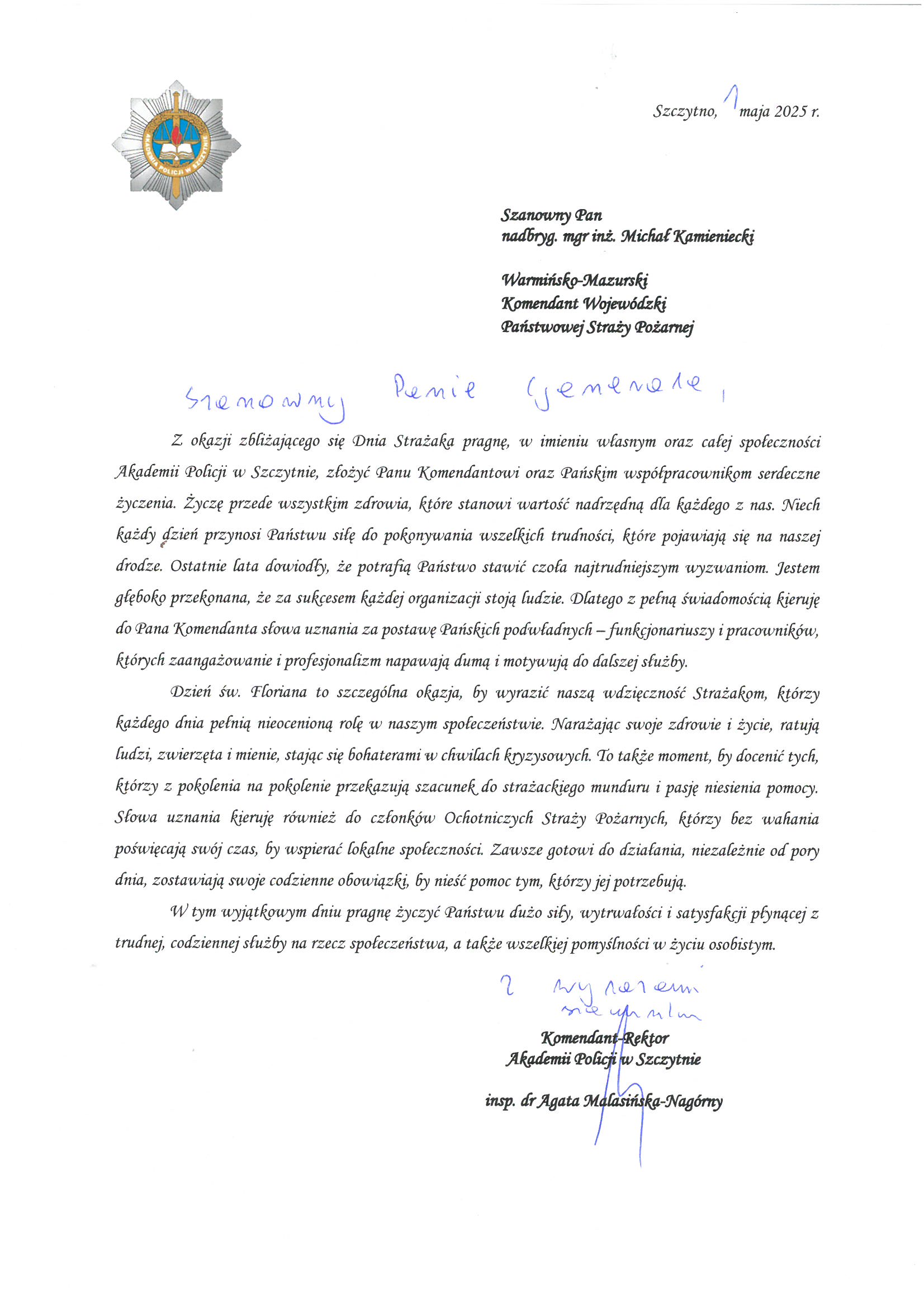 Na ręce nadbryg. Michała Kamienieckiego Warmińsko-Mazurskiego Komendanta Wojewódzkiego Państwowej Straży Pożarnej napłynęły okolicznościowe listy i życzenia z okazji Dnia Strażaka, skierowane do Komendanta Wojewódzkiego PSP, funkcjonariuszy i pracowników PSP z woj. warmińsko-mazurskiego, a także do strażaków Ochotniczych Straży Pożarnych z Warmii i Mazur.