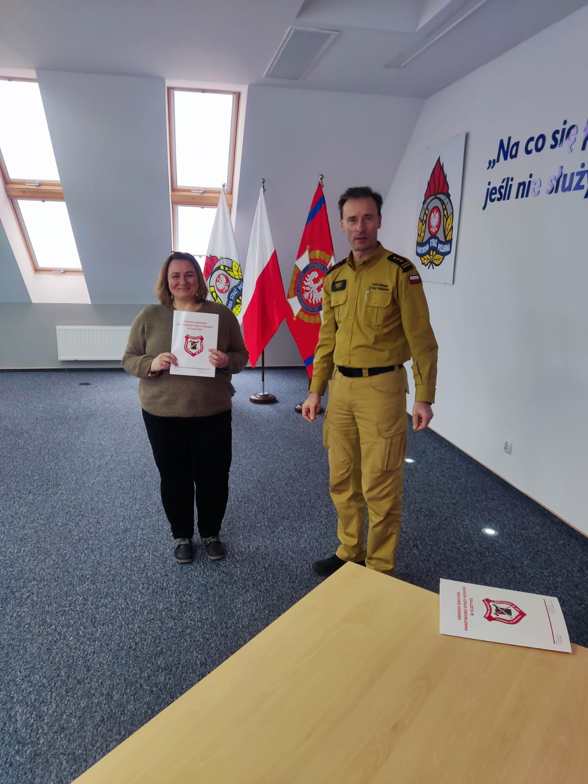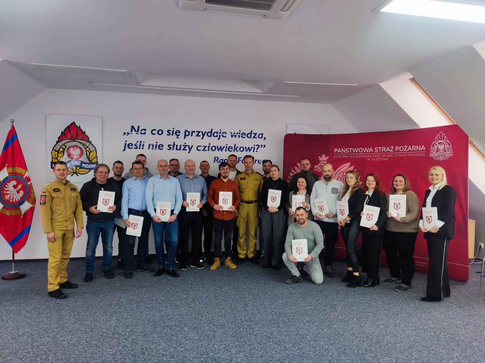 Olsztyński Ośrodek Szkolenia Komendy Wojewódzkiej Państwowej Straży Pożarnej w dniach 17 lutego do 3 marca realizował szkolenie dedykowane inspektorom ochrony przeciwpożarowej. 20 osób, które w codziennej pracy w swoich miejscach zatrudnienia zajmują się ochroną przeciwpożarową, zdobywało wiedzę teoretyczną i praktyczną. Szkolenie zakończyło się egzaminem, a świadectwa ukończenia szkolenia wręczył st. bryg. Mariusz Gęsicki Zastępca Warmińsko-Mazurskiego Komendanta Wojewódzkiego PSP w towarzystwie st. kpt. Michała Senderowskiego Zastępcy Naczelnika Ośrodka Szkolenia.