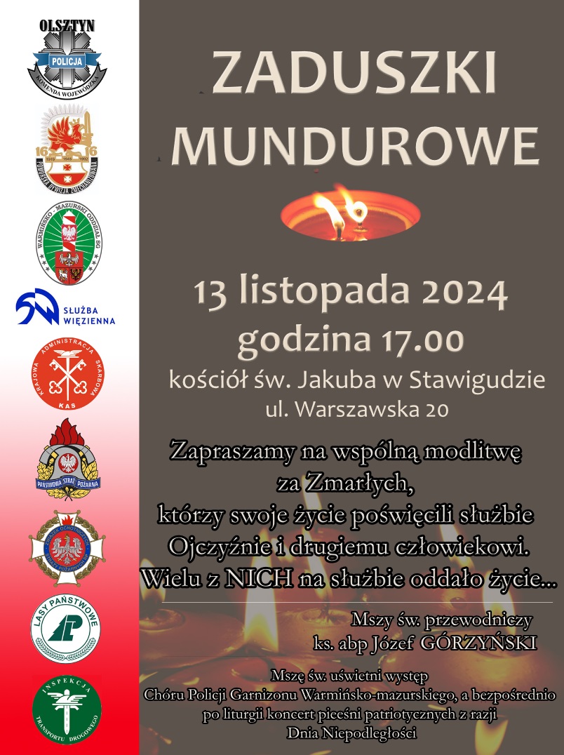 Zapraszamy na Zaduszki mundurowe 06.11.2024 Zapraszamy na wspólną modlitwę za Zmarłych. Informacja w galerii: Zdjęcia (1) Pokaż zdjęcie 1 z galerii.
