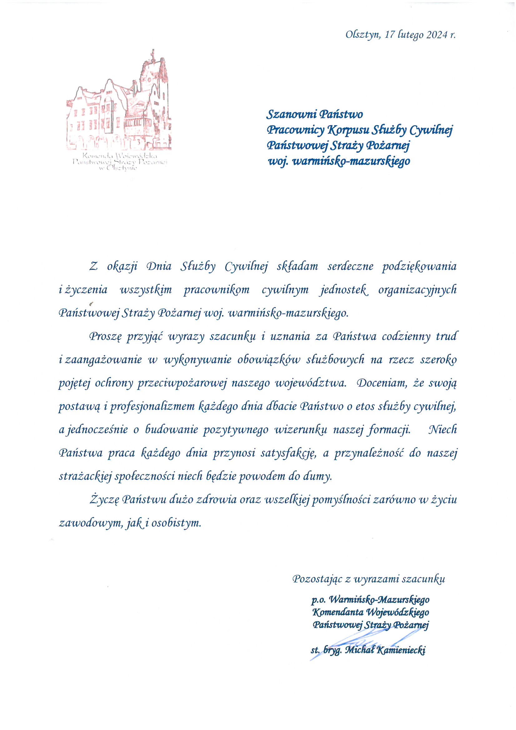 Życzenia Warmińsko-Mazurskiego Komendanta Wojewódzkiego PSP dla pracowników cywilnych z okazji pierwszych obchodów ustawowego Dnia Służby 16.02.2024 Zdjęcia (1) Pokaż zdjęcie 1 z galerii.