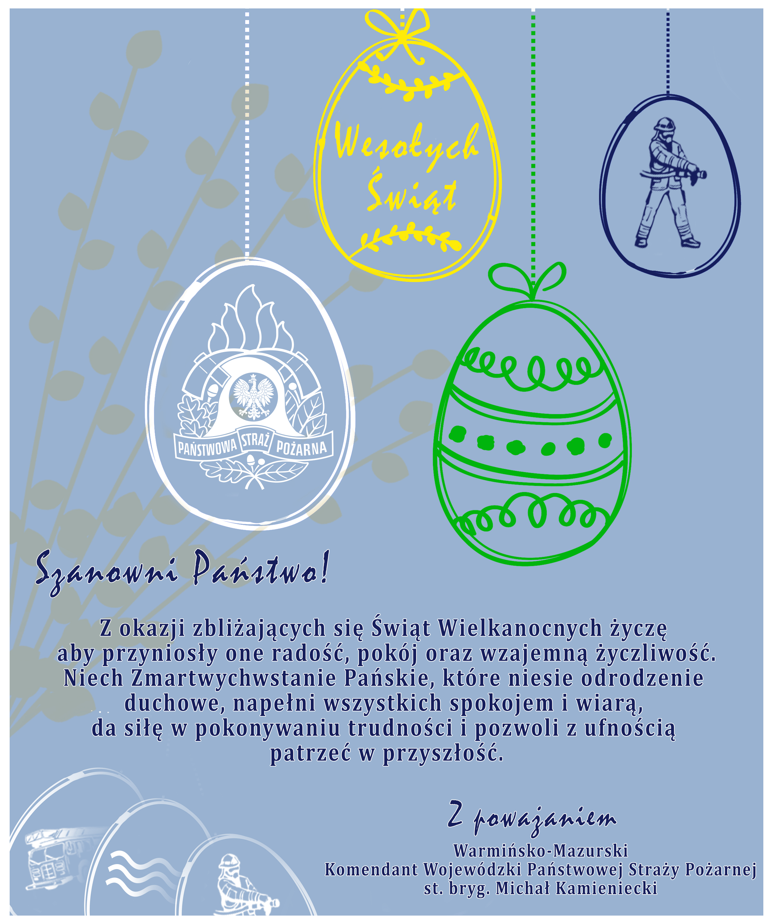 Życzenia Wielkanocne Warmińsko-Mazurskiego Komendanta Wojewódzkiego PSP 31.03.2024 Zdjęcia (1) Pokaż zdjęcie 1 z galerii.