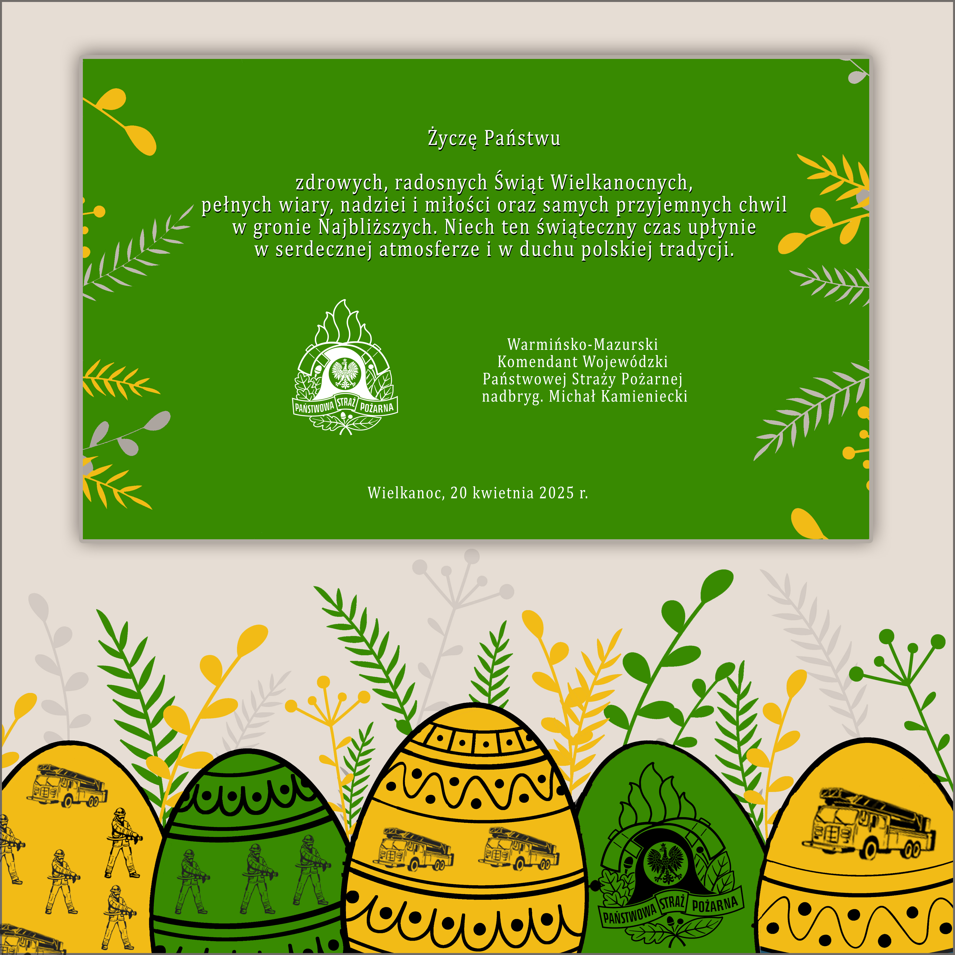 Życzenia Wielkanocne Warmińsko-Mazurskiego Komendanta Wojewódzkiego PSP 20.04.2025 Zdjęcia (1) Pokaż zdjęcie 1 z galerii.