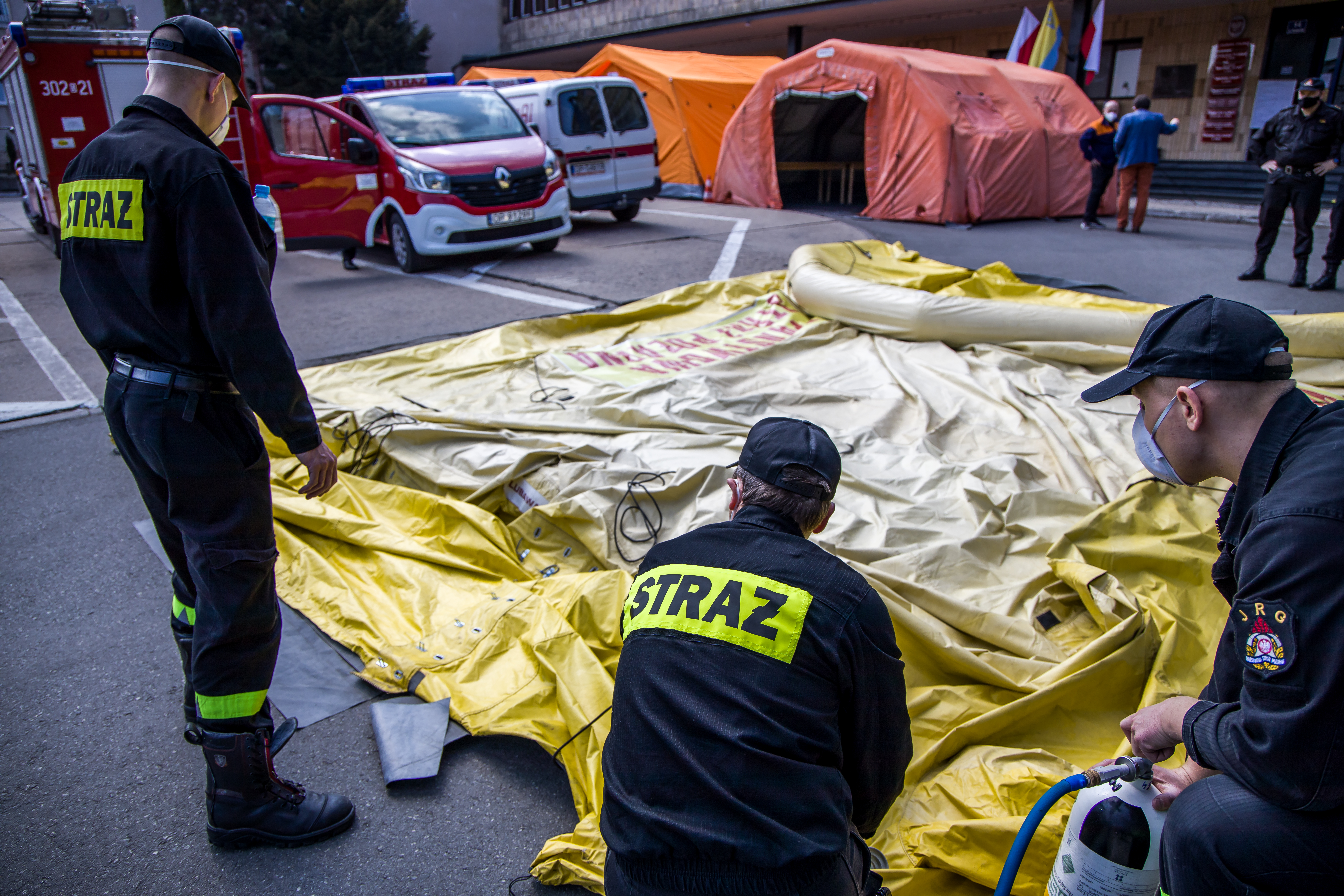 29 kwietnia br. opolscy strażacy pomagali przy budowie dwóch stelażowych namiotów. W dniu 30 kwietnia 2021 roku strażacy z komend powiatowych w Kluczborku, Krapkowicach oraz Strzelcach Opolskich wraz ze strażakami z komendy miejskiej PSP w Opolu sprawili 4 namioty pneumatyczne.
